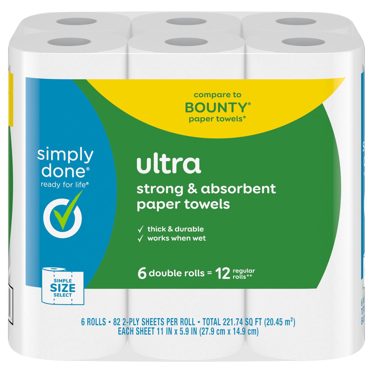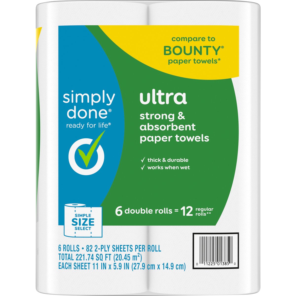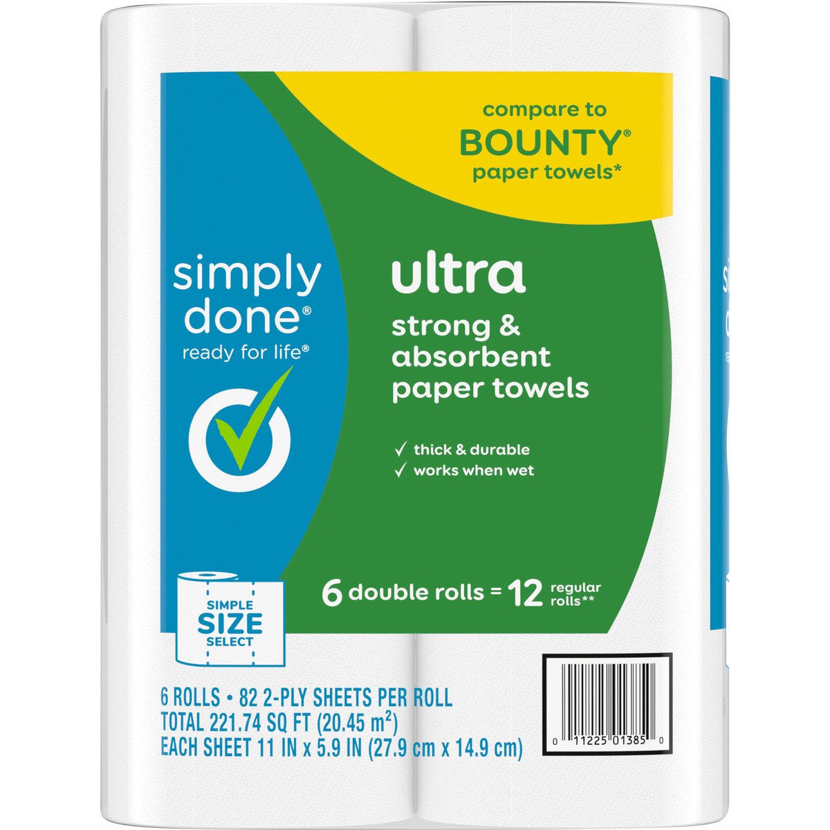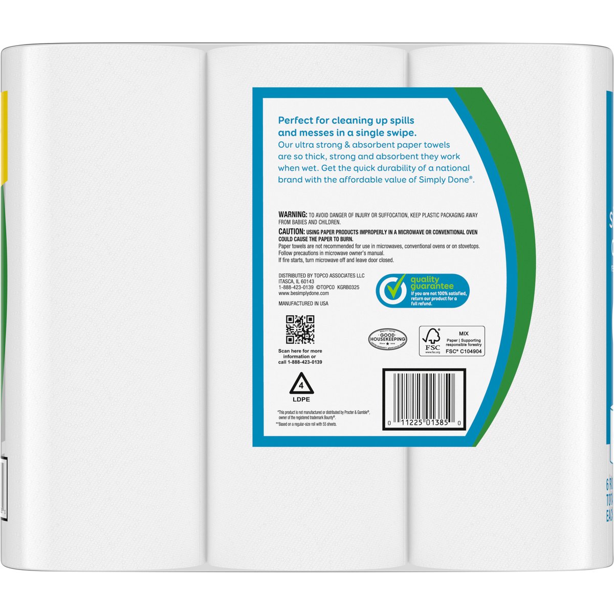 Each sheet 11 in x 5.9 in (27.9 cm x 14.9 cm). 82 2-ply sheets per roll. Total 221.74 sq ft (20.45 sq m). Ready for life. Compare to Bounty Paper Towels*. Thick & durable. Works when wet. 6 double rolls = 12 regular rolls**. Simple size select. Perfect for cleaning up spills and messes in a single swipe. Our ultra strong & absorbent paper towels are so thick, strong and absorbent they work when wet. Get the quick durability of a national brand with the affordable value of Simply Done. * This product is not manufactured or distributed by Procter & Gamble, owner of the registered trademark Bounty. ** Based on a regular-size roll with 55 sheets. Quality Guarantee: If you are not 100% satisfied, return our product for a full refund. Good Housekeeping: Since 1909. Quality tested. Limited warranty. ghseal.com for details. www.besimplydone.com. Scan for more information or call 1-888-423-0139. FSC: Mix - Paper | Supporting responsible forestry. www.fsc.org. Manufactured in USA.