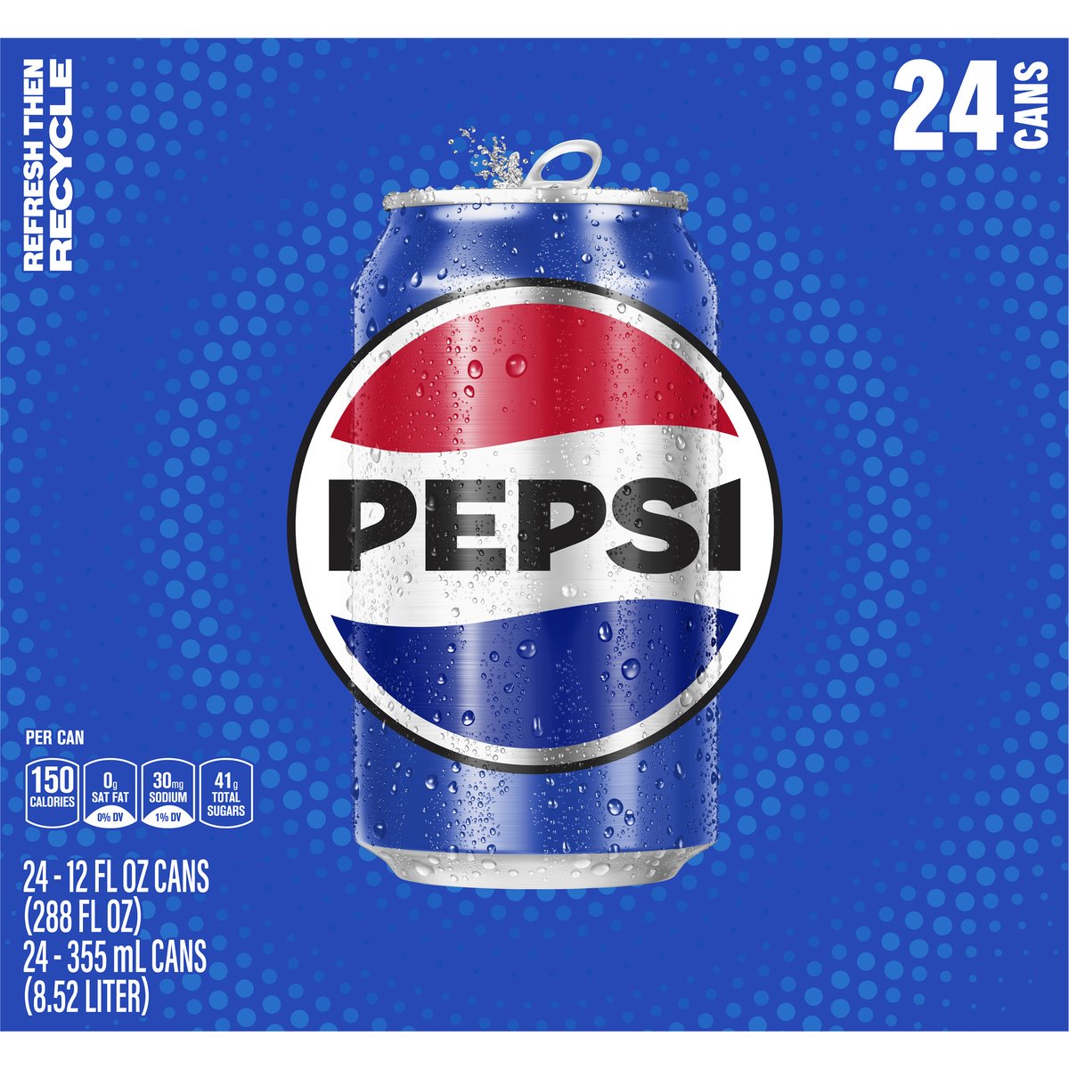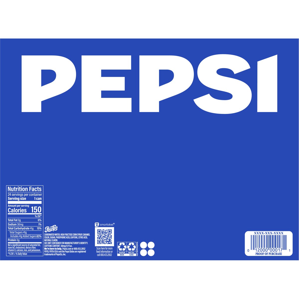 Per Can: 150 calories; 0 g sat fat (0% DV); 30 mg sodium (1% DV); 41 g total sugars. Caffeine Content: 38 mg/12 fl oz. pepsi.com. how2recycle.info. SmartLabel: Scan for more food information or call 800.433.2652. We’re here to help. Pepsi.com or 800.433.2652. Refresh then recycle