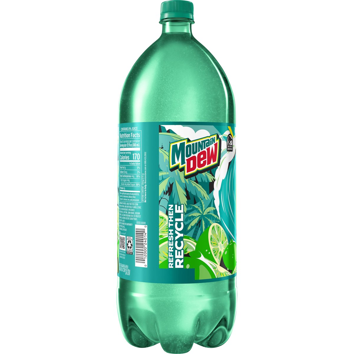 With a blast of natural and artificial tropical lime flavor. 170 calories per 12 fl oz serving. Caffeine content: 59mg/12 fl oz. how2recycle.info. MountainDew.com. SmartLabel: Scan for more food information or call 800-433-2652. We're here to help. MountainDew.com or 800.433.2652. Refresh then recycle.
