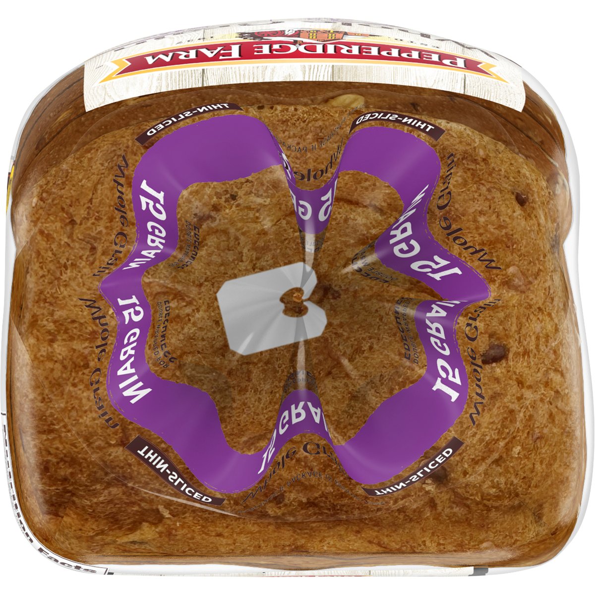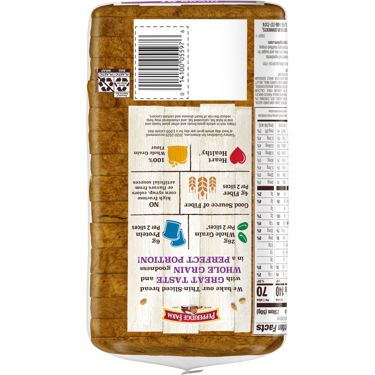 No colors or flavors from artificial sources. 70 calories per slice. Per 2 Slices: 6 g protein; 4 g fiber; 26 g whole grain. 26 g whole grain per 2 slices*. 6 g protein per 2 slices. 4 g fiber per 2 slices. * Dietary guidelines for Americans, 2020-2025 recommend at least 48 g whole grain per day for a 2,000 calorie diet. Hearty healthy (a). (a) Diets rich in whole grain foods and other plant foods and low in total fat, saturated fat, and cholesterol may help reduce the risk of heart disease and certain cancers. 100% whole grain flour. Good source of fiber. Contains bioengineered food ingredients. The ingredients from canola, corn, soy, and sugar in this product come from genetically modified crops. Learn more at pepperidgefarm.com. Estd. 1937. No high fructose corn syrup. We bake our thin-sliced bread with great taste and whole grain goodness in a perfect portion! pepperidgefarm.com. how2recycle.info. If you have any questions or comments, please call us toll free 1-888-737-7374. Double wrapped for freshness.