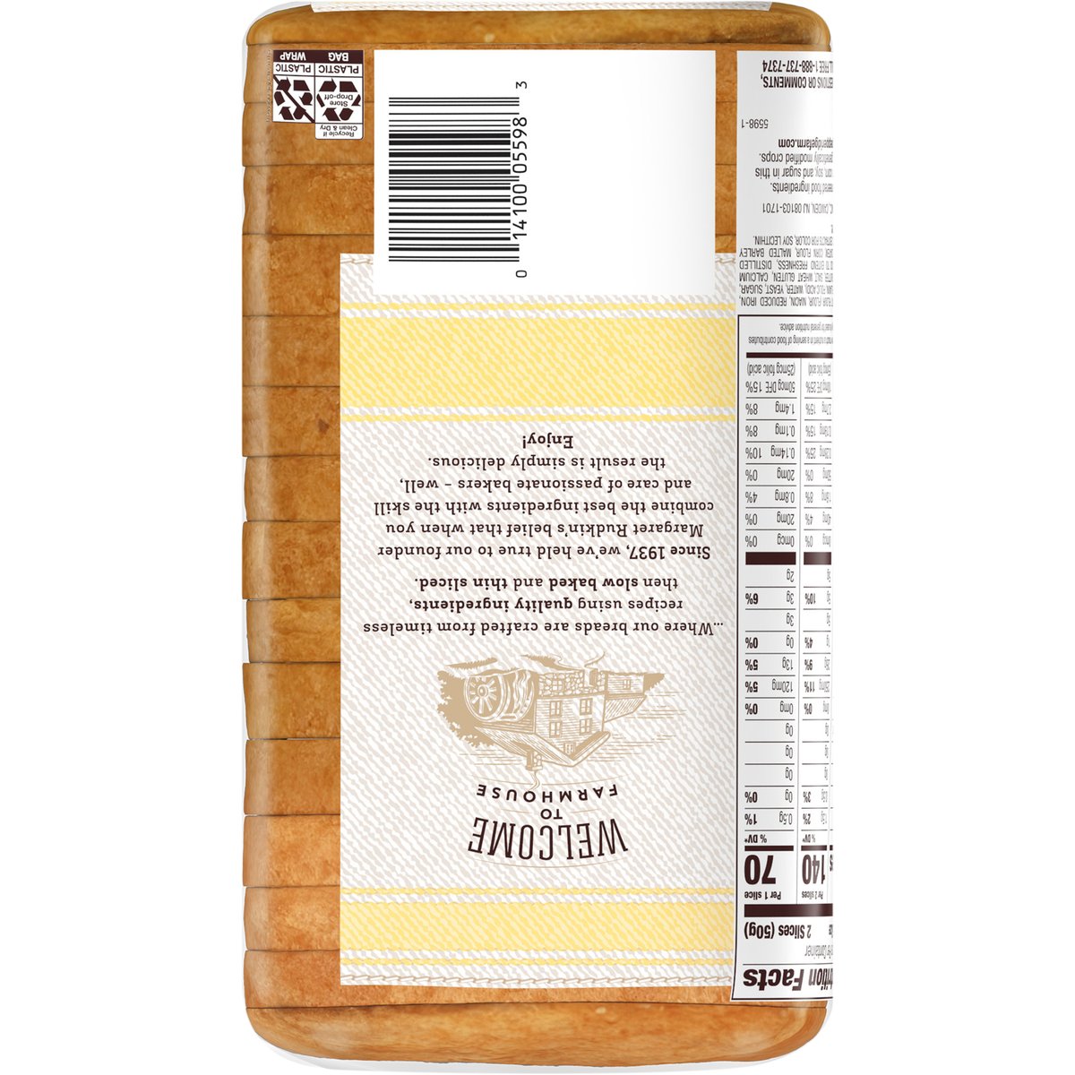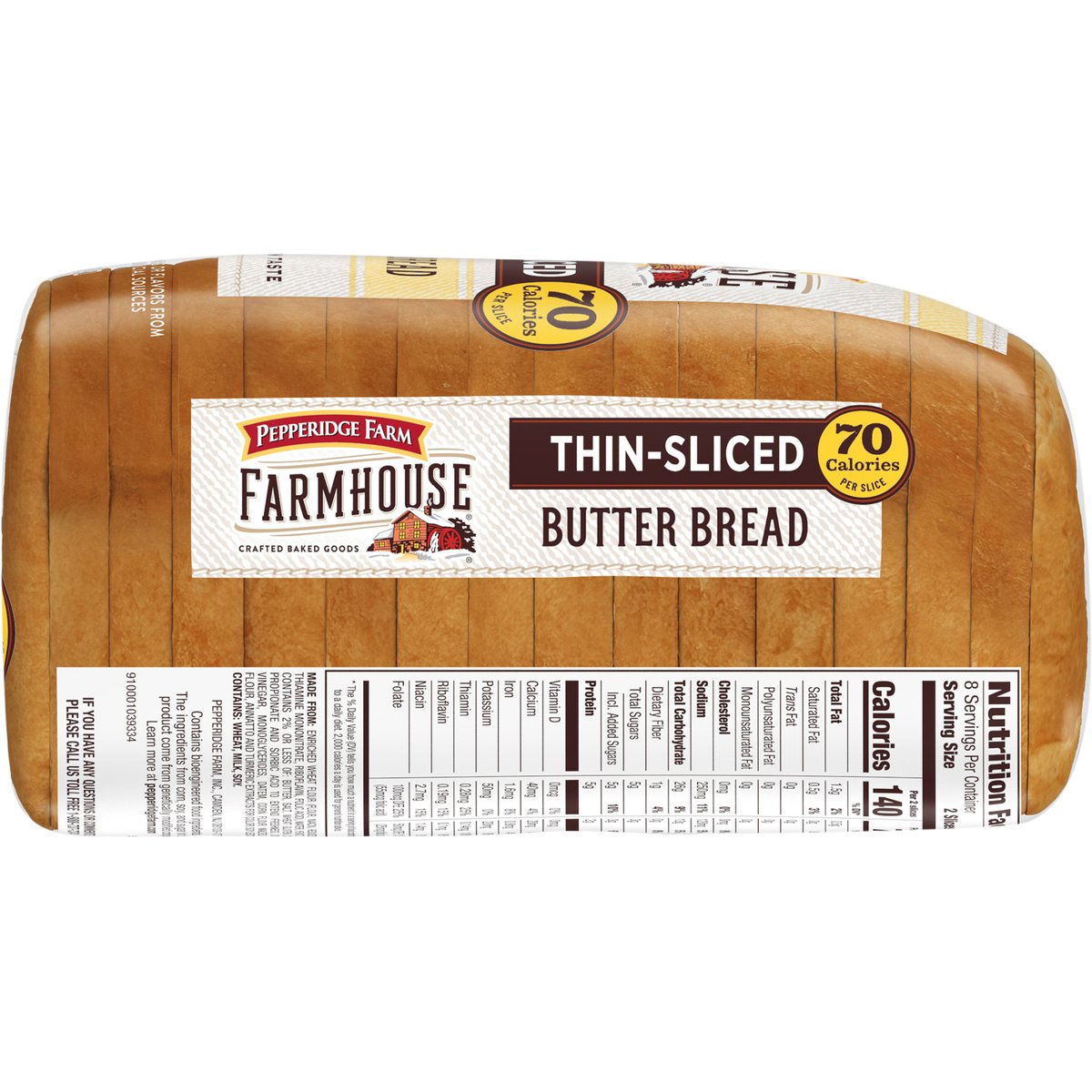 No colors or flavors from artificial sources. 70 calories per slice. Contains bioengineered food ingredients. The ingredients from corn, soy, and sugar in this product come from genetically modified crops. Learn more at pepperidgefarm.com. Crafted baked goods. Fresh from the oven taste. No high fructose corn syrup. Welcome to Farmhouse: Where our breads are crafted from timeless recipes using quality ingredients, then slow baked and thin sliced. Since 1937, we've held true to our founder Margaret Rudkin's belief that when you combine the best ingredients with the skill and care of passionate bakers - well, the result is simply delicious. Enjoy! pepperidgefarm.com. how2recycle.info. If you have any questions or comments, please call us toll free 1-888-737-7374. Double wrapped for freshness.