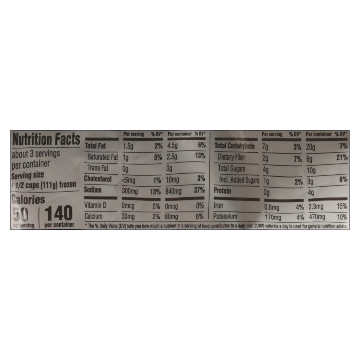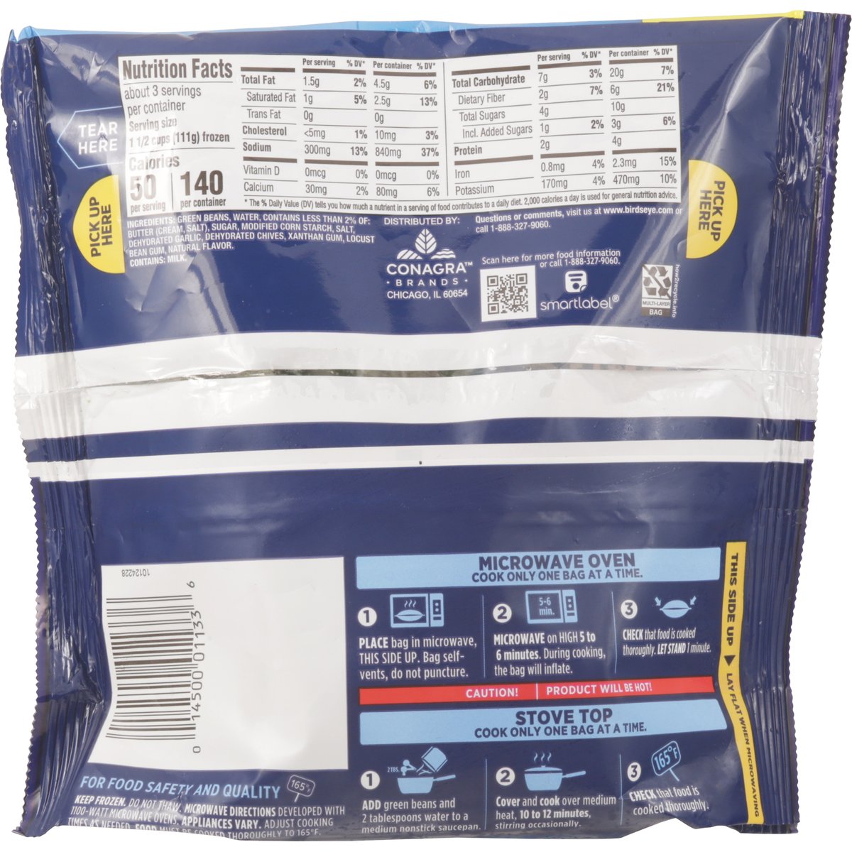 No artificial flavors. Per 1-1/2 Cups: 50 calories; 1 g sat fat (5% DV); 300 mg sodium (13% DV); 1 g added sugars (2% DV). New! Cooks in the bag. No artificial colors. No preservatives. www.birdseye.com. how2recycle.info. SmartLabel: Scan for more food information or call 1-888-327-9060. Questions or comments, visit us at www.birdseye.com or call 1-888-327-9060.