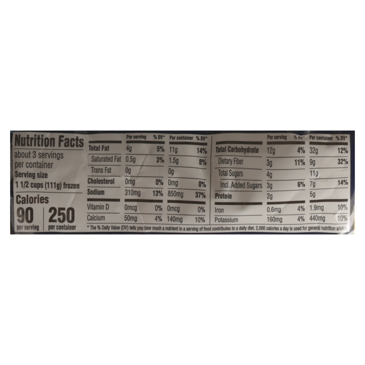 No artificial flavors. Per 1-1/2 Cups: 90 calories; 0.5 g sat fat (3% DV); 310 mg sodium (13% DV); 3 g added sugars (6% DV). New! No artificial colors. Ready in minutes. www.birdseye.com. how2recycle.info. SmartLabel: Scan for more food information or call 1-888-327-9060. Questions or comments, visit us at www.birdseye.com or call 1-888-327-9060.