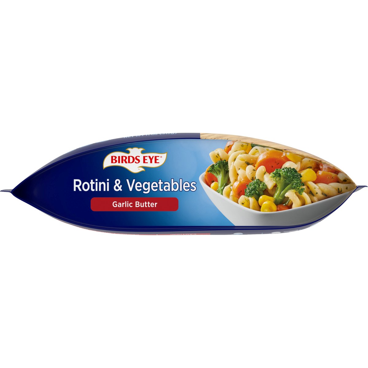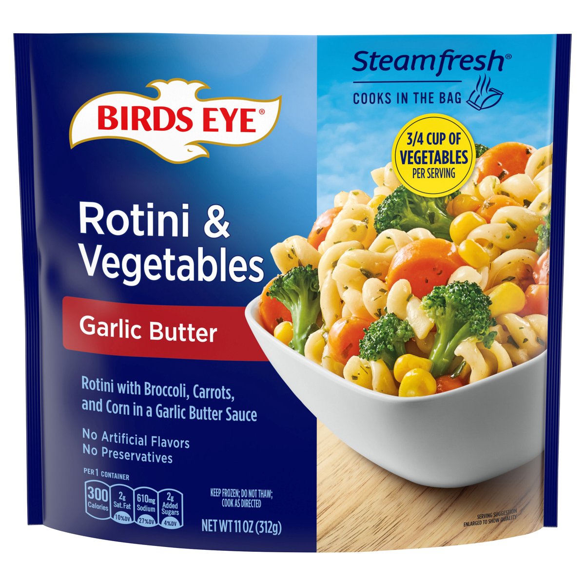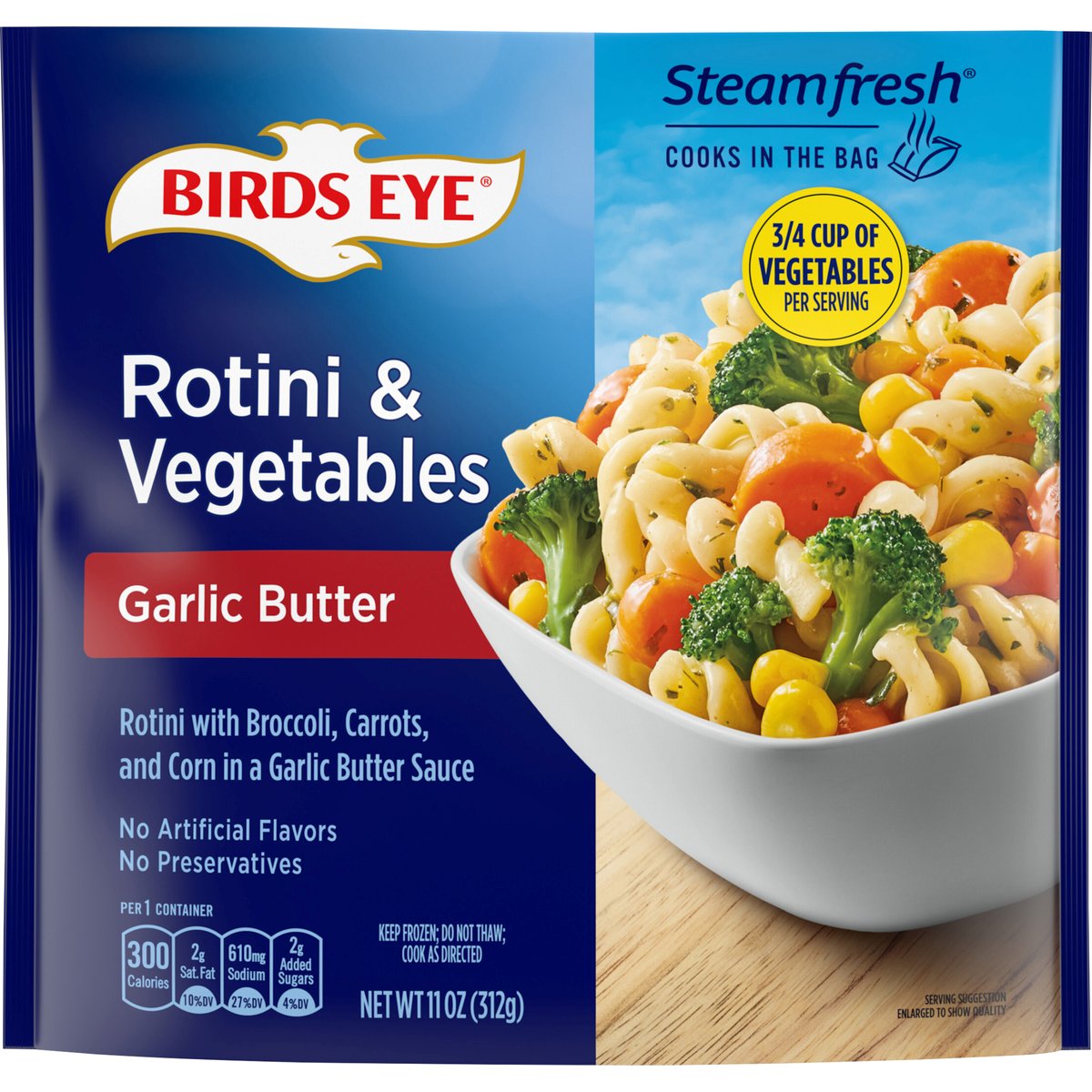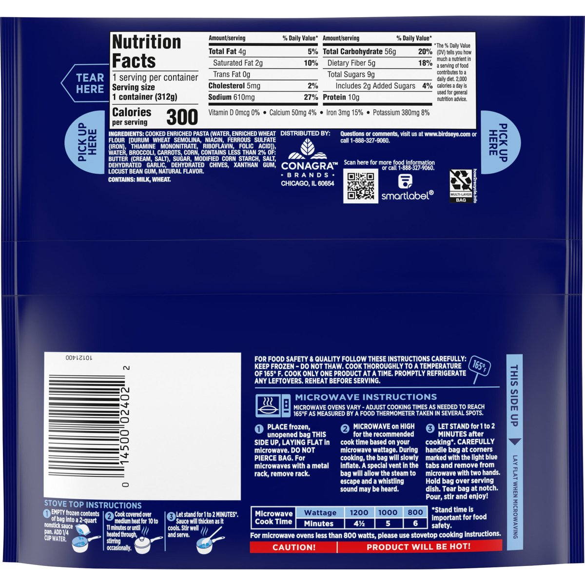 Rotini with broccoli, carrots, and corn in a garlic butter sauce. No artificial flavors. 3/4 cup of vegetables per serving. Per 1 Container: 300 calories; 2 g sat. fat (10%DV); 610 mg sodium (27%DV); 2 g added sugars (4% DV). Cooks in the bag. No preservatives. www.birdseye.com. how2recycle.info. SmartLabel: Scan for more food information or call 1-888-327-9060. Questions or comments, visit us at www.birdseye.com or call 1-888-327-9060.