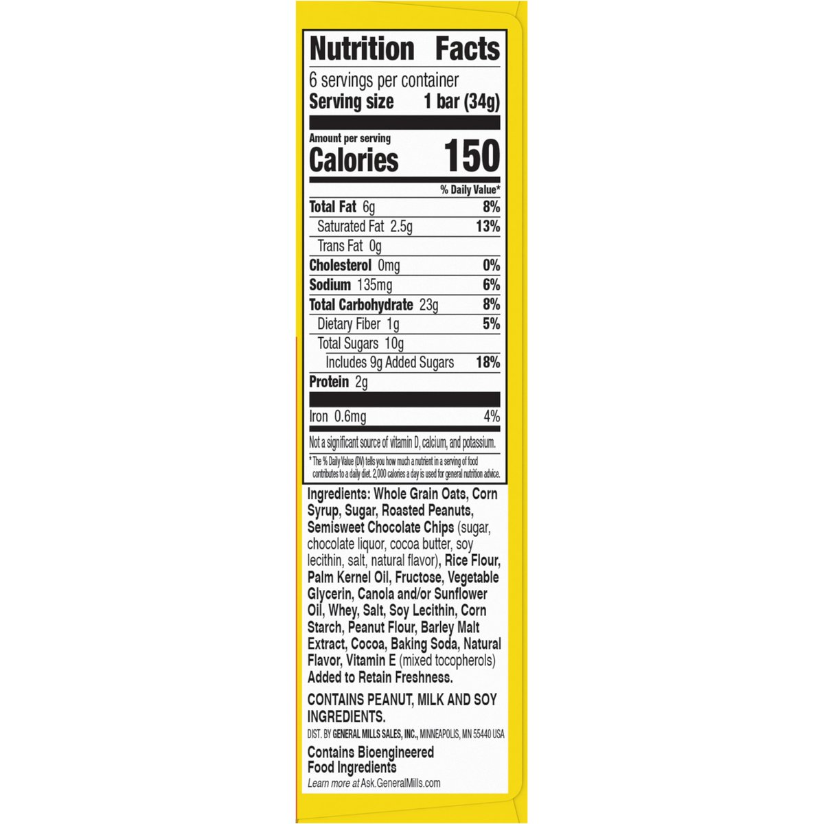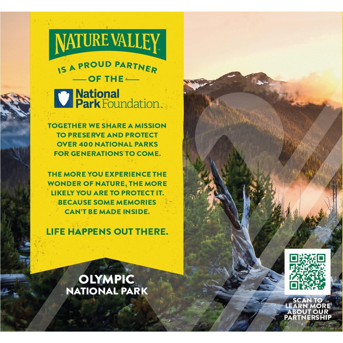 Peanuts, chocolate chips, and caramel flavor dipped and drizzled in a caramel flavored coating. No artificial flavors. Per Bar: 150 calories; 2.5 g sat fat (13% DV): 135 mg sodium (6% DV); 9 g added sugars (18% DV). Contains bioengineered food ingredients. Learn more at Ask.GeneralMills.com. New. Olympic national park. No artificial colors. No high fructose corn syrup. Loaded with roasted peanuts. how2recycle.info. generalmills.com. Scan to learn more about our partnership. We welcome your questions and comments generalmills.com. 1.800.231.0308. Nature Valley is a proud partner of the National Park Foundation: Together we share a mission to preserve and protect over 400 National Parks for generations to come. The more you experience the wonder of nature, the more likely you are to protect it. Because some memories can't be made inside. Life happens out there. Olympic National Park. Box for Education: Download the app. Scan your receipt. Earn cash for school. Certified 100% recycled paperboard. Carbohydrate Choices: 1 1/2.
