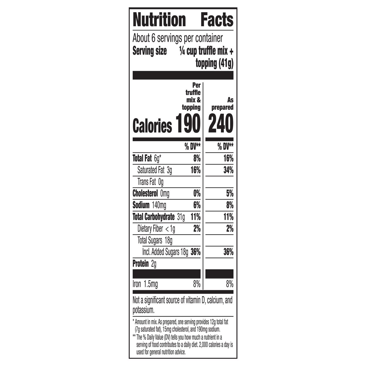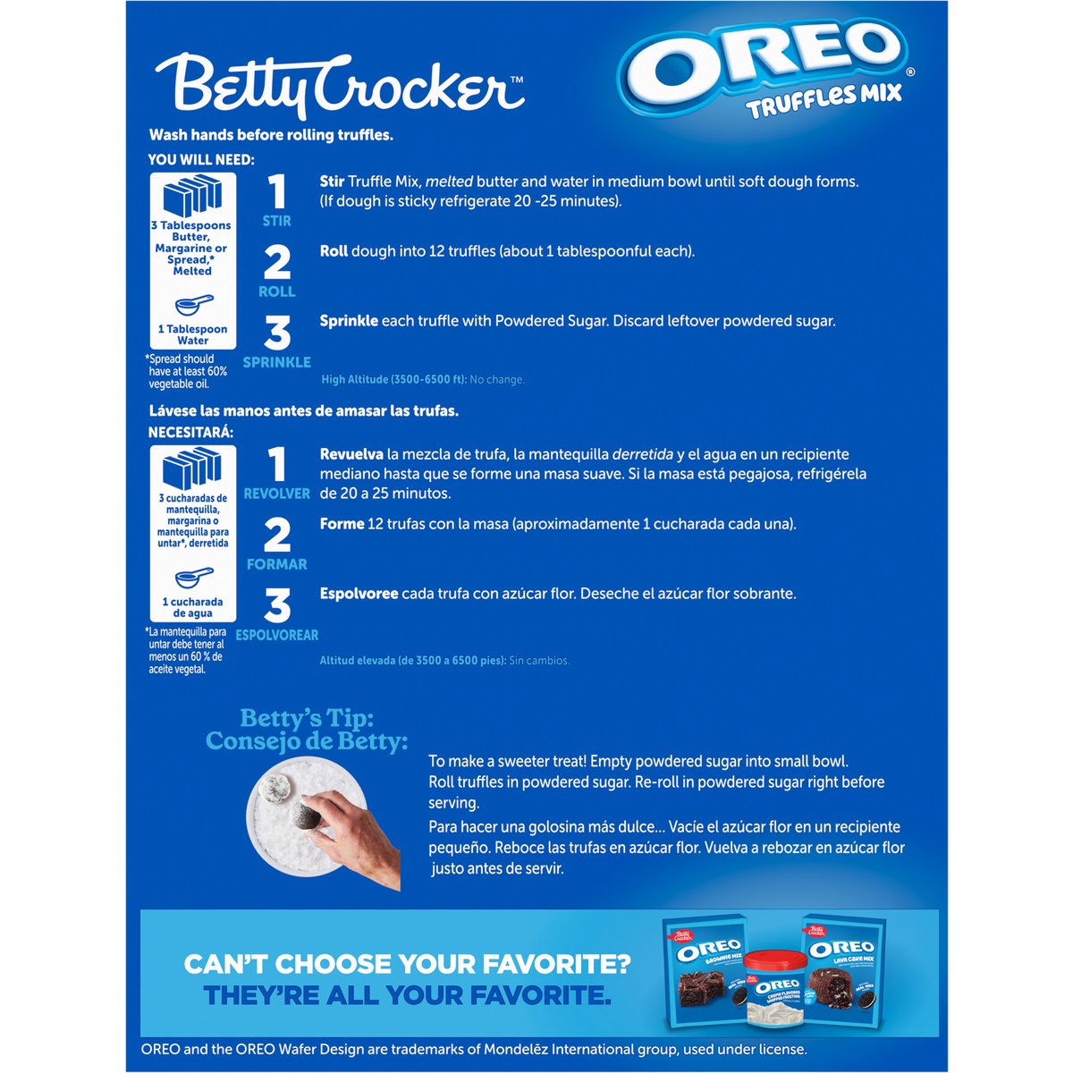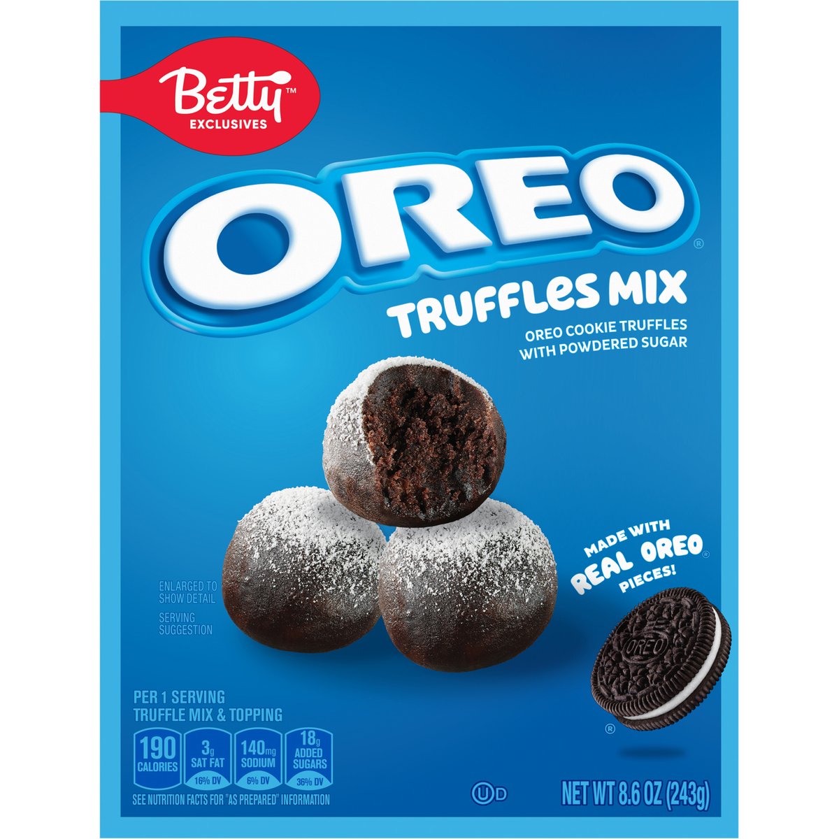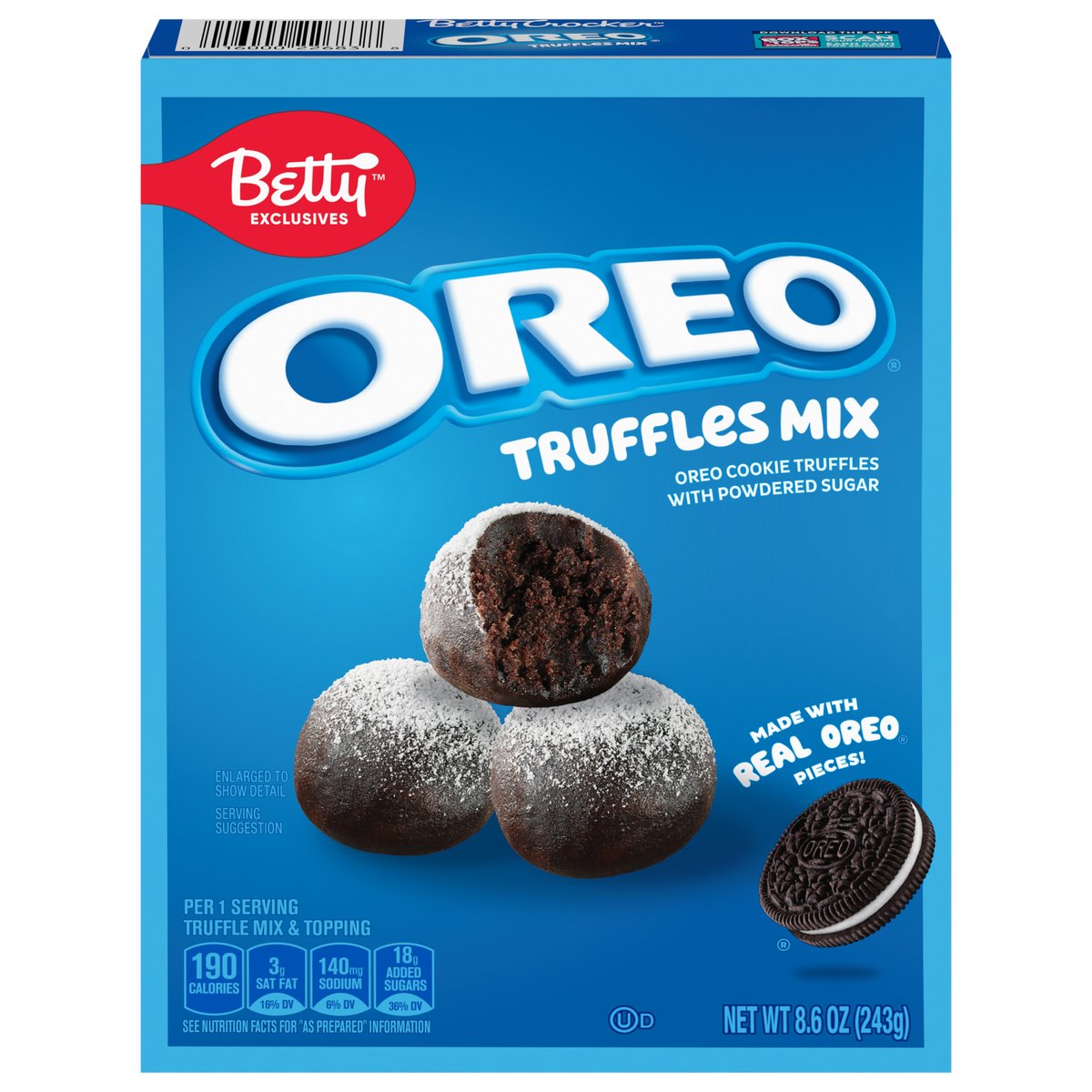 Oreo cookie truffles with powdered sugar. Per 1 Serving Truffle Mix & Topping: 190 calories; 3 g sat fat (16% DV); 140 mg sodium (6% DV); 18 g added sugars (36% DV). See nutrition facts for "as prepared" information. Contains bioengineered food ingredients. Learn more at Ask.generalmills.com. Betty exclusive. This package is sold by weight, not by volume. You can be assured of proper weight even through some setting of contents normally occurs during shipment and handling. Betty's Promise: With over a century of inspiring makers across the world, Betty Crocker encourages and empowers everyone - no matter their skill level, gender or age - to share in the joy of homemade. From Betty's test kitchens to yours, we promise great taste, quality and convenience. This is a product you and your family will enjoy. We guarantee it. 1-800-828-3291. Bettycrocker.com. The Red Spoon Promise by Betty Crocker. how2recycle.info. Bettycrocker.com. Ask.generalmills.com. Follow us fo rmore great baking ideas! Instagram @bettycroker. 1-800-828-3291. Box Tops for Education: Download the App. Scan your receipt. Earn cash for schools. Can't choose your favorite? They're all your favorite. Brownie Mix. Cremed Flavored Whipped frosting. Lava Cake Mix.