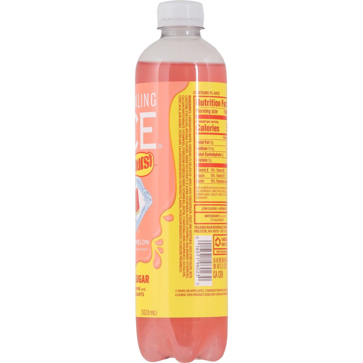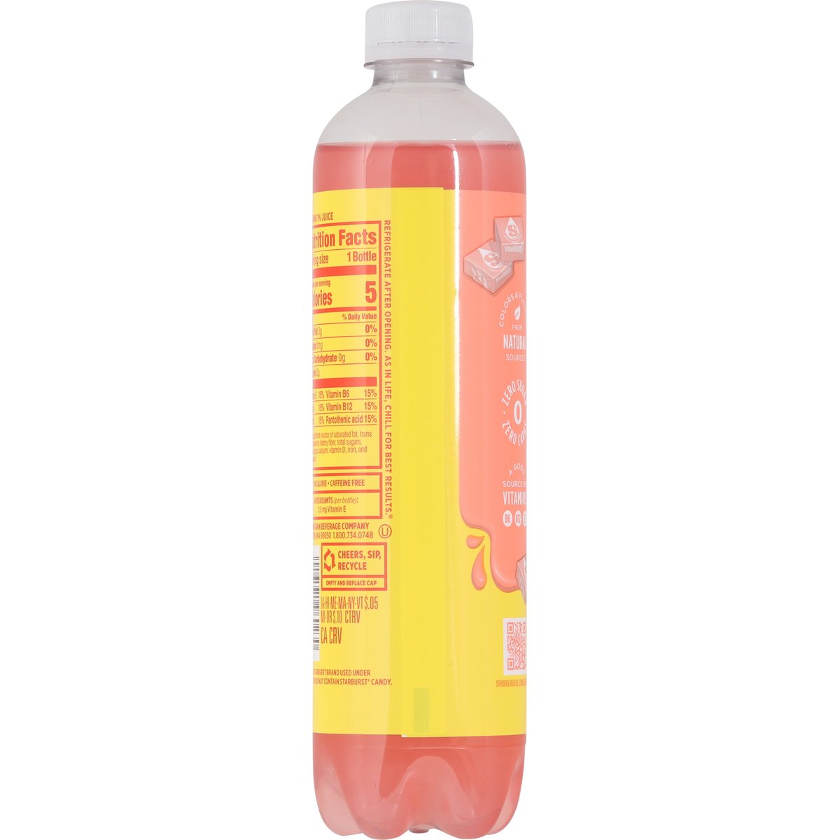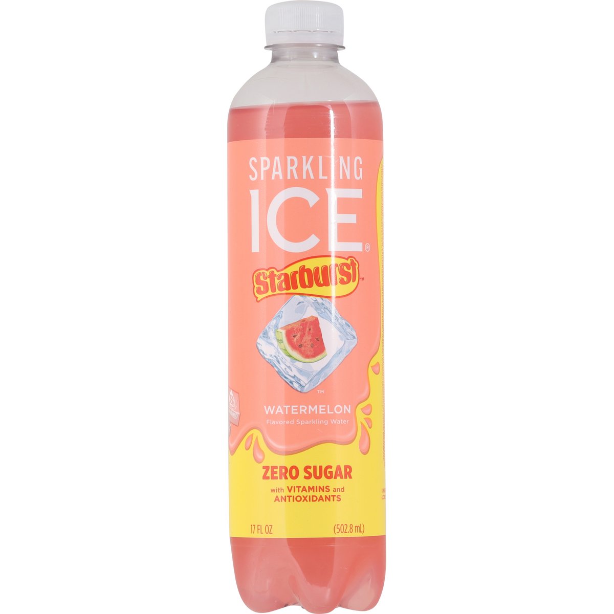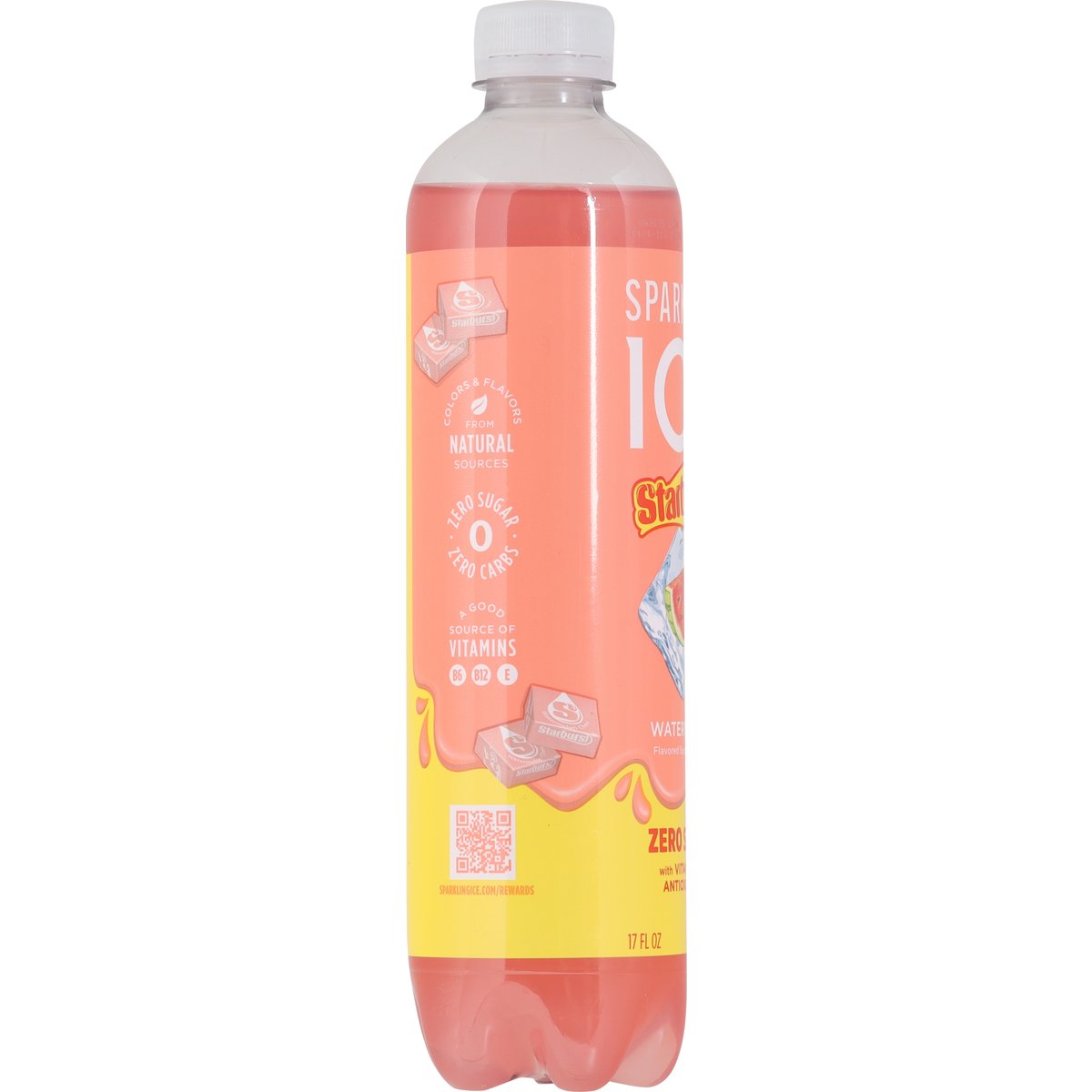 Flavored sparkling water. Colors & flavors from natural sources. Zero sugar. With vitamins and antioxidants. Low calorie. Caffeine free. Antioxidants (Per Bottle): 2.5 mg vitamin E. Zero carbs. A good source of vitamins B6, B12, E. This product does not contain Starburst candy. sparklingice.com/rewards. 1.800.734.0748. Cheers, sip, recycle. Empty and replace cap.