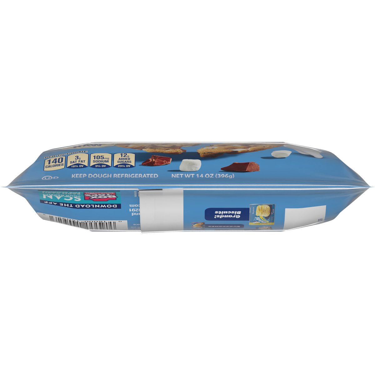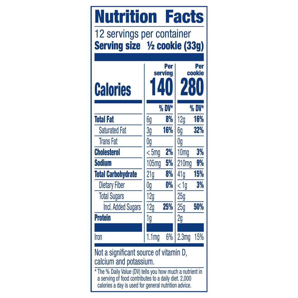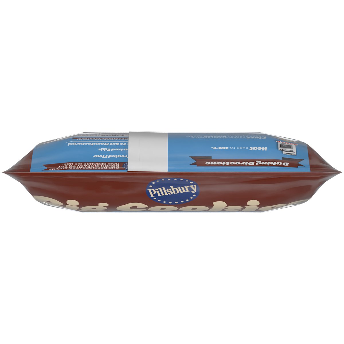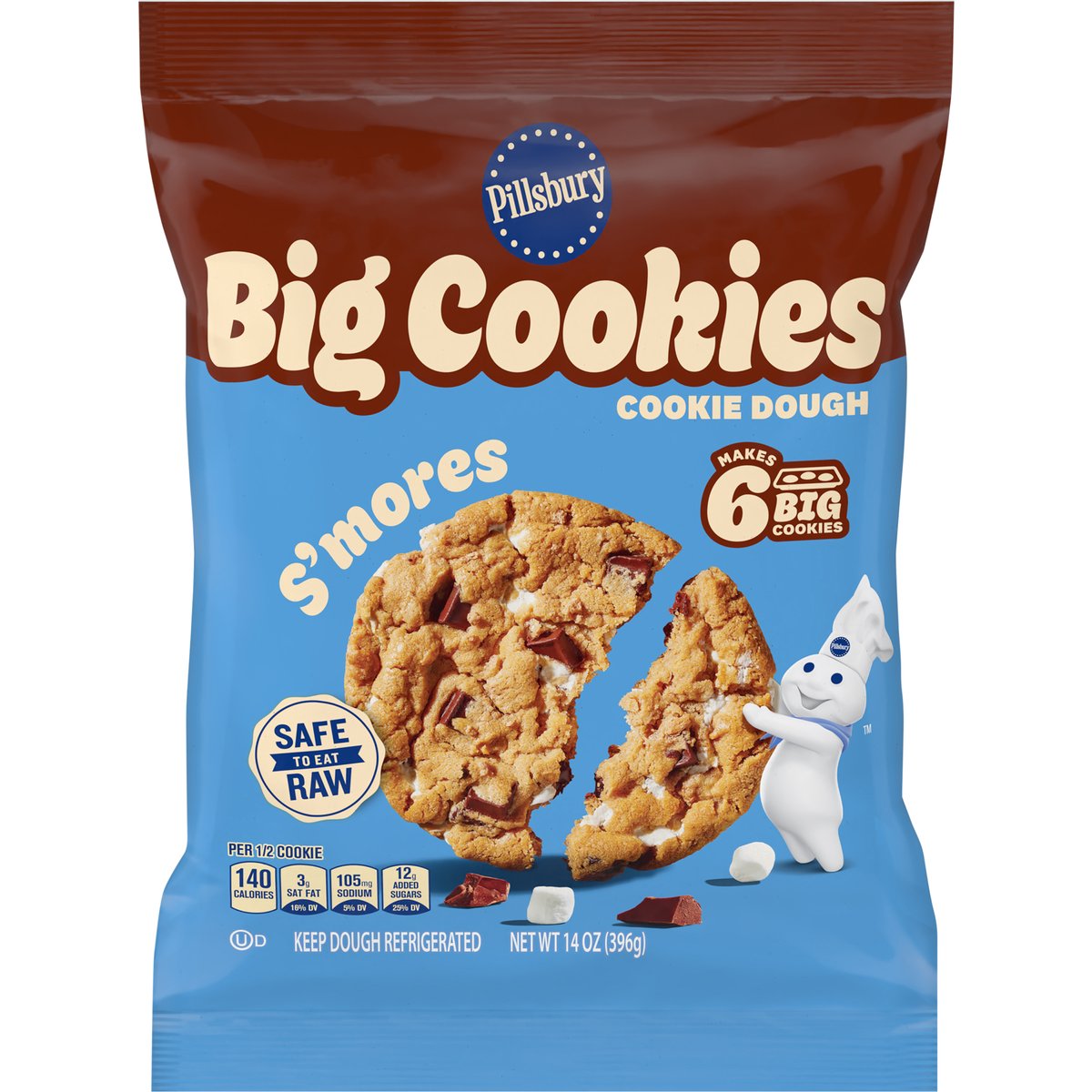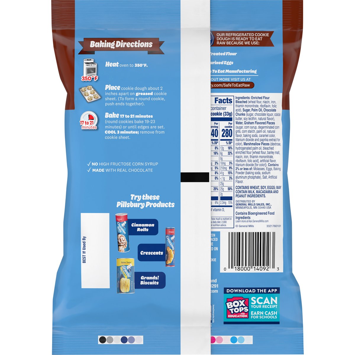 Per 1/2 Cookie: 140 calories; 3 g sat fat (16% DV); 105 mg sodium (5% DV); 12 g added sugars (25% DV). Contains bioengineered food ingredients. Learn more at Ask.GeneralMills.com. Makes 6 big cookies. Safe to eat raw. Out refrigerated cookie dough is ready to eat raw because we use: Heat treated flour. Pasteurized eggs. Ready to eat manufacturing. No high fructose corn syrup. pillsbury.com/SafeToEatRaw. www.pillsbury.com. Ask.GeneralMills.com. To find out more visit us at pillsbury.com/SafeToEatRaw. Questions? Save package and call 1-800-828-3291; www.pillsbury.com. Box Tops for Education: Download the app. Scan your receipt. Earn cash for schools. Try these Pillsbury Product: Cinnamon Rolls; Crescents; Grands! Biscuits.