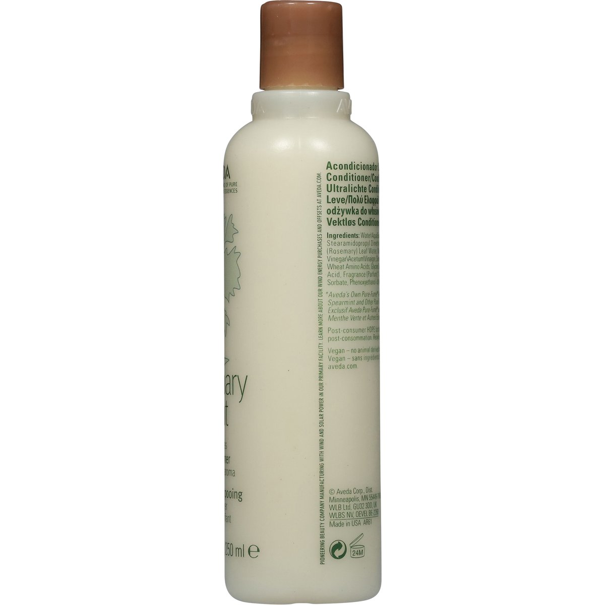 Vegan. The art and science of pure flower and plant essences. Invigorating aroma. aveda.com. For more, aveda.com. Post-consumer HDPE bottle. Please recycle. No animal derived ingredients. Pioneering beauty company manufacturing with wind and solar power in our primary facility. Learn more about our wind energy purchases an offsets at aveda.com. Made in USA.