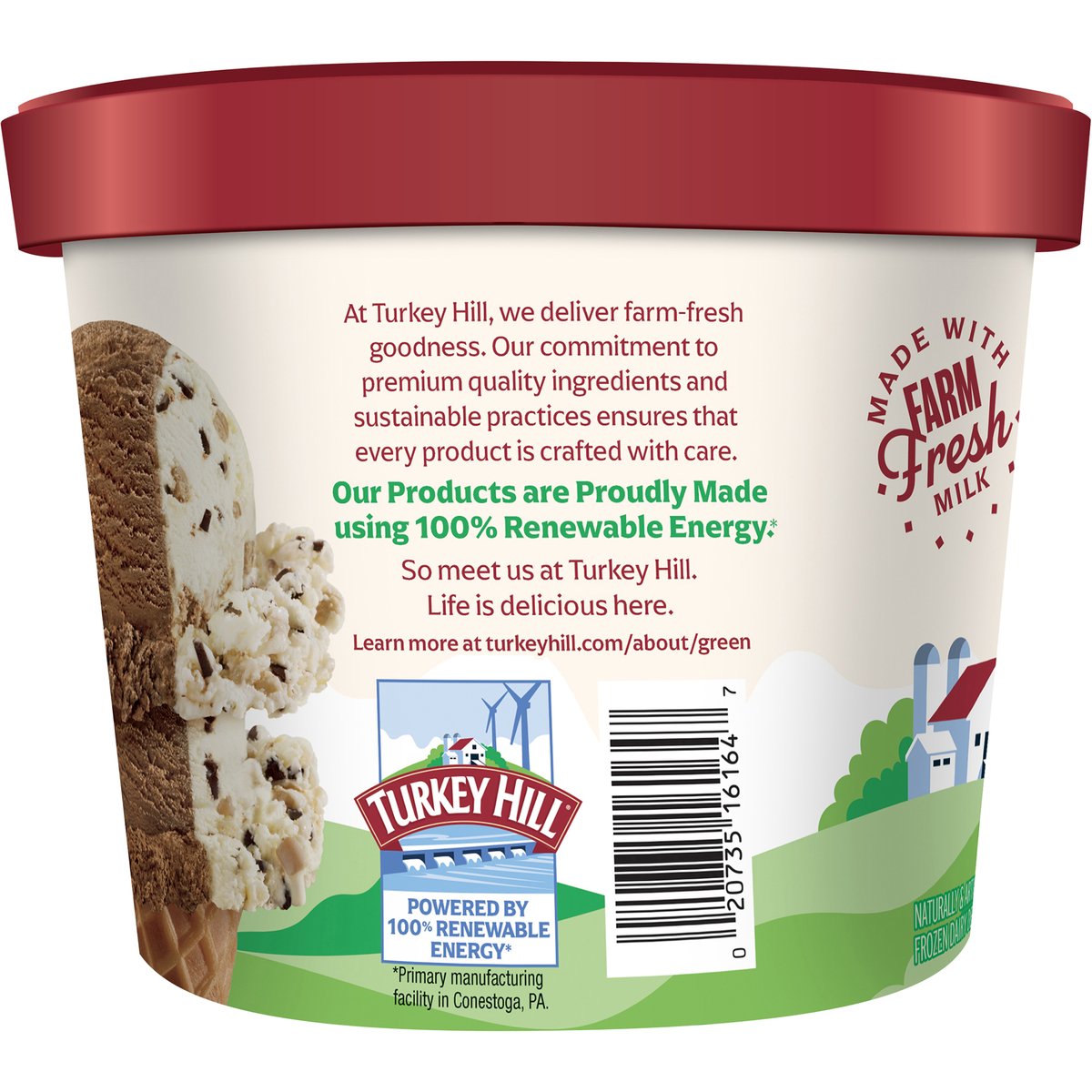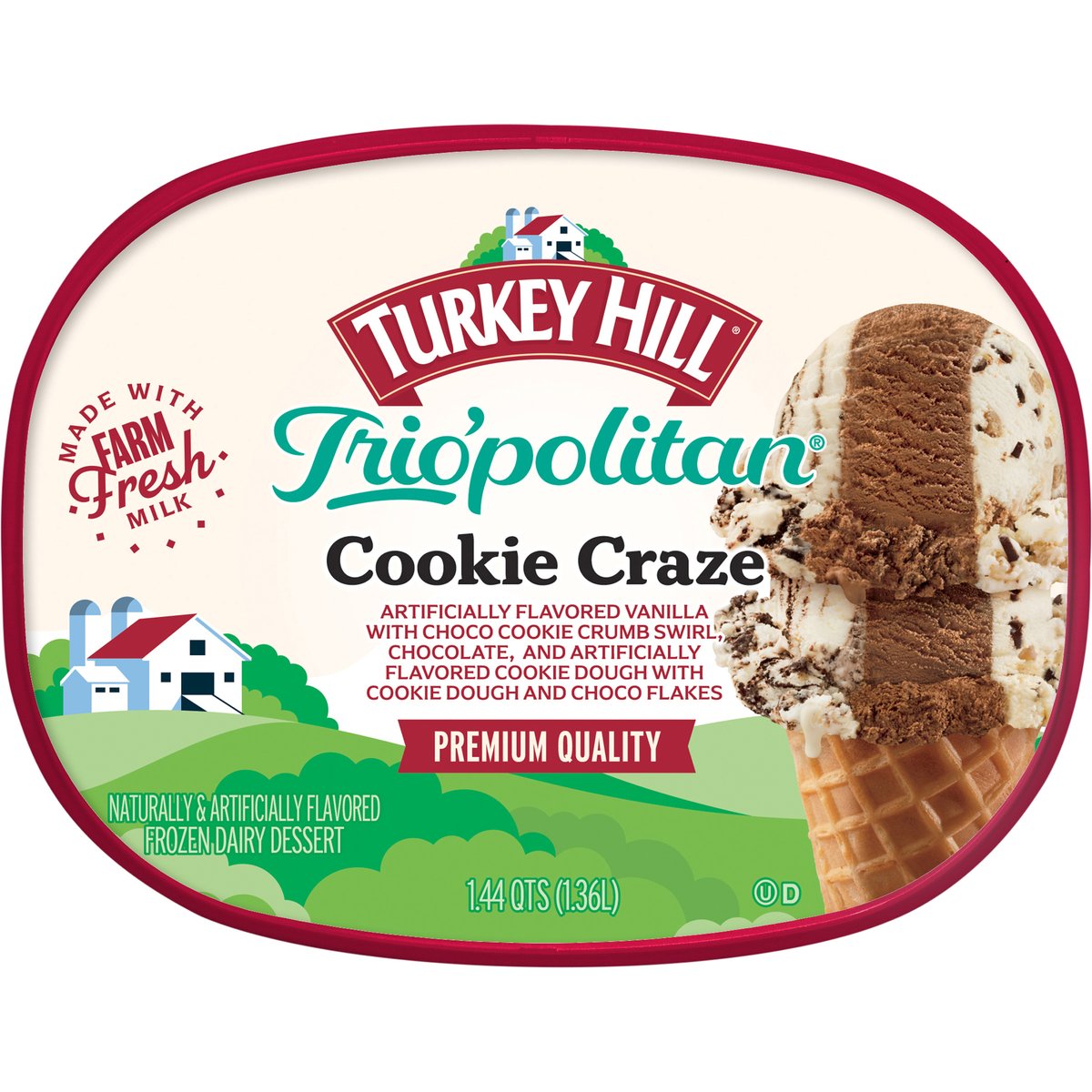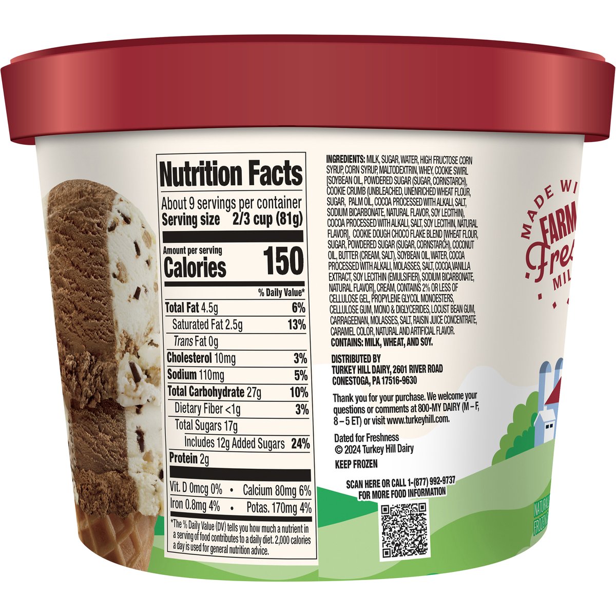 A trio of vanilla flavored, chocolate & cookie dough flavored ice creams. Naturally & artificially flavored. Premium ice cream. Vanilla flavored ice cream with chocolate cookie swirl, chocolate ice cream, and cookie dough flavored ice cream with cookie dough and Choco flakes. Dated for Freshness www.turkeyhill.com. Scan or call 1-(877) 992-9737 for more food information. Thank you for your purchase. We welcome your questions or comments at 800-My Dairy (M - F, 8 - 5 ET) or visit www.turkeyhill.com.