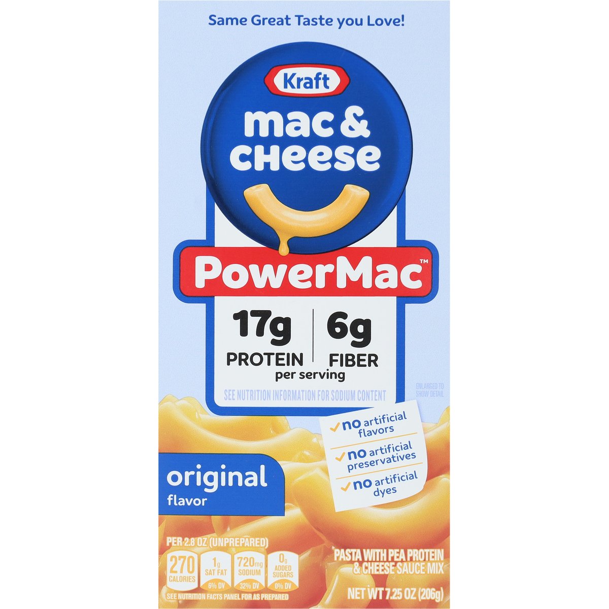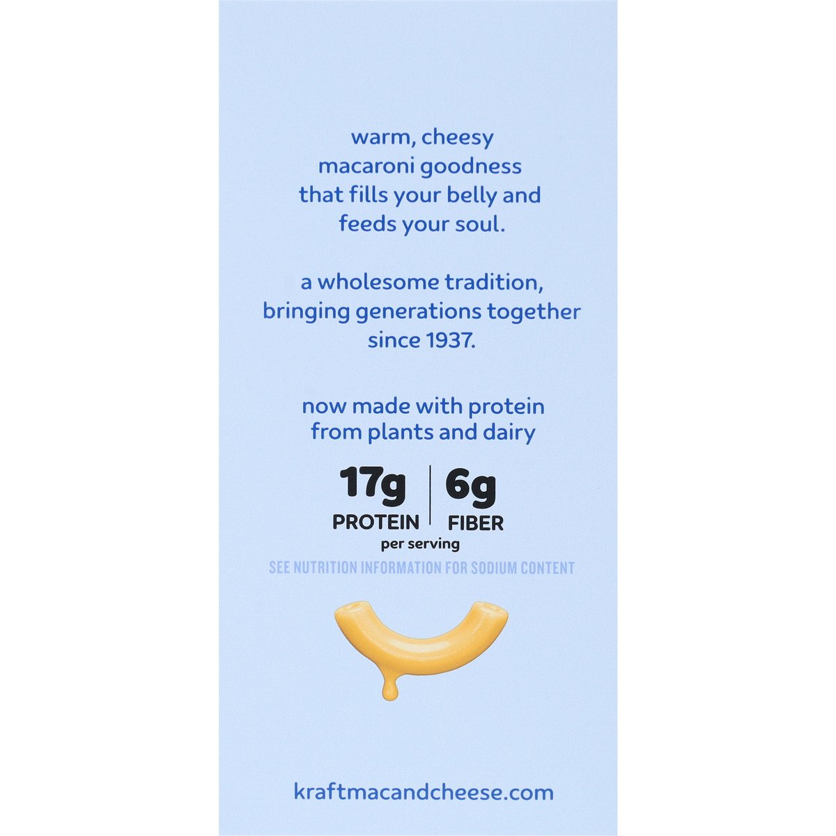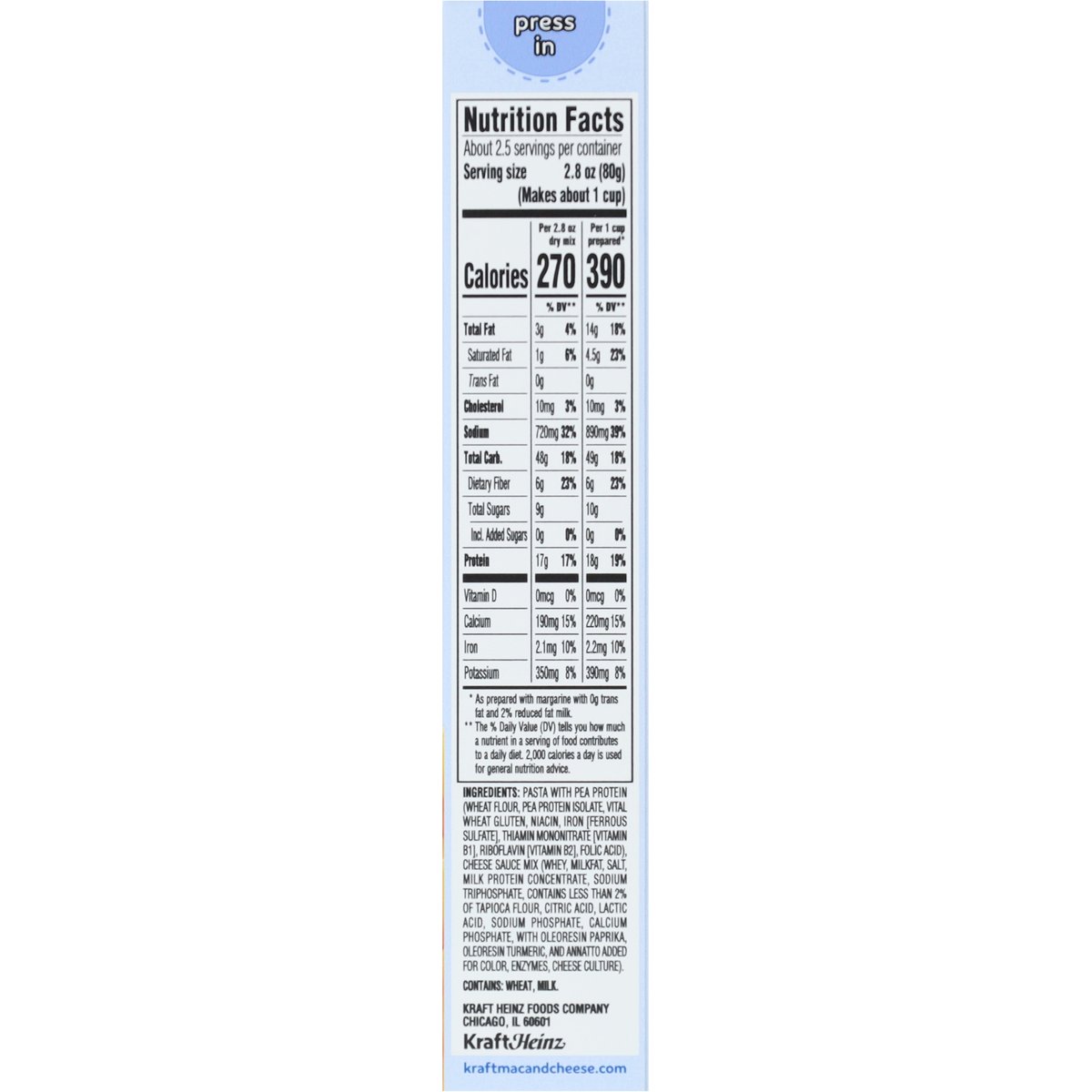 Pasta with pea protein & cheese sauce mix. Per 2.8 Oz (Unprepared): 270 calories; 1 g sat fat (6% DV); 720 mg sodium (32% DV); 0 g added sugars (0% DV). See nutrition information for sodium content. See nutrition facts panel for as prepared. Same great taste you love! No artificial preservatives. No artificial dyes. Warm, cheesy macaroni goodness that fills your belly and feeds your soul. A wholesome tradition, bringing generations together since 1937. Now made with protein from plants and dairy. This product sold by weight; not volume. Some settling of contents may have occurred during handling. how2recycle.info. kraftheinz.com. kraftmacandcheese.com. Visit us at kraftheinz.com. 1-800-847-1997. Please have package available.