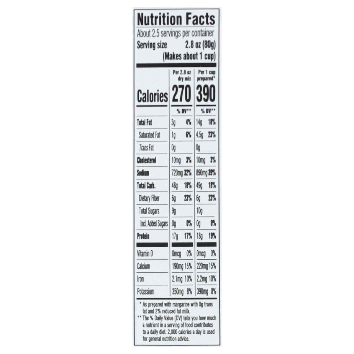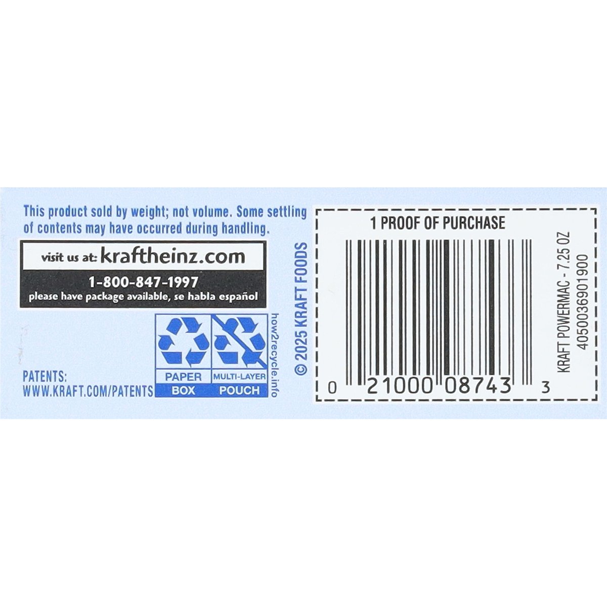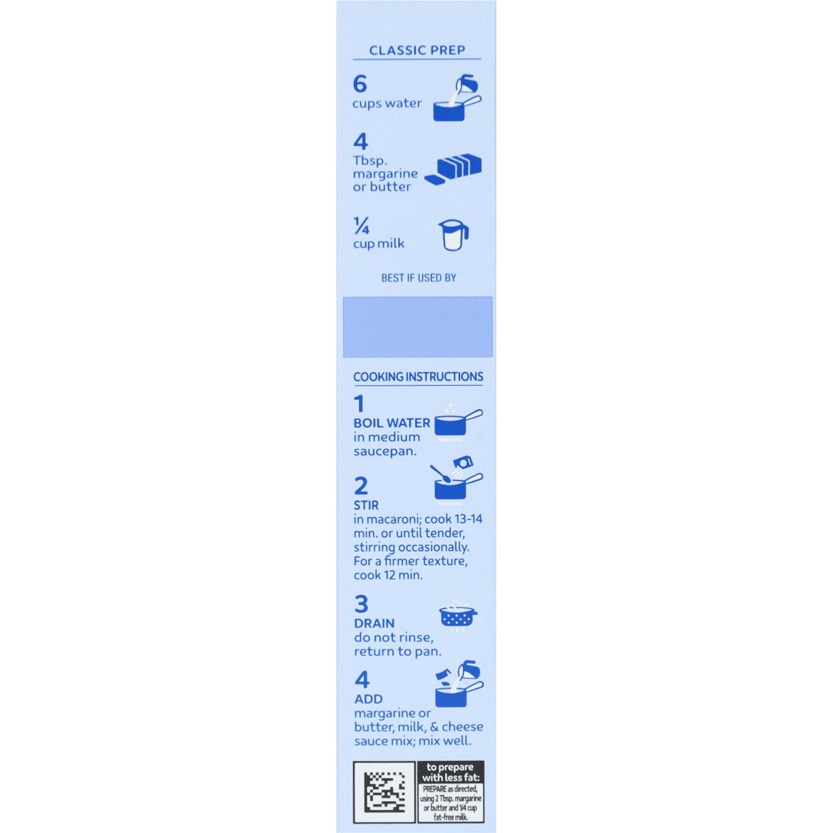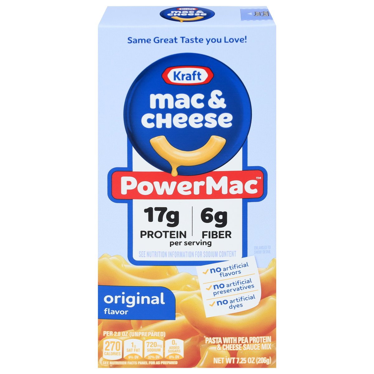 Pasta with pea protein & cheese sauce mix. Per 2.8 Oz (Unprepared): 270 calories; 1 g sat fat (6% DV); 720 mg sodium (32% DV); 0 g added sugars (0% DV). See nutrition information for sodium content. See nutrition facts panel for as prepared. Same great taste you love! No artificial preservatives. No artificial dyes. Warm, cheesy macaroni goodness that fills your belly and feeds your soul. A wholesome tradition, bringing generations together since 1937. Now made with protein from plants and dairy. This product sold by weight; not volume. Some settling of contents may have occurred during handling. how2recycle.info. kraftheinz.com. kraftmacandcheese.com. Visit us at kraftheinz.com. 1-800-847-1997. Please have package available.