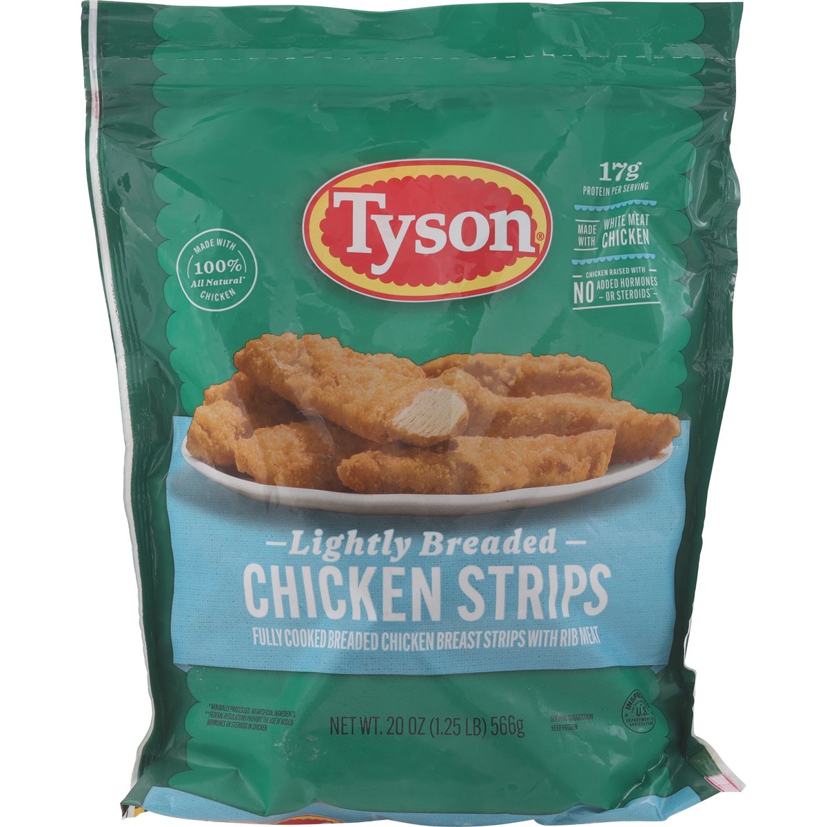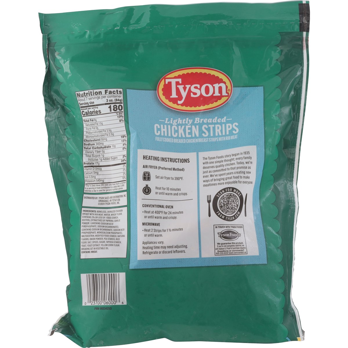 Fully cooked breaded chicken breast strips with rib meat. 17 g of protein per serving. Chicken raised with no added hormones or steroids**. The Tyson Foods story began in 1935 with one simple thought; every family deserves quality chicken. Today, we're just as committed to that promise as ever. We've spent years creating new ways of bringing great food to make mealtimes more enjoyable for everyone. ** Federal regulations prohibit the use of added hormones or steroids in chicken. In Touch With Tyson Foods: We guarantee this product. If you're not completely satisfied, we will replace it. Proof of purchase required. Questions or comments? 800-233-6332 tyson.com/contact-us. Inspected for wholesomeness by U.S. Department of Agriculture. www.tyson.com. Scan for more from tyson.com. 800-233-6332.