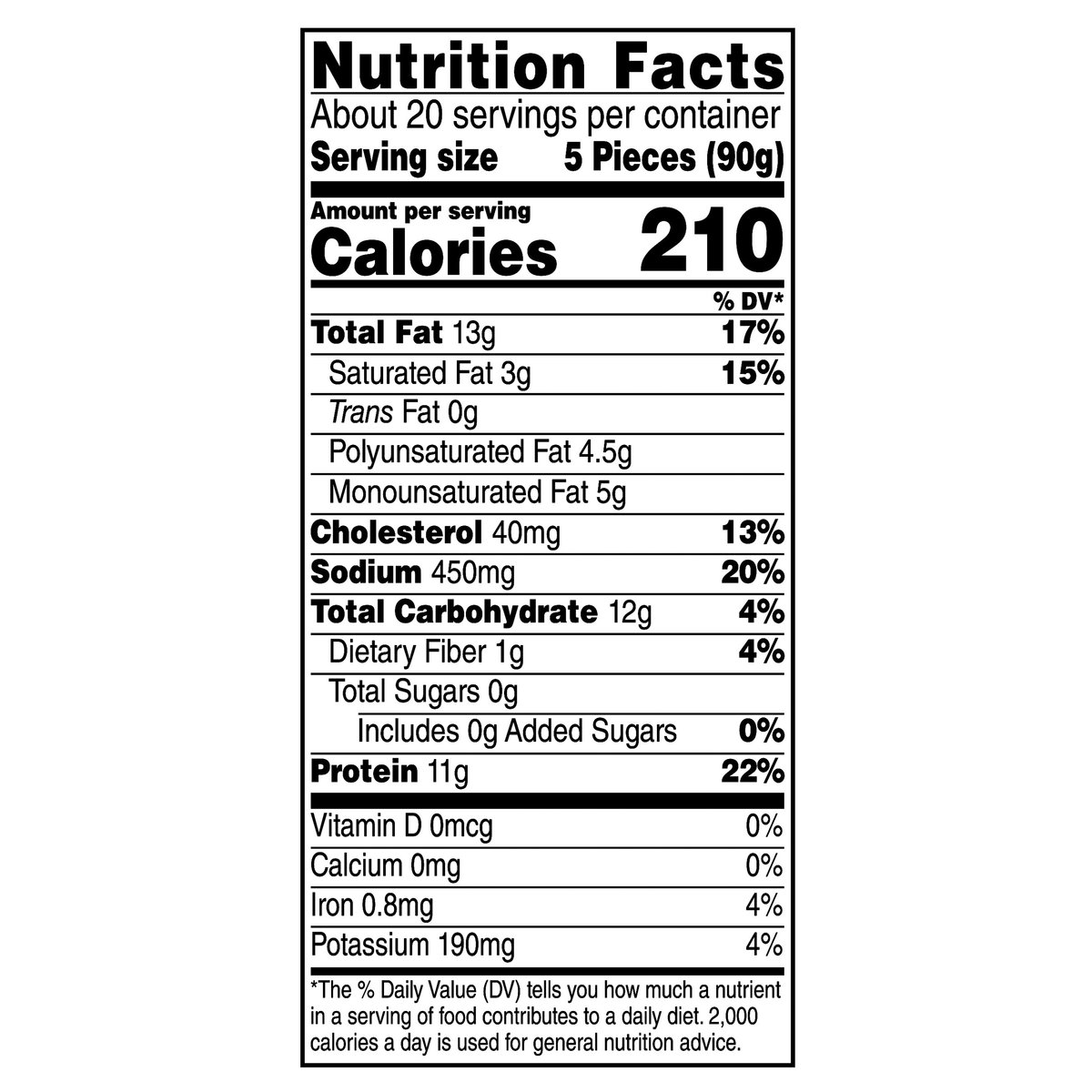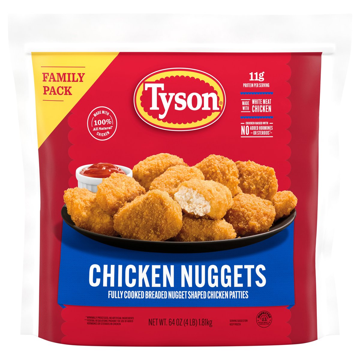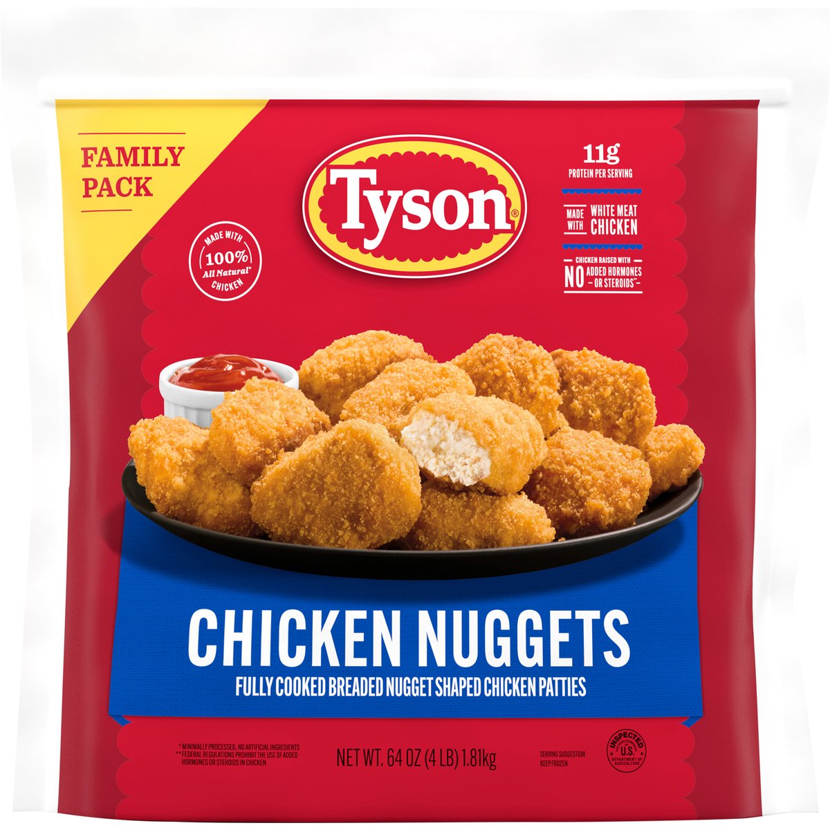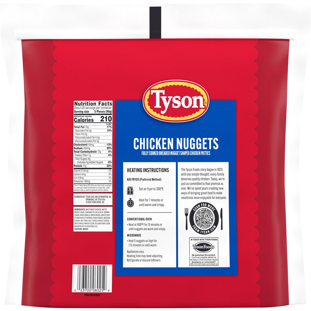 Fully cooked breaded nugget shaped chicken patties. 11 g protein per serving. Chicken raised with no added hormones or steroids**. The Tyson Foods story began in 1935 with one simple thought; every family deserves quality chicken. Today, we're just as committed to that promise as ever. We've spent years creating new ways of bringing great food to make mealtimes more enjoyable for everyone. ** Federal regulations prohibit the use of added hormones or steroids in chicken. In Touch with Tyson Foods: We guarantee this product. If you’re not completely satisfied, we will replace it. Proof of purchase required. Questions or comments? 800-233-6332; tyson.com/contact-us. Inspected for wholesomeness by U.S. Department of Agriculture. tyson.com. Scan for more from tyson.com.
