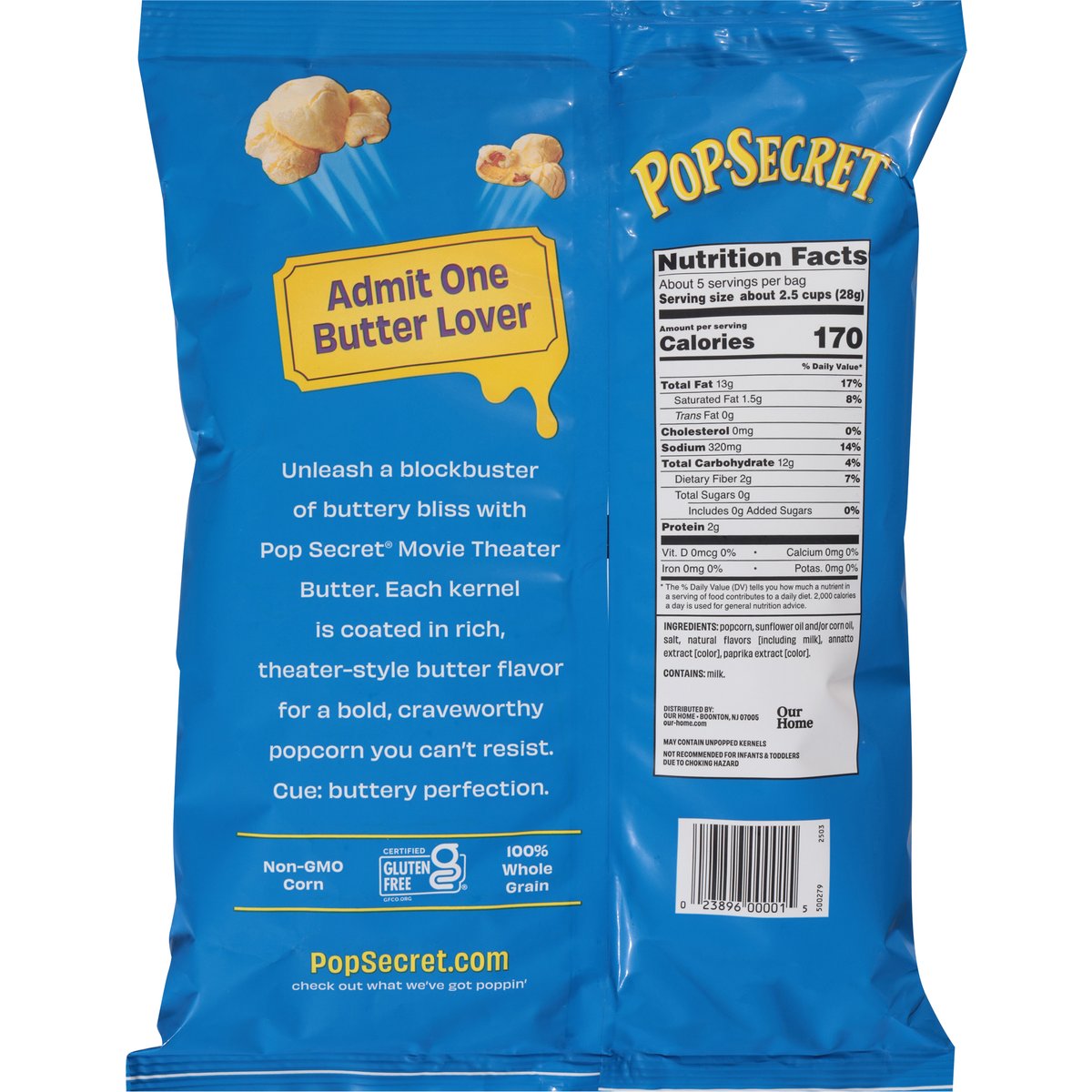 Flavored with other natural flavors. Certified gluten free. 100% whole grain. Non-GMO corn. Admit one butter lover. Unleash a blockbuster of buttery bliss with Pop Secret Movie Theater Butter. Each kernel is coated in rich, theater-style butter flavor for a bold, craveworthy popcorn you can't resist. Cue: Buttery perfection. our-home.com. PopSecret.com. PopSecret.com. Check out what we've got poppin'.