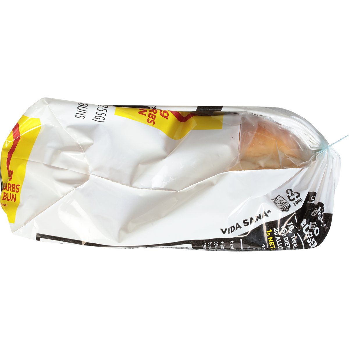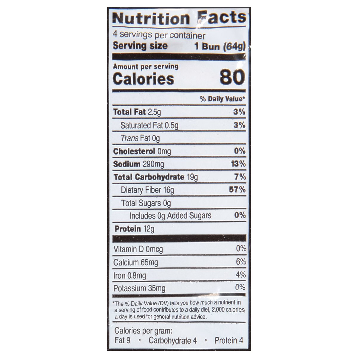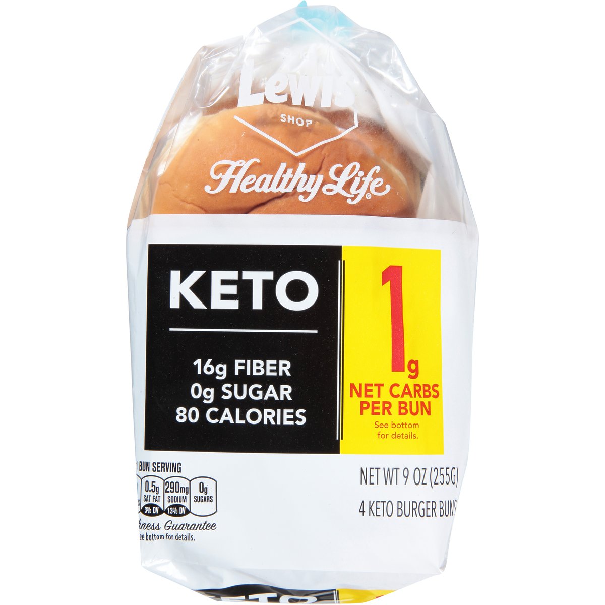 16 g fiber. 10 g protein. 80 calories. 1 g net carbs per bun. See bottom for details. Per 1 Bun Serving: 80 calories; 0.5 g sat fat (3% DV); 290 mg sodium (13% DV); 1 g sugar. 19 g total carbs per bun; 16 g dietary fiber per bub; 2 g allulose per bun; 1 g net carbs (1 g net carbs per bun); 19 g total carbs minus 16 g dietary fiber minus 2 g allulose = 1 g net carbs (per bun). Low fat. Reduced Calorie: 56% fewer calories than regular burger buns. Calories reduced from 180 to 80 calories per 64g bun. Contains a bioengineered food ingredients. Lewis Bake Shop. Healthy life. Keto. Freshness Guarantee: We stand behind the quality of our product. If you are not satisfied with one of our products, reach out to us at customerservice(at)lewisbakeries.com or healthylifebread.com. lewisbakeries.com. healthylifebread.com Find us on Facebook. Twitter. Instagram (at)LewisBakeShop. BCTGM: Bakery Confectionery Tobacco Workers & Grain Millers union made. AFL CIO CLC.