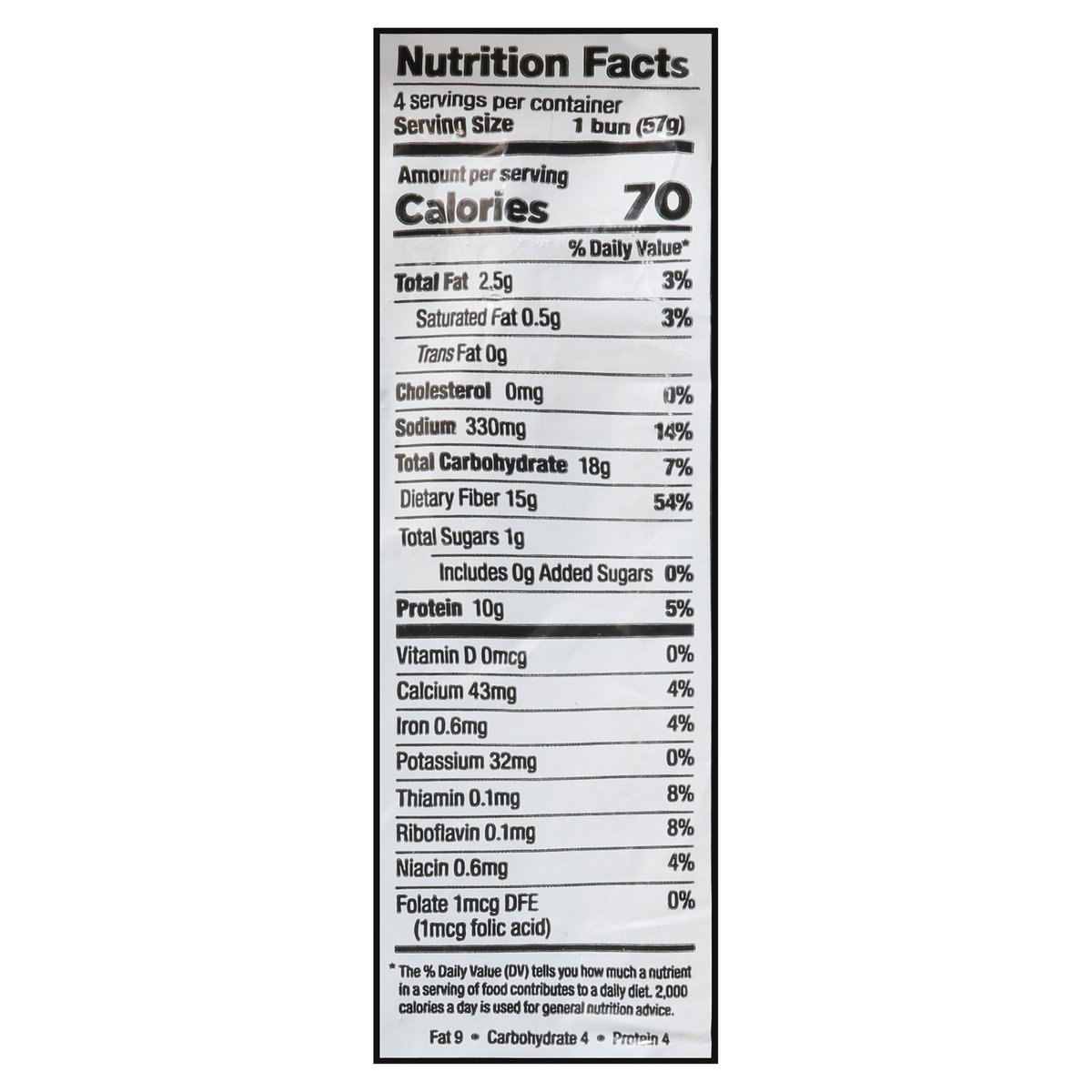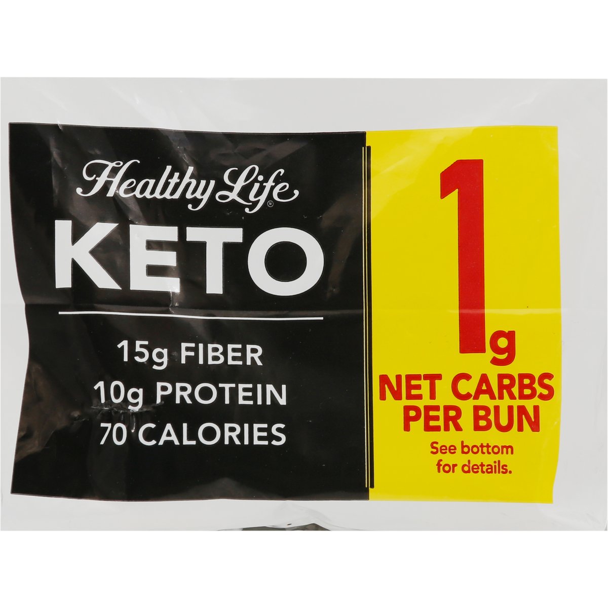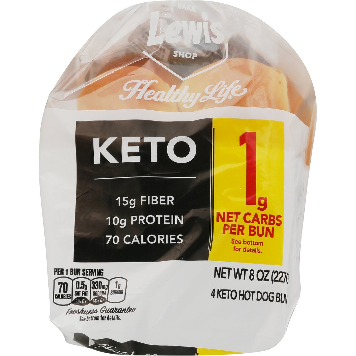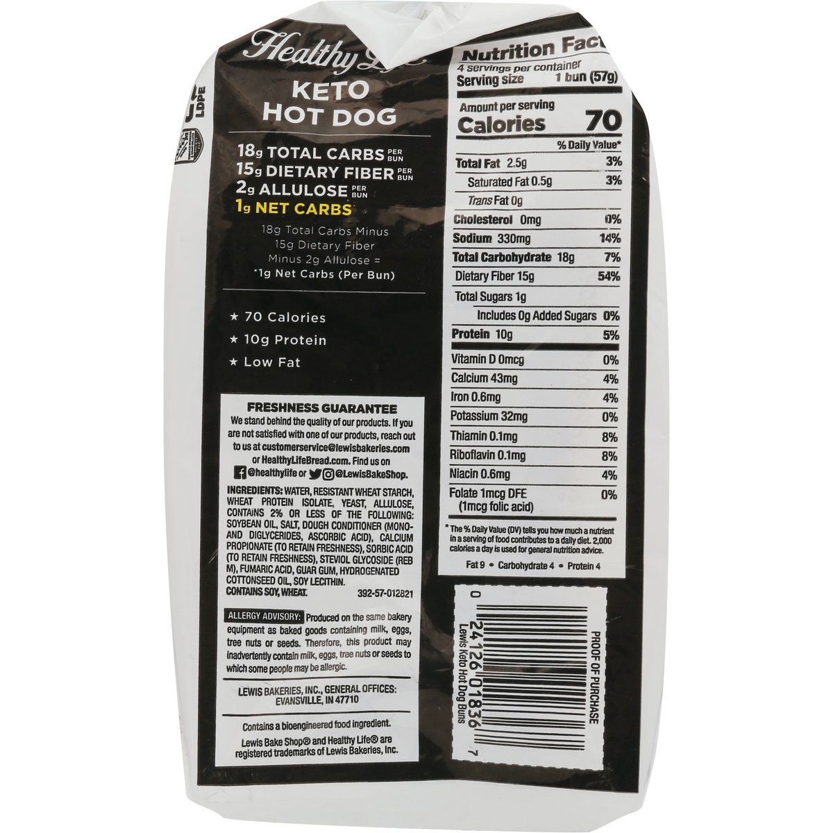 15 g fiber; 10 g protein; 70 calories. 1 g net carbs per bun. Per 1 Bun Serving: 70 calories; 0.5 g sat fat (3% DV); 330 mg sodium (14% DV); 1 g sugars. 18 g total carbs per bun; 15 g dietary fiber per bun; 2 g allulose per bun; 1 g net carbs. 18 g total carbs minus; 15 g dietary fiber; minus 2 g allulose = 1 g net carbs (per bun). Low fat. Contains a bioengineered food ingredients. Freshness guarantee. We stand behind the quality of our products. If you are not satisfied with one of our products, reach out to us at customerservice(at)lewisbakeries.com or HealthyLifeBread.com. Find us in facebook (at)healthylife or twitter. Instagram (at)LewisBakeShop.