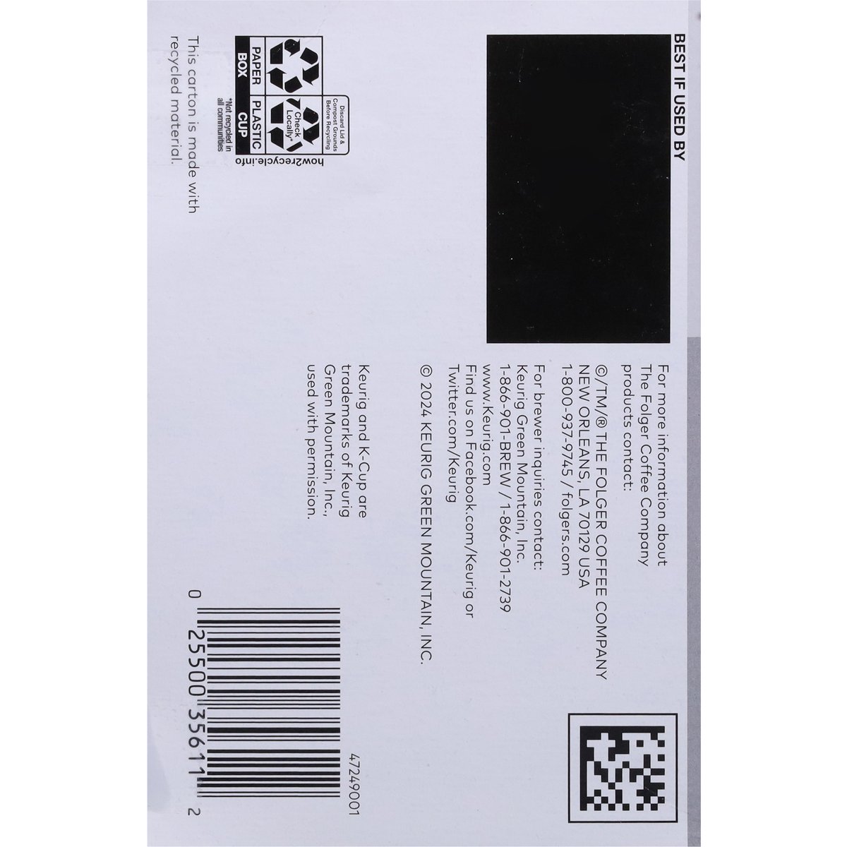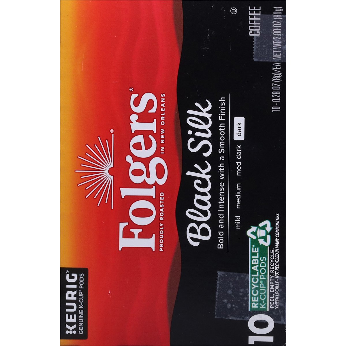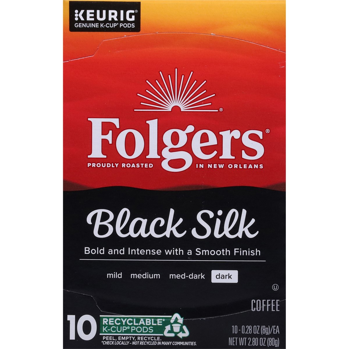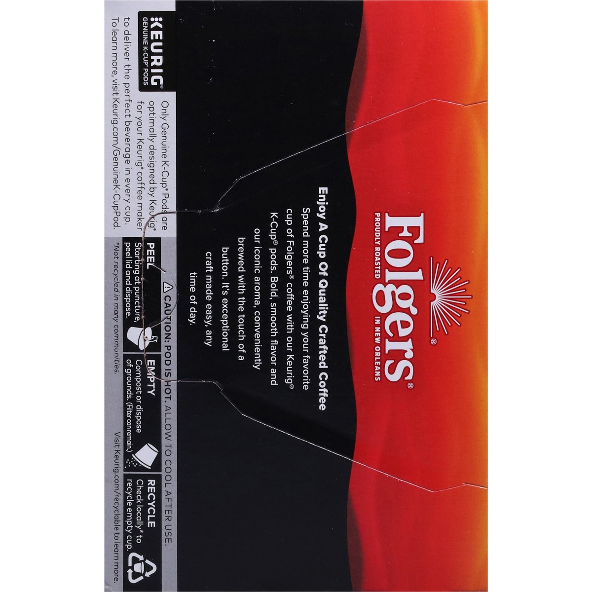 Bold and intense with a smooth finish. Proudly roasted in New Orleans. Enjoy a Cup of Quality Crafted Coffee: Spend more time enjoying your favorite cup of Folgers coffee with our Keurig K-Cup pods. Bold, smooth flavor and our iconic aroma, conveniently brewed with the touch of a button. It's exceptional craft made easy, any time of day. www.Keurig.com. how2recycle.info. folgers.com. Find us on Facebook.com/Keurig or Twitter.com/Keurig. For more information about The Folger Coffee Company products contact: 1-800-937-9745 / folgers.com. For brewer inquiries contact: Keurig Green Mountain, Inc. 1-866-901-Brew/1-866-901-2739. www.keurig.com. This carton is made with recycled material. Recyclable* K-Cup Pods: Peel, Empty, Recycle. Only Genuine K-Cup Pods are optimally designed by Keurig for your Keurig coffee maker to deliver the perfect beverage in every cup. To learn more at, visit Keurig.com/GenuineK-CupPod. Peel: Starting at puncture, peel lid and dispose. Empty: Compost or dispose of grounds. (Filter can remain). Recycle: Check locally*. Visit Keurig.com/recyclable to learn more. * Check locally - not recycled in many communities.