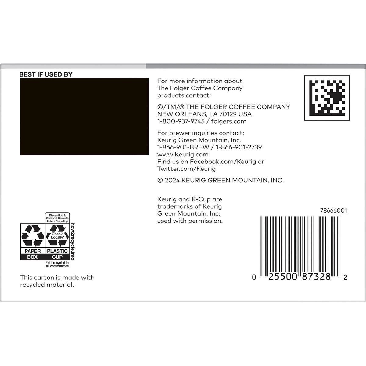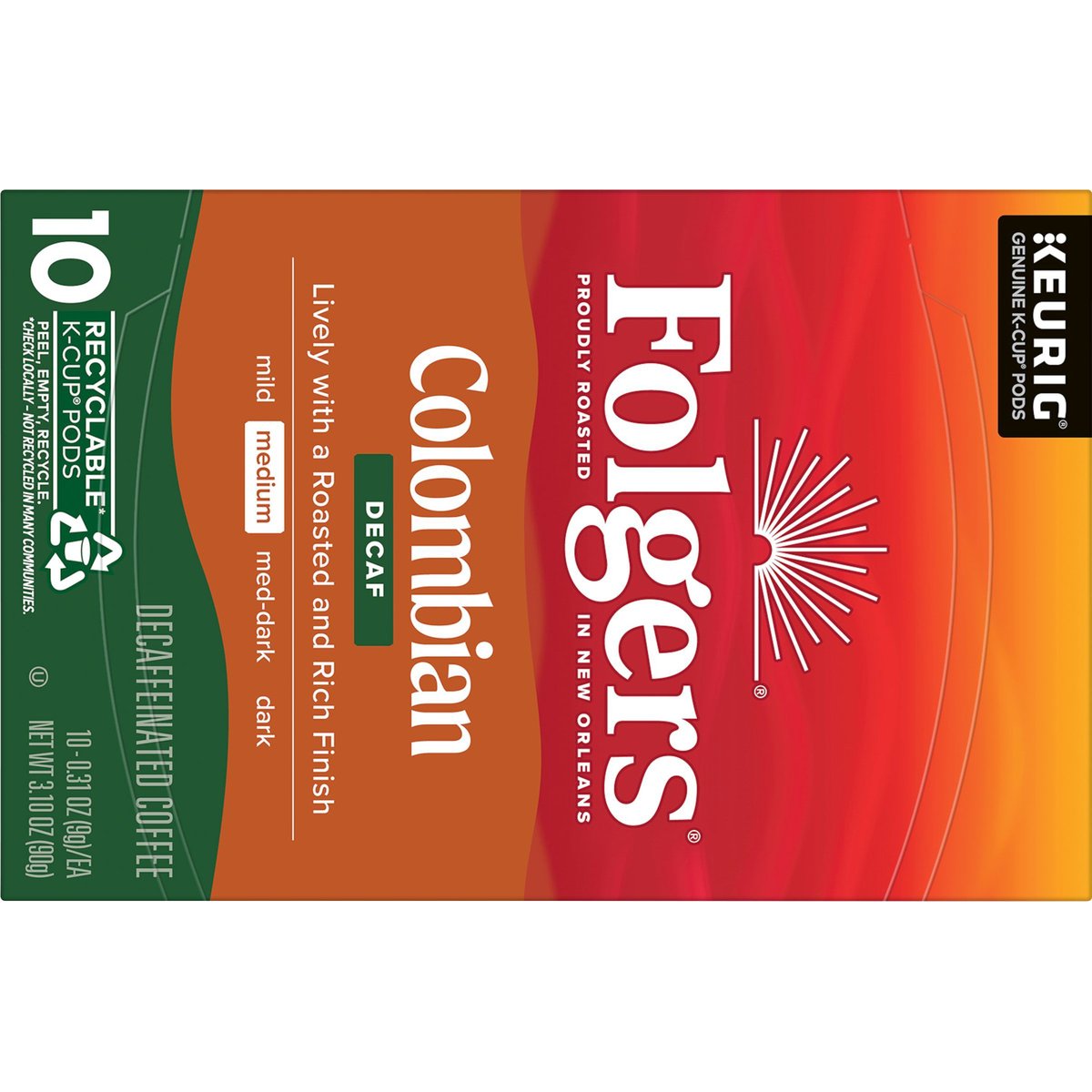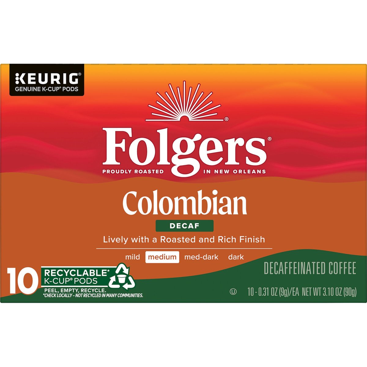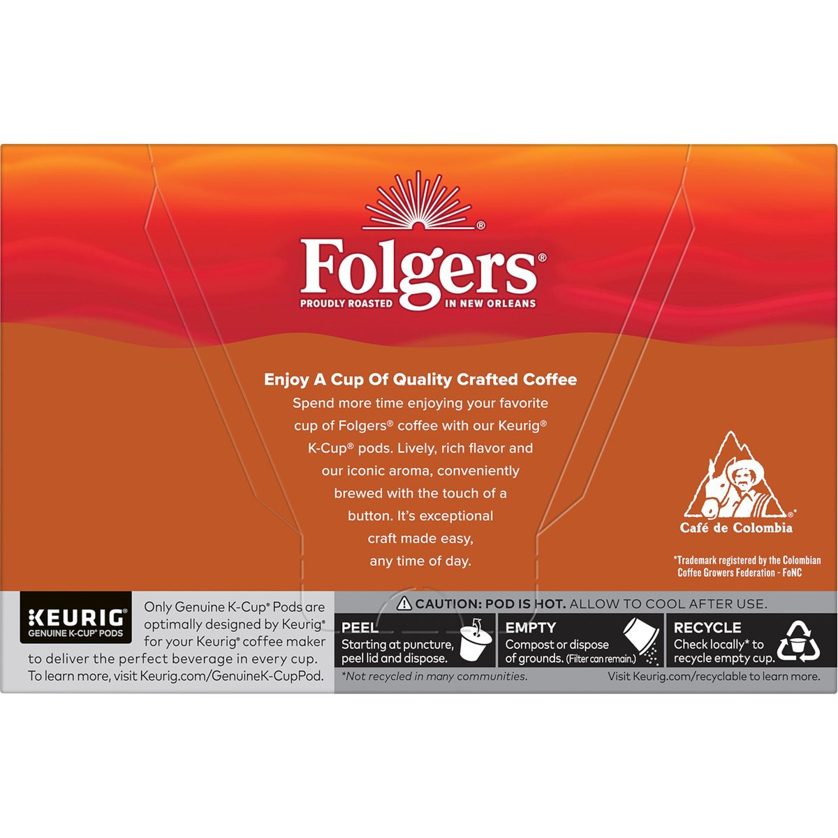 99.7% caffeine free. Keurig Genuine K-Cup Pods. Proudly roasted in New Orleans. Lively with a roasted and rich finish. Medium. Enjoy a Cup of Quality Crafted Coffee. Spend more time enjoying your favorite cup of Folgers coffee with our Keurig K-Cup Pods. Lively, rich flavor and our iconic aroma, conveniently brewed with the touch of a button. It's exceptional craft made easy, any time of day. Only Genuine K-Cup Pods are optimally designed by Keurig for your Keurig coffee maker to deliver the perfect beverage in every cup. www.keurig.com. folgers.com. how2recycle.info. Find us on facebook.com/keurig or Twitter.com/keurig. For more information about The Folger Coffee Company product contact: For brewer inquiries contact: Keurig Green mountain, Inc. 1-800-901-BREW/1-800-901-2739 www.keurig.com. To learn more, visit Keurig.com/Genuine-CupPod. Recyclable* K-Cup Pods: Peel, Empty, Recycle. Only Genuine K-Cup Pods are optimally designed by Keurig for your Keurig coffee maker to deliver the perfect beverage in every cup. To learn more at, visit Keurig.,com/GenuineK-CupPod. Peel: Starting at puncture, peel lid and dispose. Empty: Compost or dispose of grounds. (Filter can remain). Recycle: Check locally*. Visit Keurig.com/recyclable to learn more. *Check locally - not recycled in many communities.