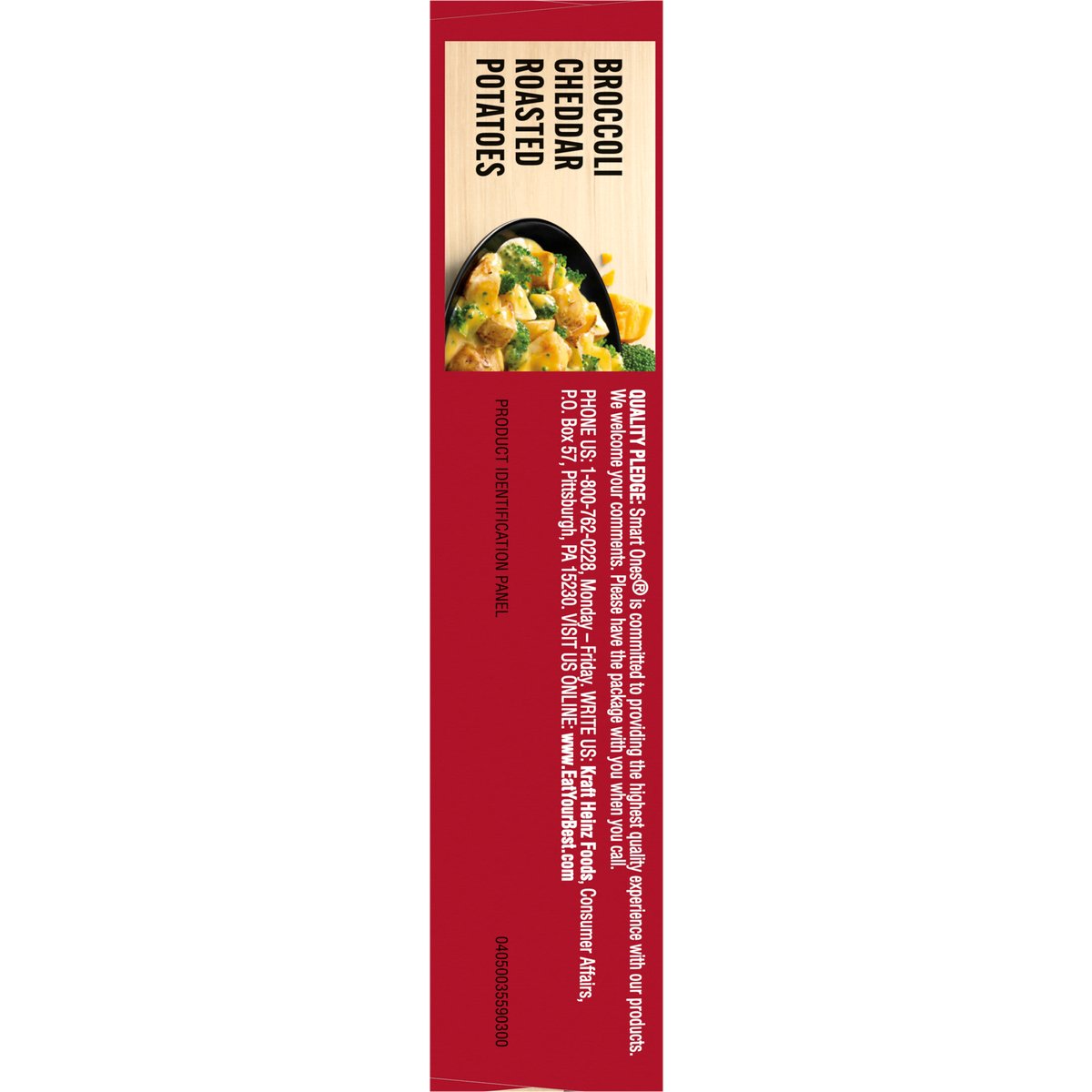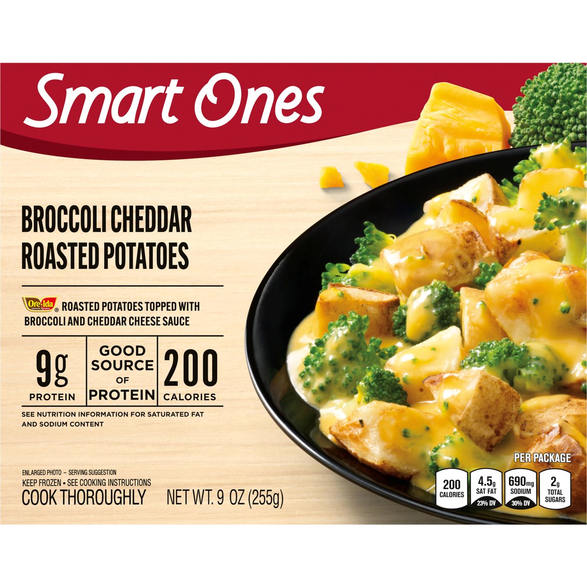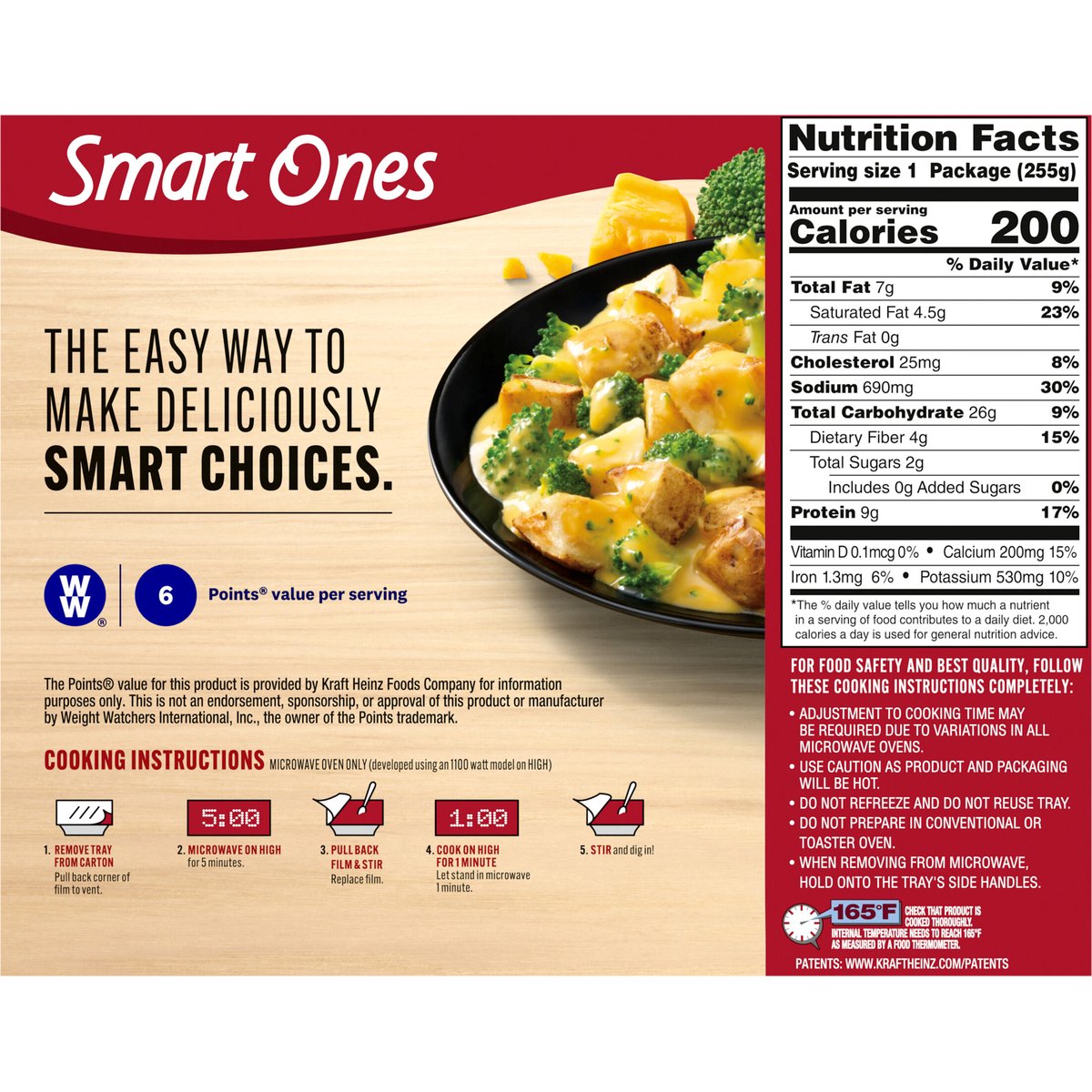 Roasted russet potatoes topped with broccoli and cheddar cheese sauce. 9 g of protein. 200 calories. Per Package: 200 calories; 4.5 g sat fat (23% DV); 690 mg sodium (3-% DV); 2 g total sugars. Gluten free. See nutrition information for saturated fat and sodium content. Good source of protein. The easy way to make deliciously smart choices. WW 6 points value per serving. Quality Pledge: Smart Ones is committed to providing the highest quality experience with our products. We welcome your comments. Please have the package with you when you call. Phone US: 1-800-762-0228, Monday - Friday. Write us: Kraft Heinz Foods, Consumer Affairs, PO Box 57, Pittsburgh, PA 15230. Visit us online: www.EatYourBest.com. eatyourbest.com. SmartLabel: Scan for more food information. Call 1-800-762-0228 for more food information. Phone us: 1-800-762-0228, Monday - Friday. Write us: Kraft Heinz Foods, Consumer Affairs, P.O. Box 57, Pittsburgh, PA 15230. Visit us online: www.EatYourBest.com. Learn more & sign-up for savings at eatyourbest.com. 7 SmartPoints Value: The SmartPoints Value for this product was calculated by Kraft Heinz Foods Company and is provided for information purposes only. This is not an endorsement, sponsorship, or approval of this product or manufacturer by Weight Watchers International, Inc., the owner of the Weight Watchers and SmartPoints trademarks.