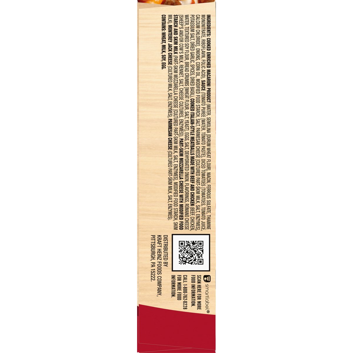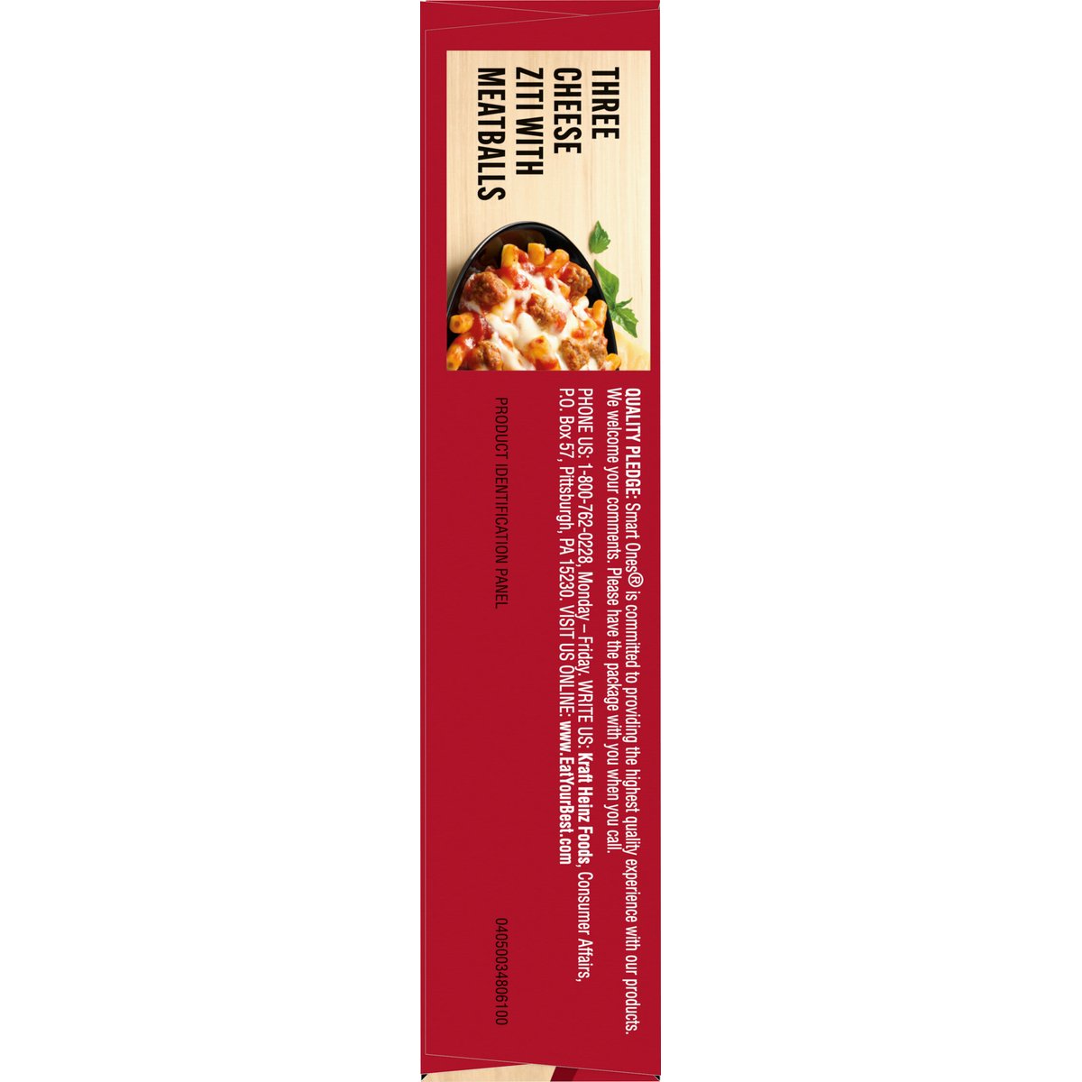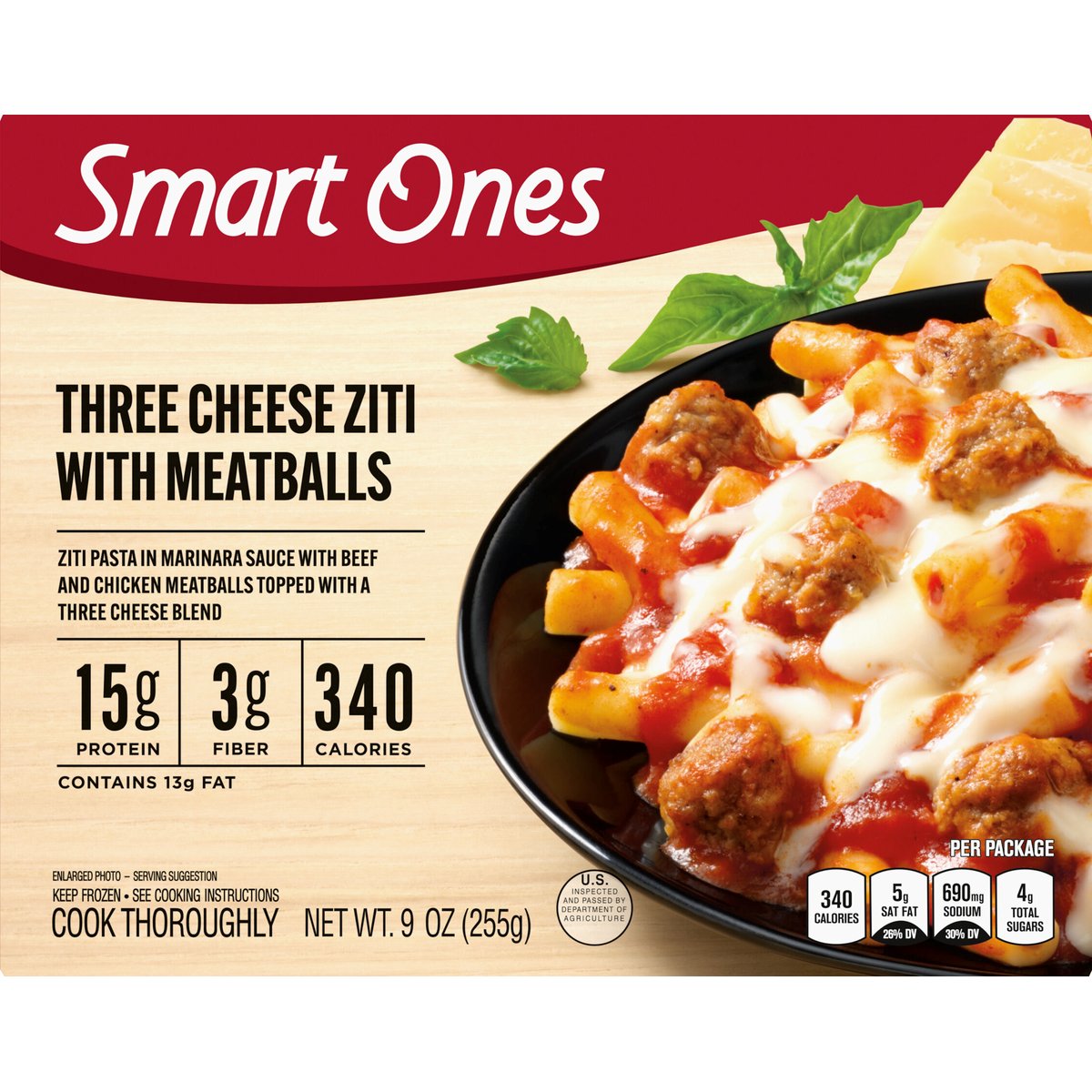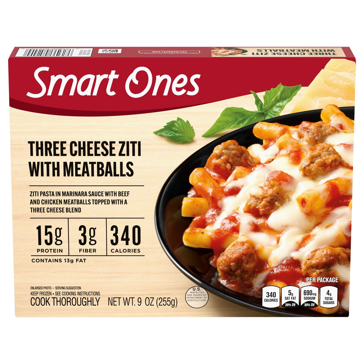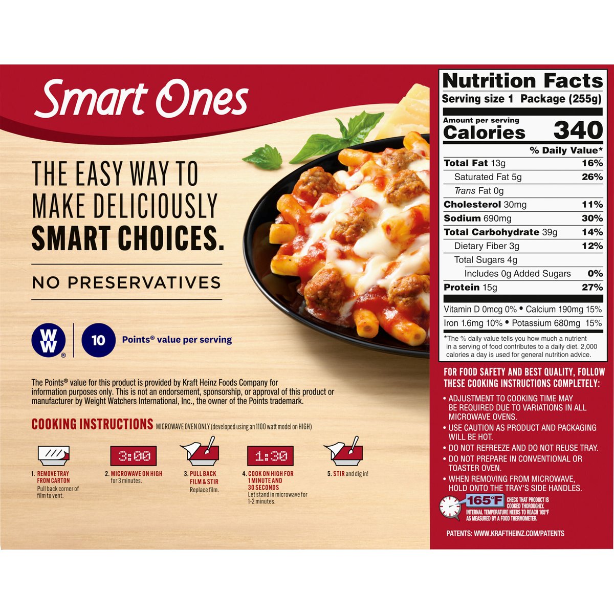 Ziti pasta in marinara sauce with beef and chicken meatballs topped with a three cheese blend. 15 g protein; 3 g fiber; 340 calories. Per Package: 340 calories; 5 g sat fat (29% DV); 690 mg sodium (30% DV); 4 g total sugars. The easy way to make deliciously smart choices. No preservatives. Quality Pledge: Smart Ones is committed to providing the highest quality experience with our products. We welcome your comments. Please have the package with you when you call. U.S. inspected and passed by Department of Agriculture. www.EatYourBest.com. SmartLabel: Scan for more food information. Call 1-800-762-0228 for more food information. Learn more & sign-up for savings at eatyourbest.com. Phone Us: 1-800-762-0228, Monday - Friday. Write Us: Kraft Heinz Foods, Consumer Affairs, P.O. Box 57, Pittsburgh, PA 15230. Visit us online: www.eatyourbest.com. 10 points value per serving. The points value for this product is provided by Kraft Heinz Foods Company for information purposes only. This is not an endorsement, sponsorship, or approval of this product or manufacturer by Weight Watchers International, Inc. the owner of this points trademark.