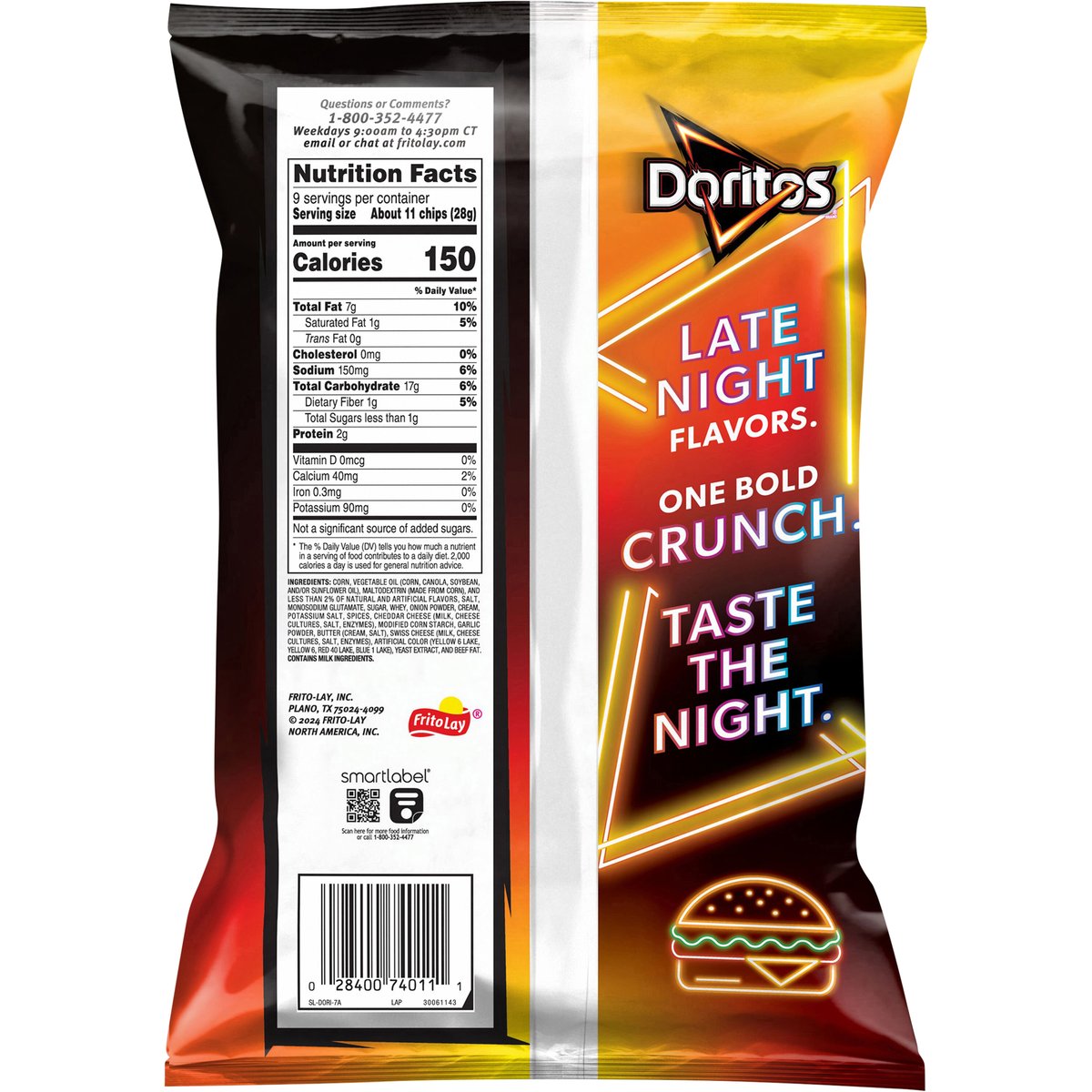Late night flavors. One bold crunch. Taste the night. fritolay.com. SmartLabel: Scan for more food information or call 1-800-352-4477. Questions or comments? 1-800-352-4477. Weekdays 9:00 am to 4:30 pm CT email or chat at fritolay.com.