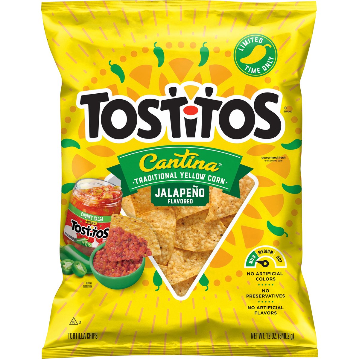 Traditional yellow corn. No artificial flavors. Limited time only. Mild. No artificial colors. No preservatives. Guaranteed fresh until printed date or this snack is on us. tostitos.com. fritolay.com. Pepsico Tasty Rewards: Scan for coupons, recipes, sweepstakes, and more! Data rates may apply. Instagram. Twitter. SmartLabel: Scan for more food information or call 1-800-352-4477. Find us on tostitos.com. Questions or comments? 1-800-352-4477. Mon-Fri 9:00 to 4:30pm CT email at fritolay.com. Visit our website @ fritolay.com. Go to tostitos.com for more recipes.