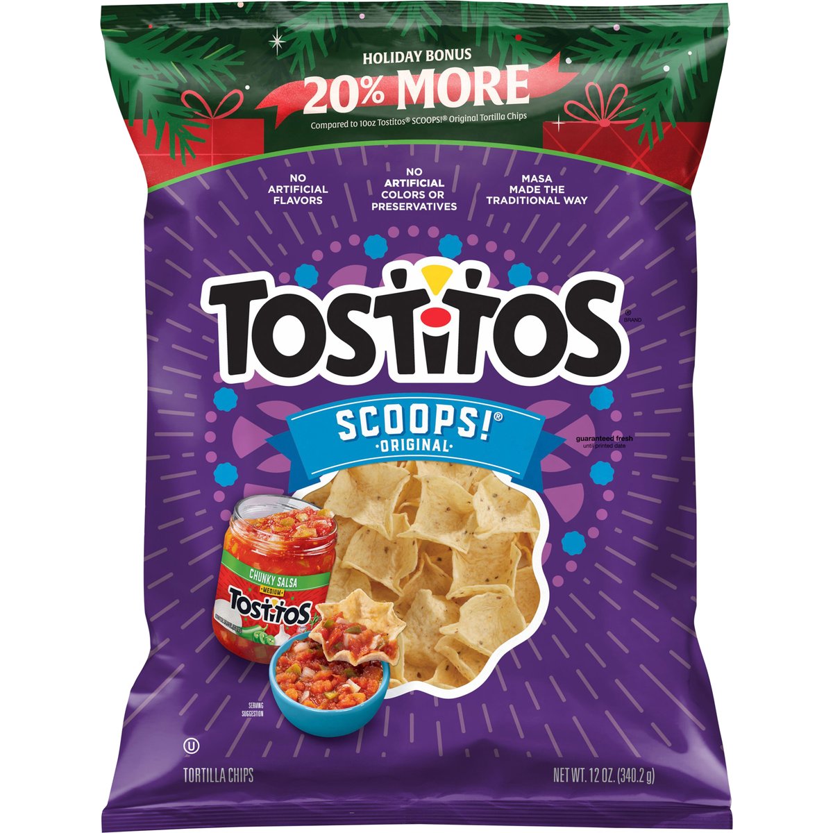 No artificial flavors. Gluten free. Holiday bonus 20% more compared to 10 oz Tostitos Scoops! Original Tortilla chips. No artificial colors or preservatives. Masa made the traditional way. Tostitos crafting the perfect crunch. We start with whole corn kernels we start by harvesting high-quality corn. Because the best tortilla chips start with whole corn kernels, never corn flour. Masa made the traditional way our corn masa is made the traditional way, inspired by the process of the Aztecs and refined over generations. The perfect chip since 1977 every chip is crafted with care and quality ingredients, giving you the best crunch in every bite. No added MSG. tostitos.com. fritolay.com. Instagram. Facebook. Pepsico Tasty Rewards: Scan me for coupons, recipes, sweepstakes, and more! Data rates may apply. SmartLabel: Scan for more food information or call 1-800-352-4477. Find us on tostitos.com. Visit our website fritolay.com. Questions or comments? 1-800-352-4477. Guaranteed fresh until printed date or this snack is on us. Mon-Fri 9:00 am to 4:30 pm CT email or chat at fritolay.com.