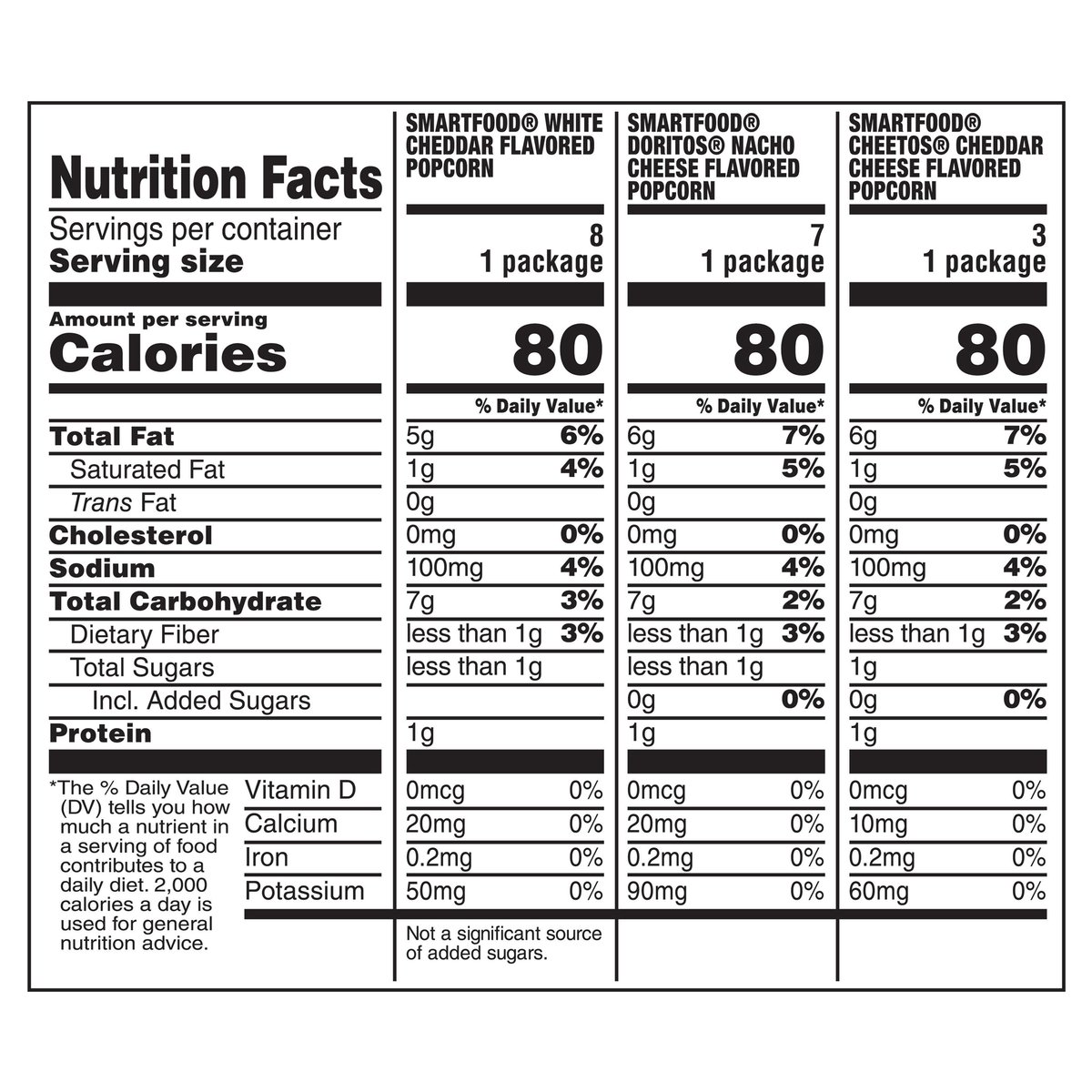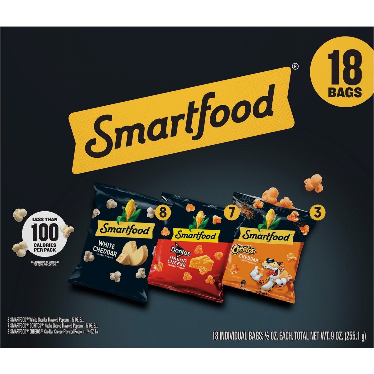 8 Smartfood white cheddar flavored popcom - 1/2 oz ea., 7 Smartfood Doritos nacho cheese flavored popcom - 1/2, oz. ea., 3 SmartFood Cheetos cheddar cheese flavored popcorn -1/2, oz. ea. Less than 100 calories per pack. See nutrition information for total fat content. Retain product and packaging. Guaranteed fresh until printed date or this snack is on us. how2recycle.info. Earn rewards! Scan to sign up. Unlock coupons, sweepstakes, and more! SmartLabel: Scan for more food information or call 1-888-924-5654. Questions or comments? 1-888-924-5654.
