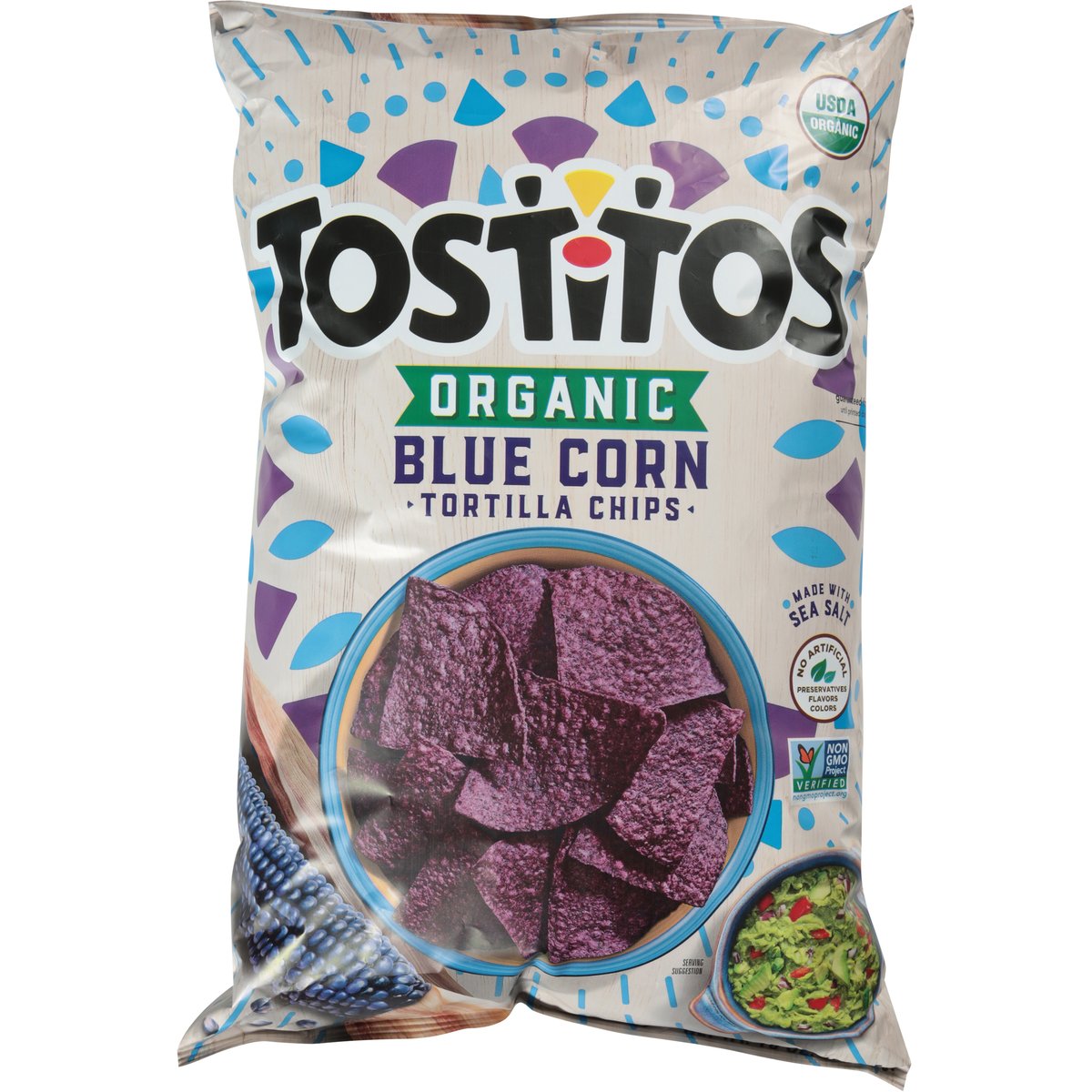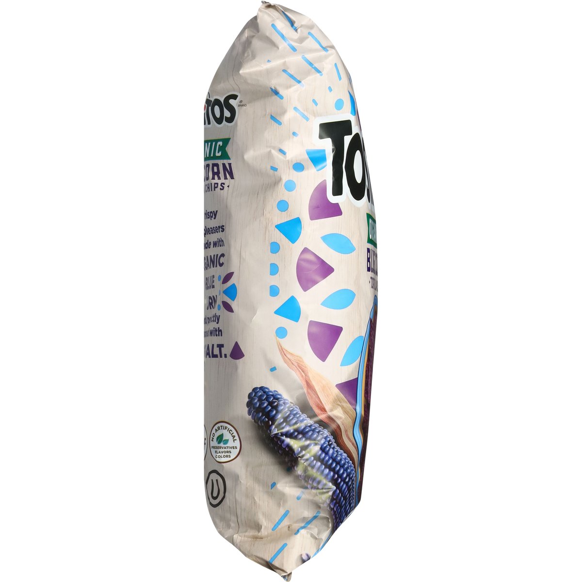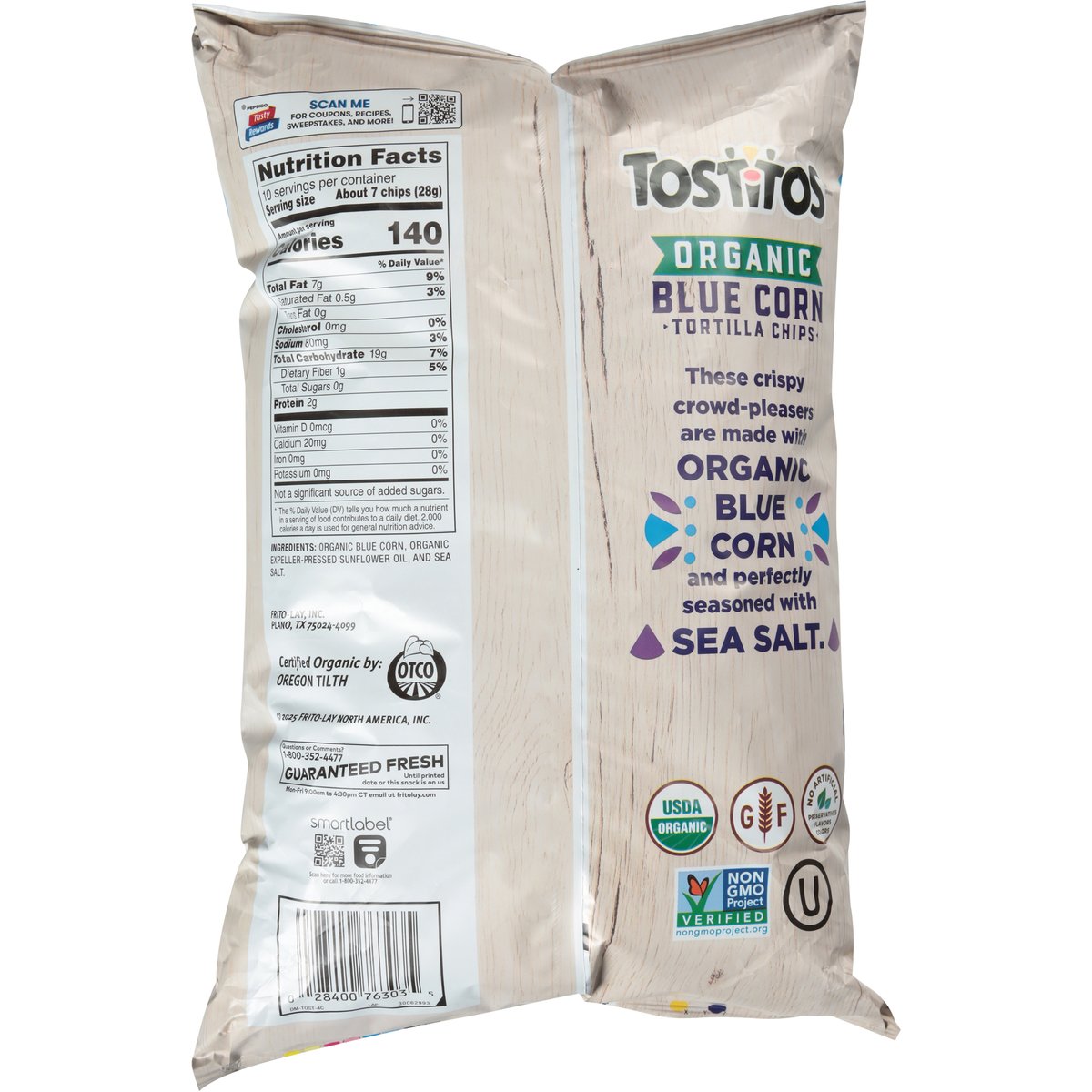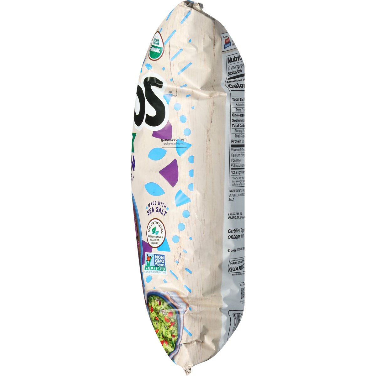 No artificial preservatives, flavors, colors. USDA Organic. Certified Organic by: Oregon Tilth. Gluten free. Non-GMO Project verified. nongmoproject.org. These crispy crowd-pleasers are made with organic blue corn and perfectly seasoned with sea salt. Guaranteed fresh until printed date or this snack is on us. Question or comments? 1-800-352-4477. Mon-Fri 9:00 am to 4:30 pm CT email at fritolay.com. fritolay.com. Pepsico Tasty Rewards: Scan me for coupons, recipes, sweepstakes, and more! SmartLabel: Scan for more food information or call 1-800-352-4477.