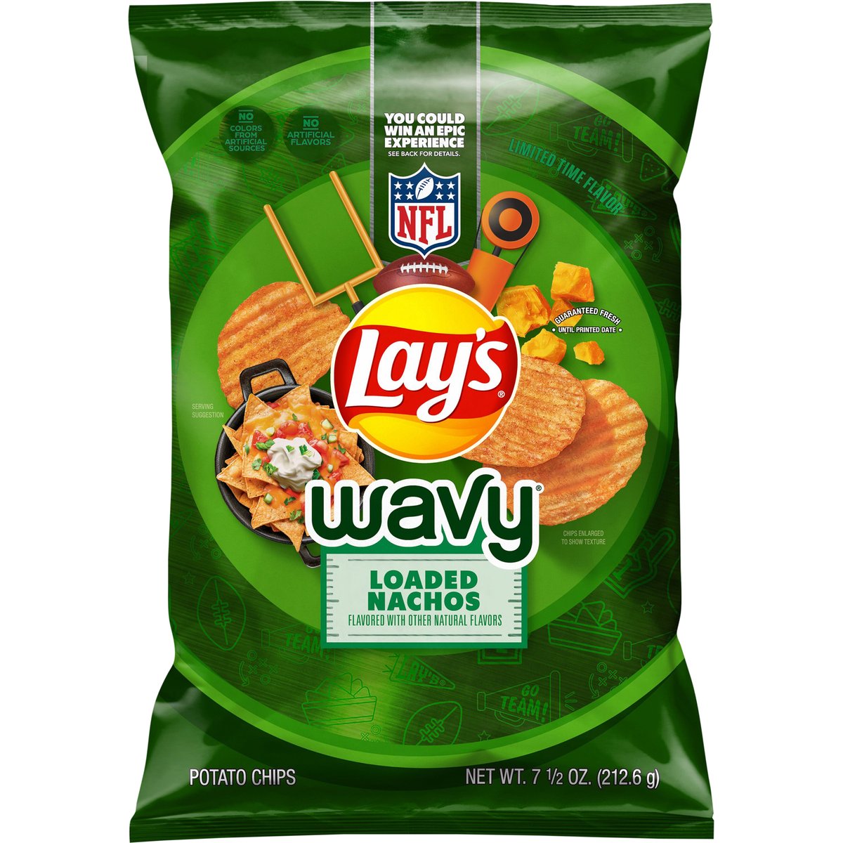 No artificial flavors. Flavored with other natural flavors. No colors from artificial sources. Limited time flavor. Official sponsor of the NFL. Guaranteed fresh until printed date or this snack is on us. Questions or comments? 1-800-352-4477. Mon-Fri 9:00am to 4:30pm CT email at fritolay.com. Lays.com. fritolay.com. Facebook. SmartLabel: Scan for more food information or call 1-800-352-4477. 1-800-352-4477. Find us on Lays.com. You could win an epic experience. See back for details. NFL. 2025 Football Season is here. Scan & you could win an NFL. Epic experience. Data rates may apply. You could win tickets to a game, autographed gear, and more! No purchase or payment necessary to enter or win. A purchase will not increase your chances of winning. Internet access required. Open to legal US residents of the 50 US, DC, 21+. Void where prohibited. Sweepstakes begins August 10, 2025 at 12:00 p.m. Central Time (CT) and ends December 27, 2025 at 11:59 p.m. CT. Entrant subject to Official Rules. Visit FritoLayEpicExperiences.com for Official Rules, including prize details, and limits. Sponsor: Frito-Lay. Inc. The NFL Entities have not offered or sponsored this sweepstakes in any way. Official sponsor of the NFL.