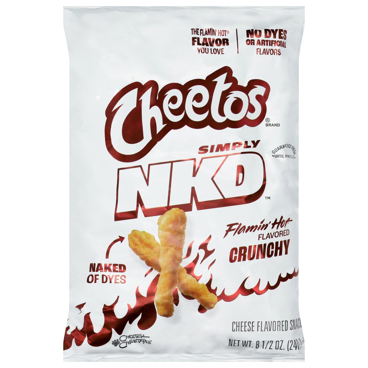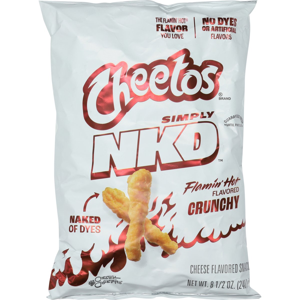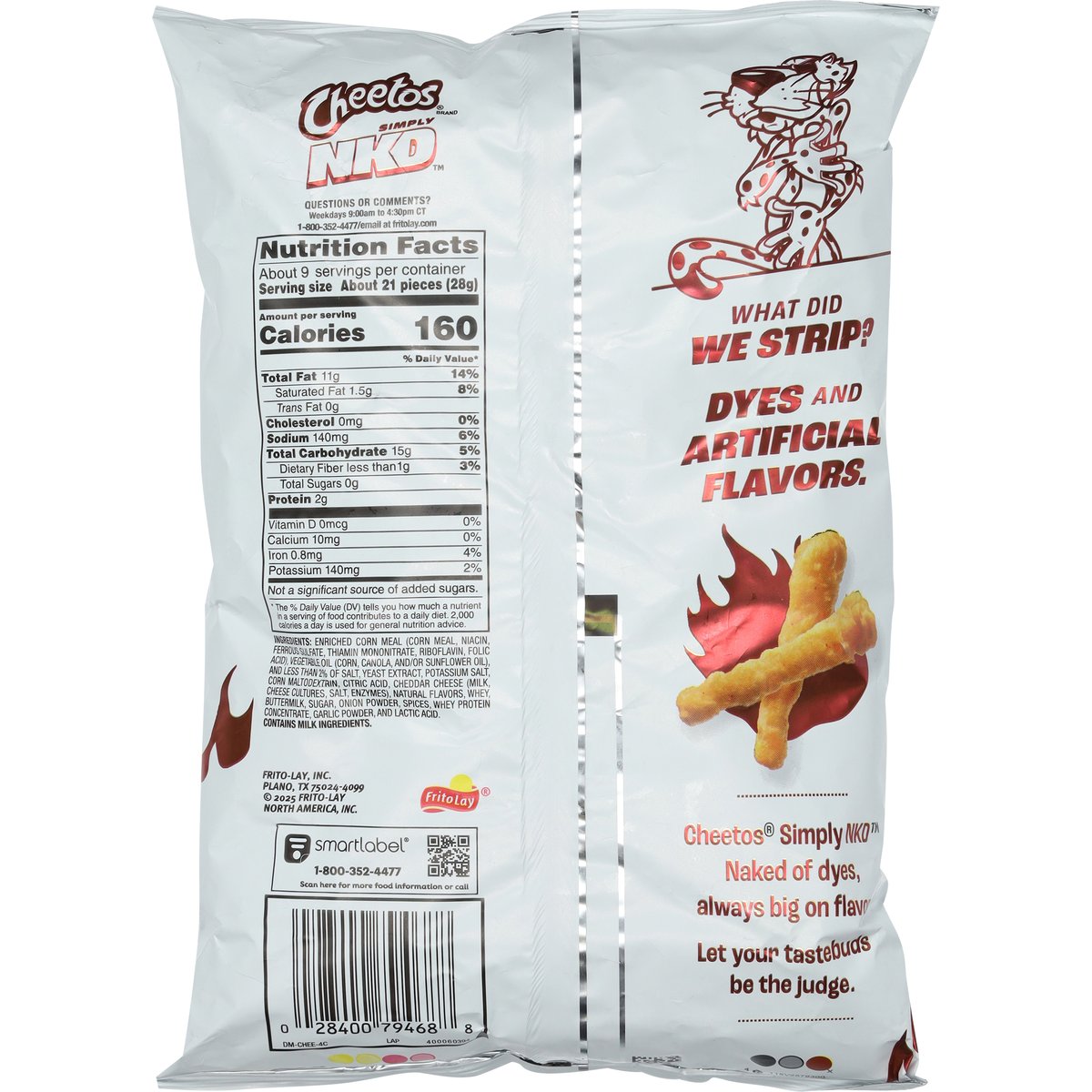 The flamin' hot flavor you love. No dyes or artificial flavors. Simply NKD. Naked of dyes. Chester Cheetah. What did we strip? Cheetos Simply NKD Naked of dyes, always big on flavor. Let your tastebuds be the judge. fritolay.com. SmartLabel: Scan for more food information or call 1-800-352-4477. Questions or comments? Weekdays 9:00am to 4:30pm CT 1-800-352-4477/email at fritolay.com.