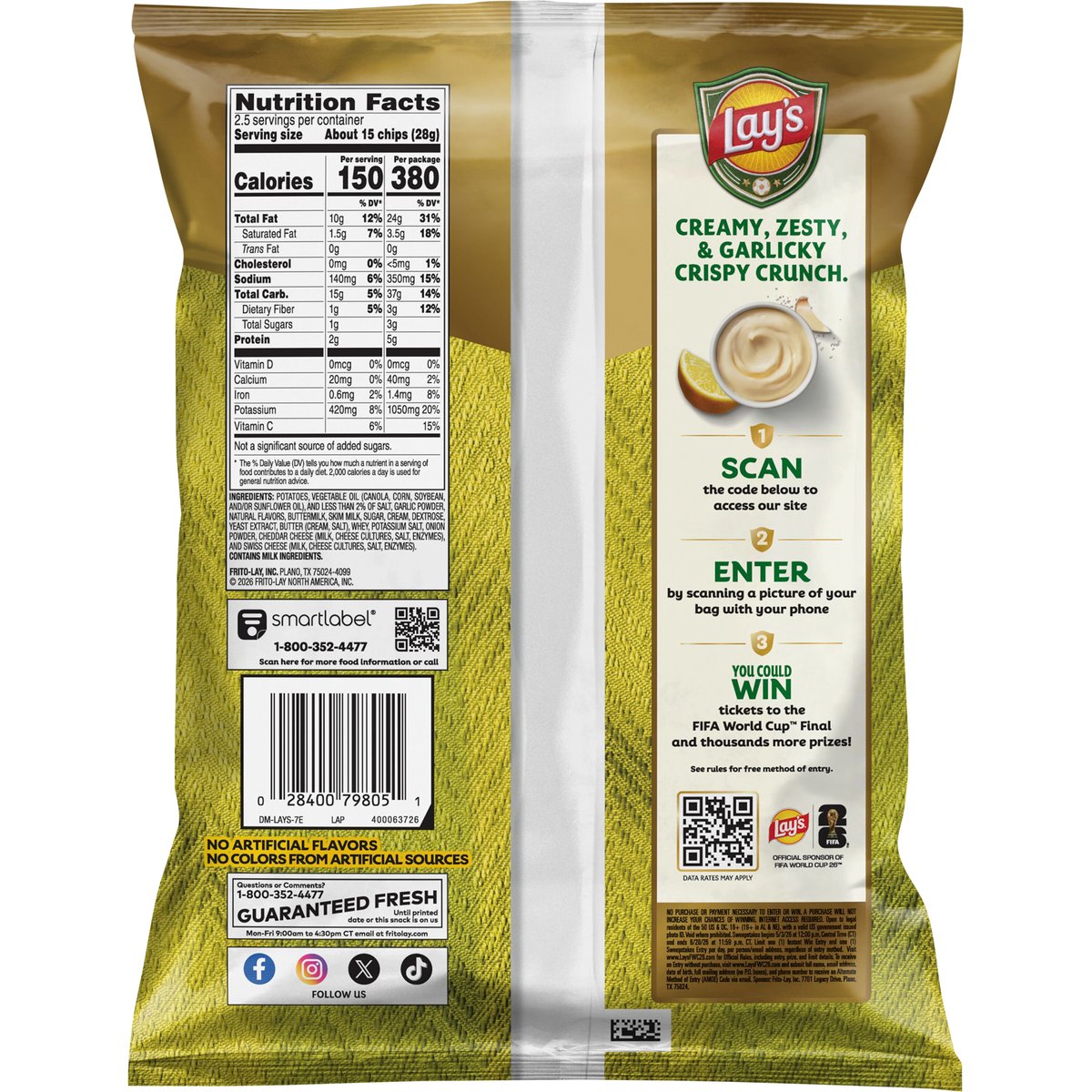 Flavored with other natural flavors. Est. 1938. No artificial flavors. No colors from artificial sources. Creamy, zesty, & garlicky crispy crunch. Guaranteed fresh until printed date or this snack is on us. fritolay.com. SmartLabel: Scan for more food information or call. Follow us Facebook. Instagram. X. TikTok. Questions or comments? 1-800-352-4477. Mon-Fri 9:00 am to 4:30 pm CT email at fritolay.com. Enter for a chance to win* tickets to the FIFA World Cup Final and more. 1. Scan the code below access our site. 2. Enter by scanning a picture of your bag with your phone. 3. You could win tickets to the FIFA World Cup Final and thousands more prizes! See rules for free method of entry. Data rates may apply. Official Sponsor of FIFA World Cup 26. No purchase or payment necessary to enter or win. A purchase will not increase your chances of winning. Internet access required. Open to legal residents of the 50 US & DC. 18+ (19+ in AL & NE), with a valid US government issued photo ID. Void where prohibited. Sweepstakes begins 5/3/26 at 12:00 p.m. Central Time (CT) and ends 6/20/26 at 11:59 p.m. CT. Limit one (1) Instant Win Entry and one (1) Sweepstakes Entry per day, per person/email address, regardless of entry method. Visit www.LaysFWC26.com for Official Rules, including entry. prize, and limit details. To receive an Entry without purchase, visit www.LaysFWC26.com and submit full name, email address. date of birth, full mailing address (no P.O. boxes), and phone number to receive an Alternate Method of Entry (AMOE) Code via email. Sponsor: Frito-Lay. Inc. 7701 Legacy Drive, Plano, TX 75024. * 05/03 - 06/20/26. See for details.