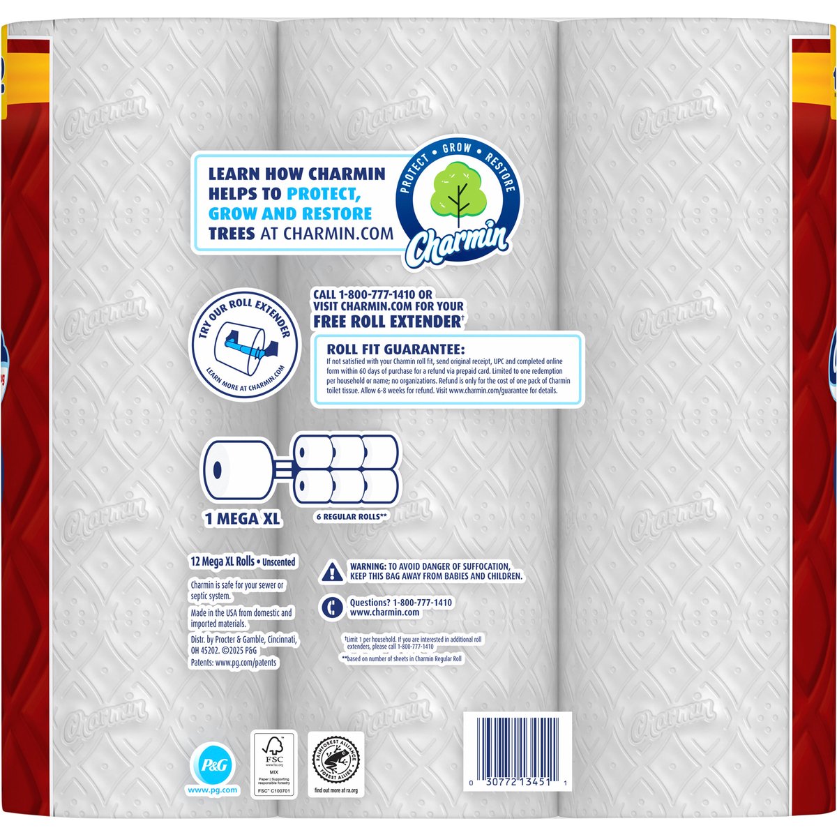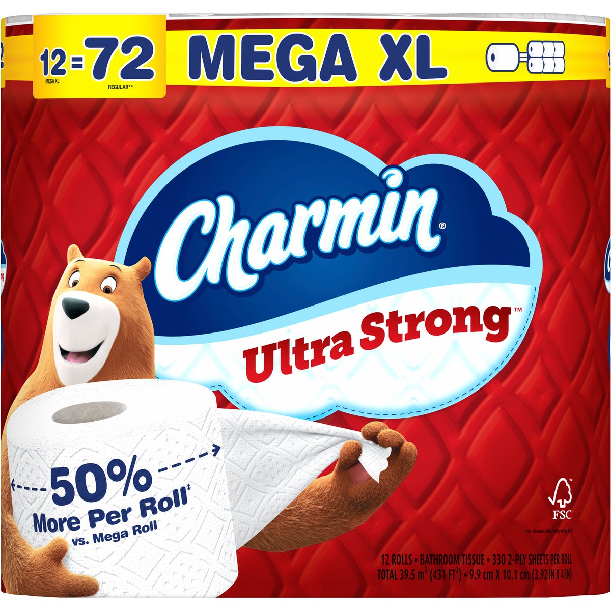 12 rolls. Bathroom tissue. 330 2-ply sheets per roll. Total 39.5 sq m (431 sq ft); 9.9 cm x 10.1 cm (3.92 in x 4 in). 12 mega XL = 72 regular*. 1 mega XL = 6 regular rolls*. Unscented. Charmin is safe for your sewer or septic system. *Based on number of sheets in Charmin Regular Roll. Roll fit Guarantee: If not satisfied with your Charmin roll fit, send original receipt, UPC and completed online form within 60 days of purchase for a refund via prepaid card. Limited to one redemption per house hold or name; no organizations. Refund is only for the cost of one pack of Charmin toilet tissue. Allow 6-8 weeks for refund. Visit www.charmin.com/guarantee for details. www.charmin.com. www.pg.com. how2recycle.info. Learn more at charmin.com. Questions? 1-800-777-1410. www.charmin.com. Call 1-800-777-1410 or visit charmin.com for your free roll extender (Limit 1 per household. If you are interested in additional roll extenders, please call 1-800-777-1410). Learn how Charmin helps to protect, grow and restore trees at, charmin.com. Try our roll extender. Learn more at charmin.com. Protect; grow; restore. Learn how Charmin helps to protect, grow and restore trees at charmin.com. FSC: Mix - Paper Supporting responsible forestry. www.fsc.org. Rainforest Alliance Certified. Find out more at ra.org. Made in the USA from domestic and imported materials.