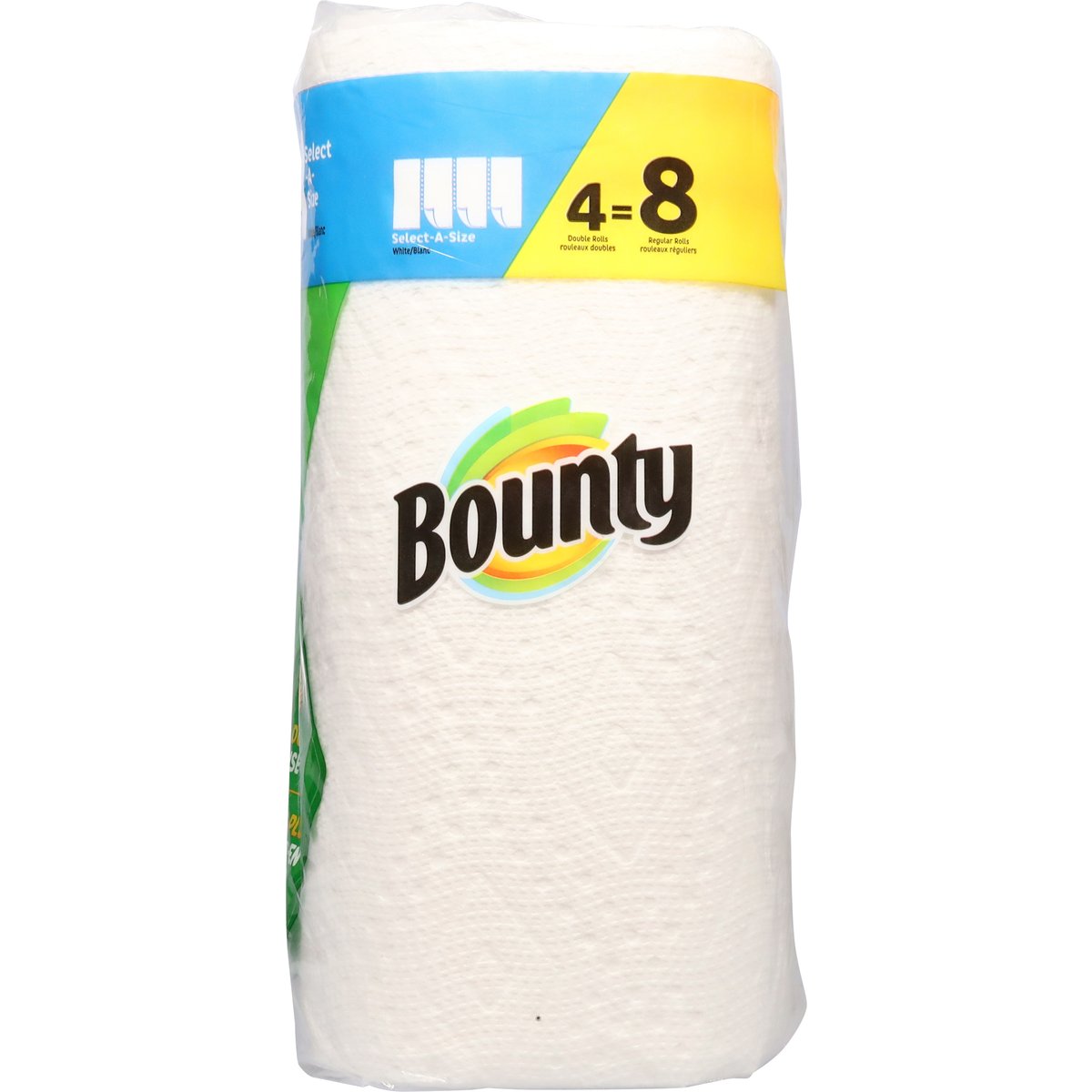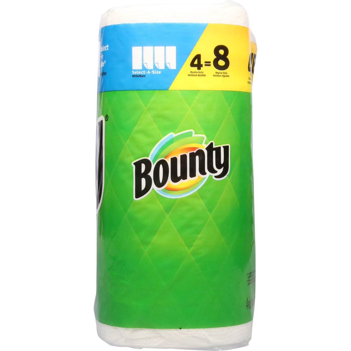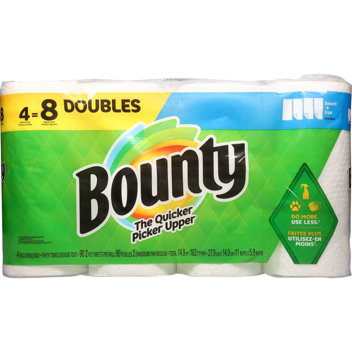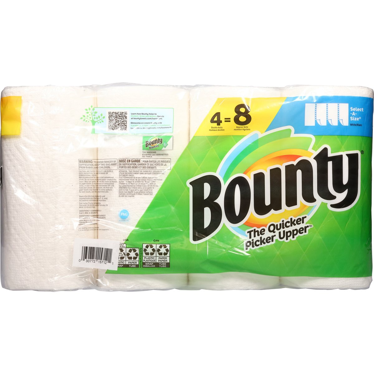 27.9 cm x 14.9 cm (11 in x 5.9 in). Total 14.9 sqm (162 sq ft). 4 double rolls = 8 regular rolls. The quicker picker upper*. Do more. Use less(a). (a) vs. the US leading ordinary brand customizable sheet. * vs. leading ordinary brand. how2recycle.info. www.BountyTowels.com. www.pg.com. Questions? Comments? Call 1-800-9-Bounty. Try on Bounty Napkins. Learn how Bounty helps to protect, grow and restore forests at bounty.towels.com/learnmore. Made in the USA from domestic and imported materials.