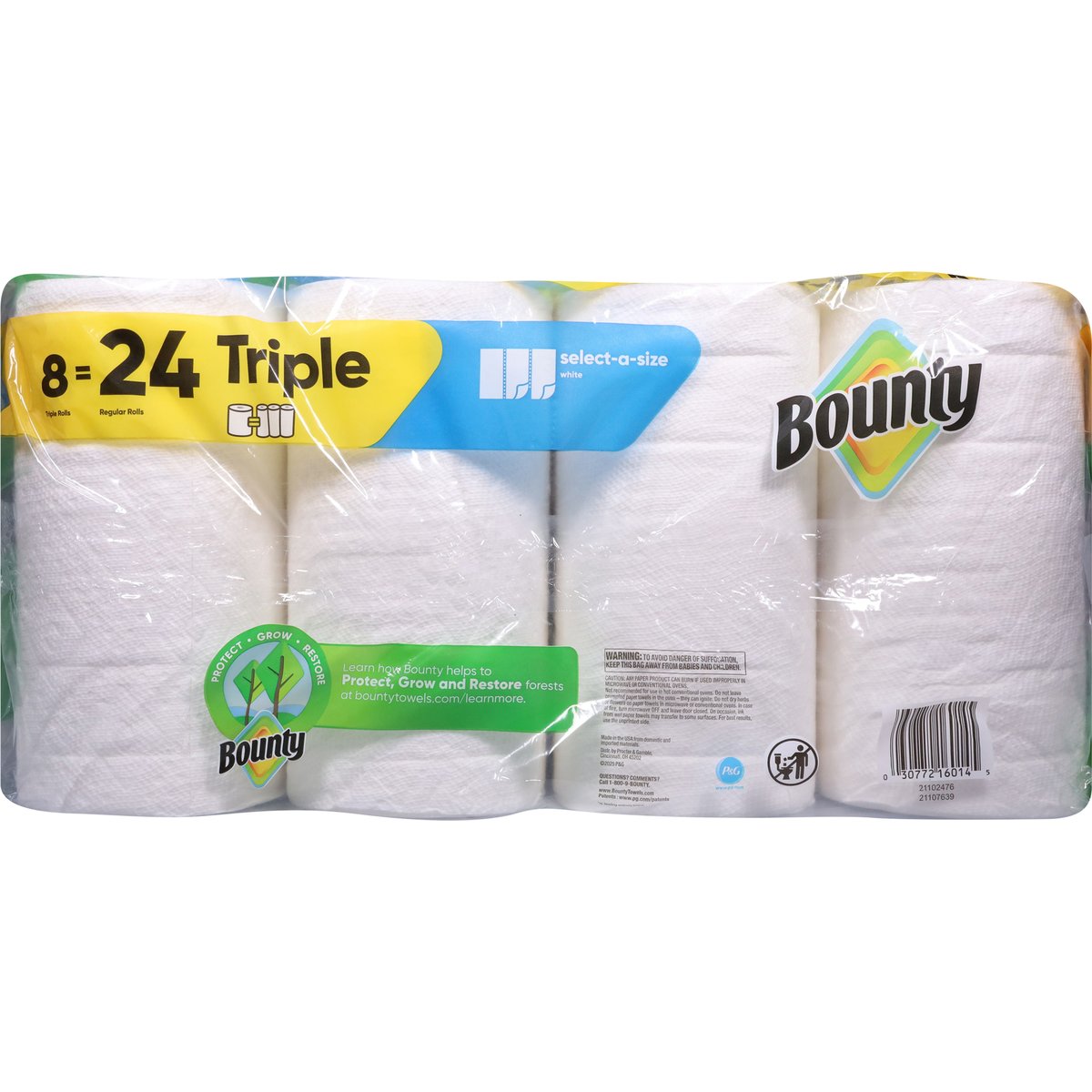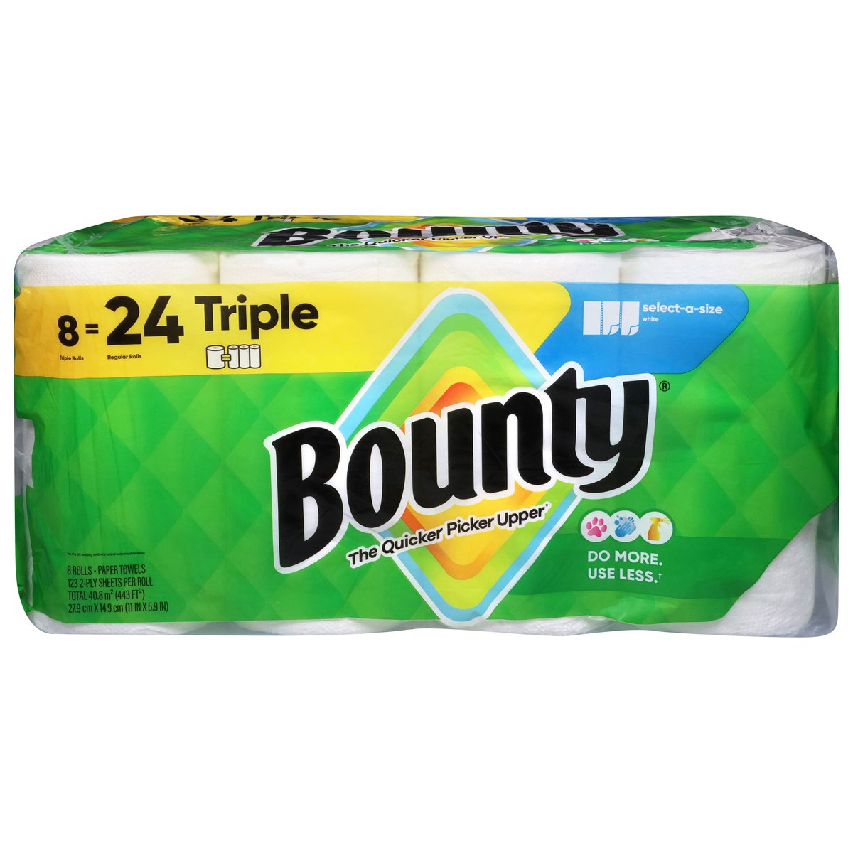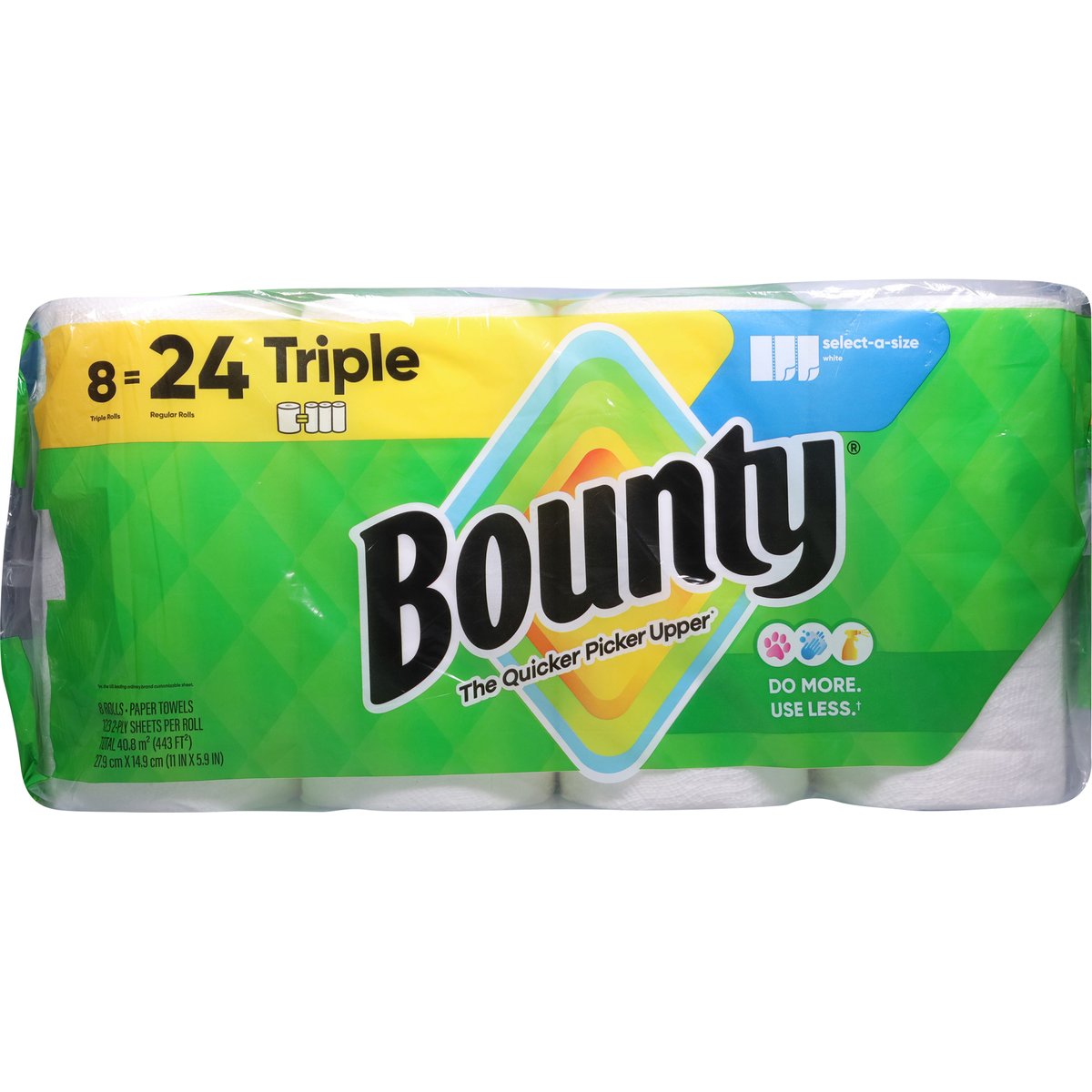 27.9 cm x 14.9 cm (11 in x 5.9 in). Total 40.8 sq m (443 sq ft). 8 triple rolls = 24 regular rolls. Select-a-size. Do more. Use less (a). The quicker picker upper*. Protect. Grow. Restore. * vs. leading ordinary brand. (a) vs. the US leading ordinary brand customizable sheet. www.bountytowels.com. www.pg.com. Questions? Comments? Call 1-800-9-Bounty. Protect. Grow. Restore. Learn how Bounty helps to protect, grow and restore forests at bountytowels.com/learnmore. Made in the USA from domestic and imported materials.