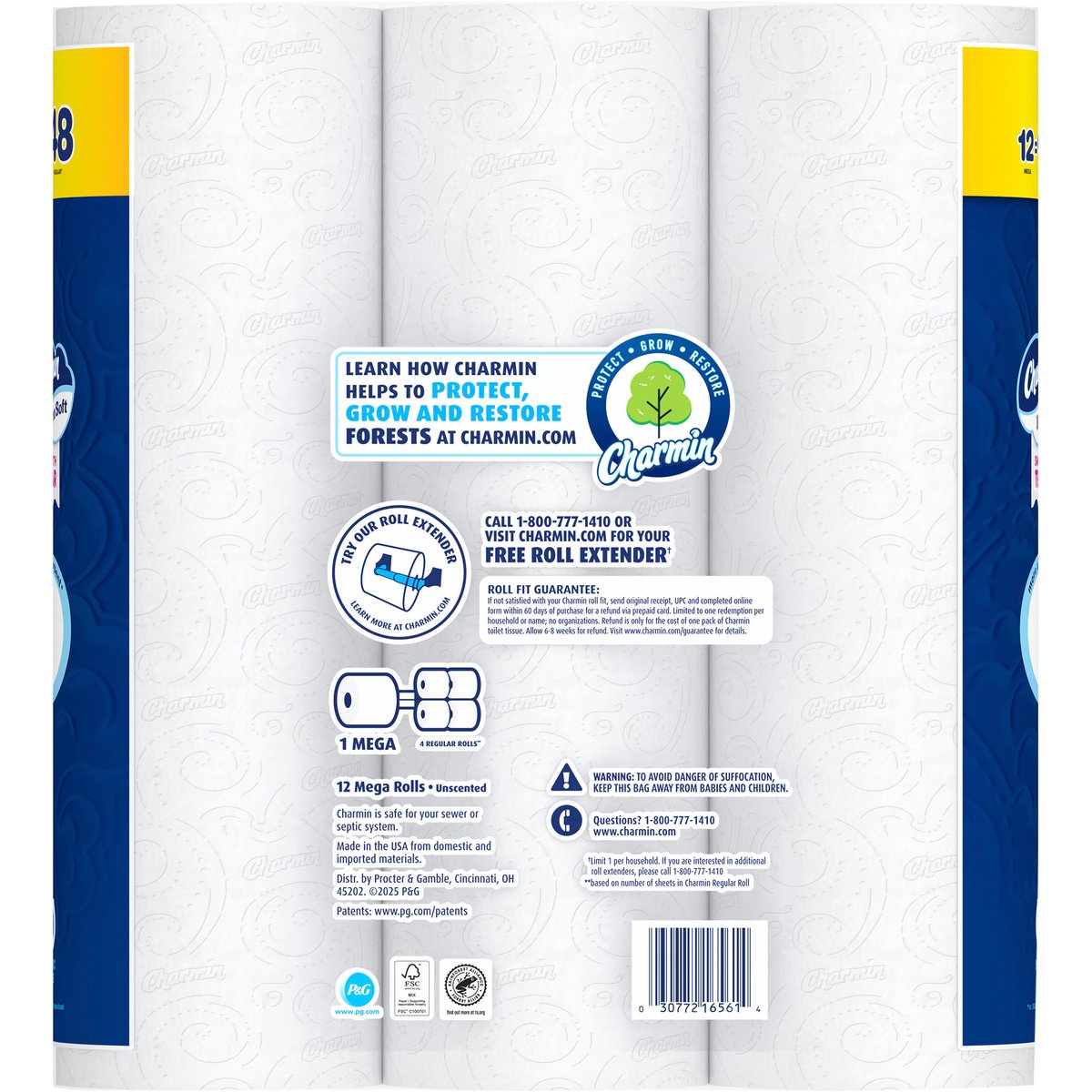 208 2-ply sheets per roll. Total 24.9 sq m (271 sq ft); 9.9 cm x 10.1 cm (3.92 in x 4 in). 12 mega = 48 regular**. Smooth tear. Trusted softness, better tear!*. Charmin is safe for your sewer or septic system. ** Based on number of sheets in Charmin regular roll. Roll Fit Guarantee: if not satisfied with your Charmin roll fit, send original receipt, UPC and completed online form within 60 days of purchase for a refund via prepaid card. Limited to one redemption per household or name; no organizations. Refund is only for the cost of one pack of charmin toilet tissue. Allow 6-8 weeks for refund. Visit www.Charmin.com/guarantee for details. www.charmin.com. www.pg.com. Questions? 1-800-777-1410. www.charmin.com. FSC: Mix - Paper | Supporting responsible forestry. www.fsc.org. Rainforest Alliace: Forest allies. Find our more at ra.org. Made in the USA from domestic and imported materials.