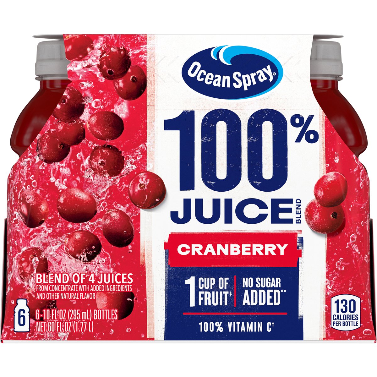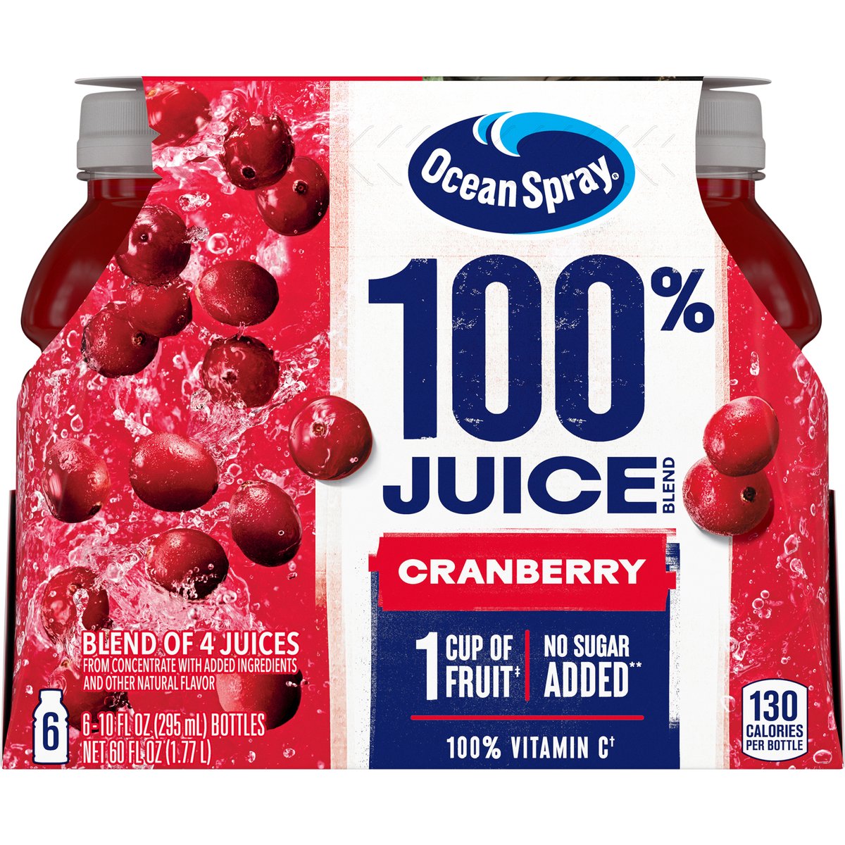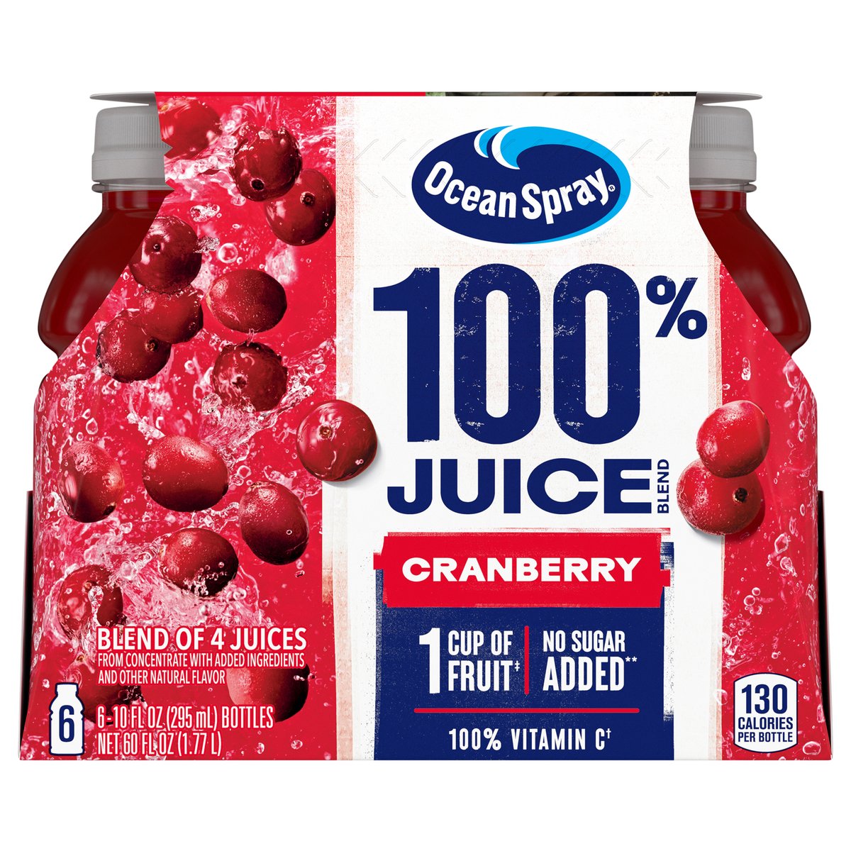 Blend of 4 juices from concentrate with added ingredients and other natural flavor. 130 calories per bottle. 100% Vitamin C (a). No sugar added**. (a) 100% daily value of vitamin C per 10 fl oz serving. **Not a low calorie food - See Nutrition Facts for sugar and calorie content. 1 cup of fruit (b). Born tart. Raised Bold. The family living the bog life since 1984. Made possible by around 700 family farmers with mindful grit and maverick spirit. The family living the bog life since 1984. Pasteurized. (b) Each 8 FL OZ glass equal 1 cup of fruit. The USDA MyPlate recommends a daily intake of 2 cups of fruit for a 2,000-calorie diet. Thanks for choosing ocean spray: If you have questions or comments, please call 1-800-662-3263. Please have the entire package handy. Made possible by around 700 family farmers with mindful grit and maverick spirit.