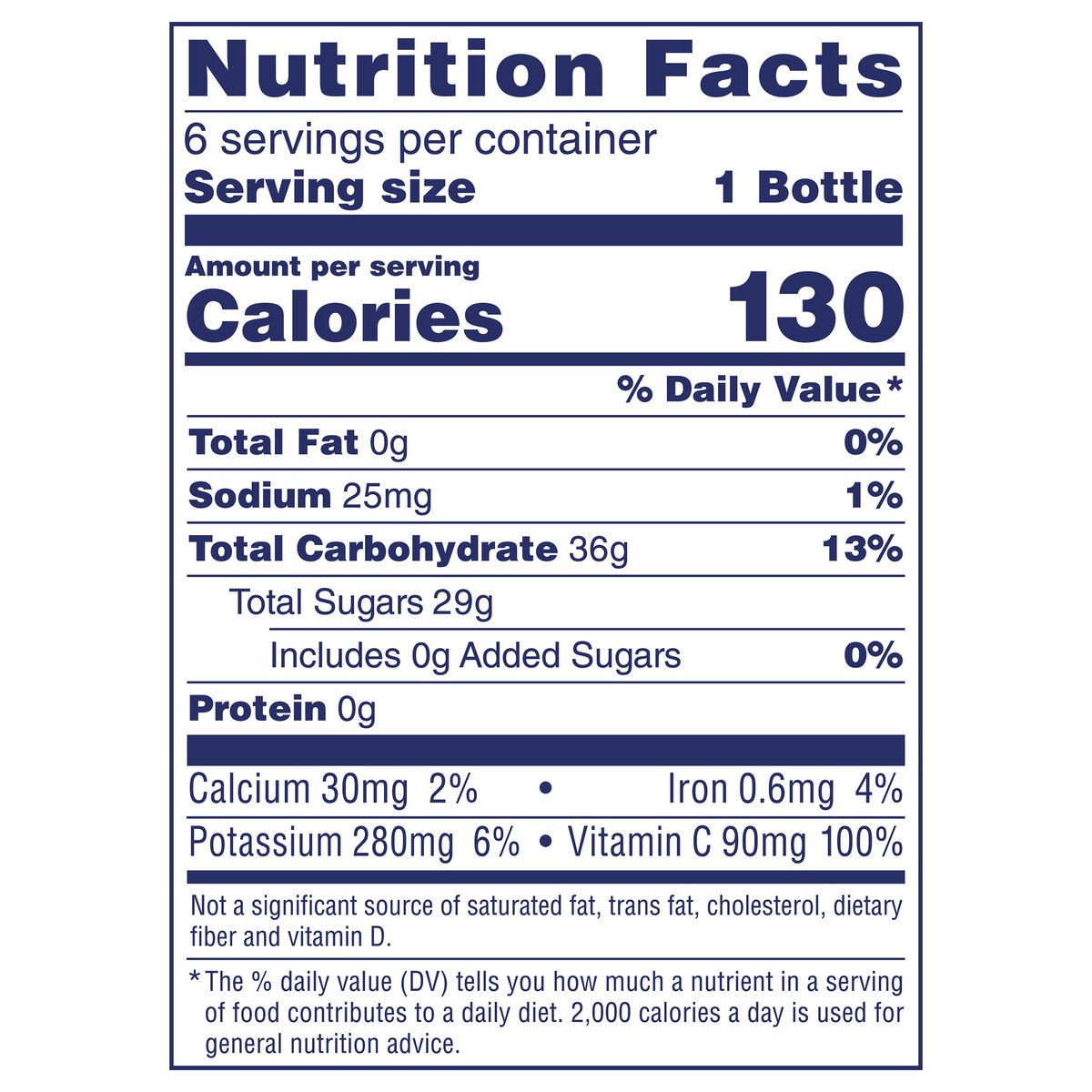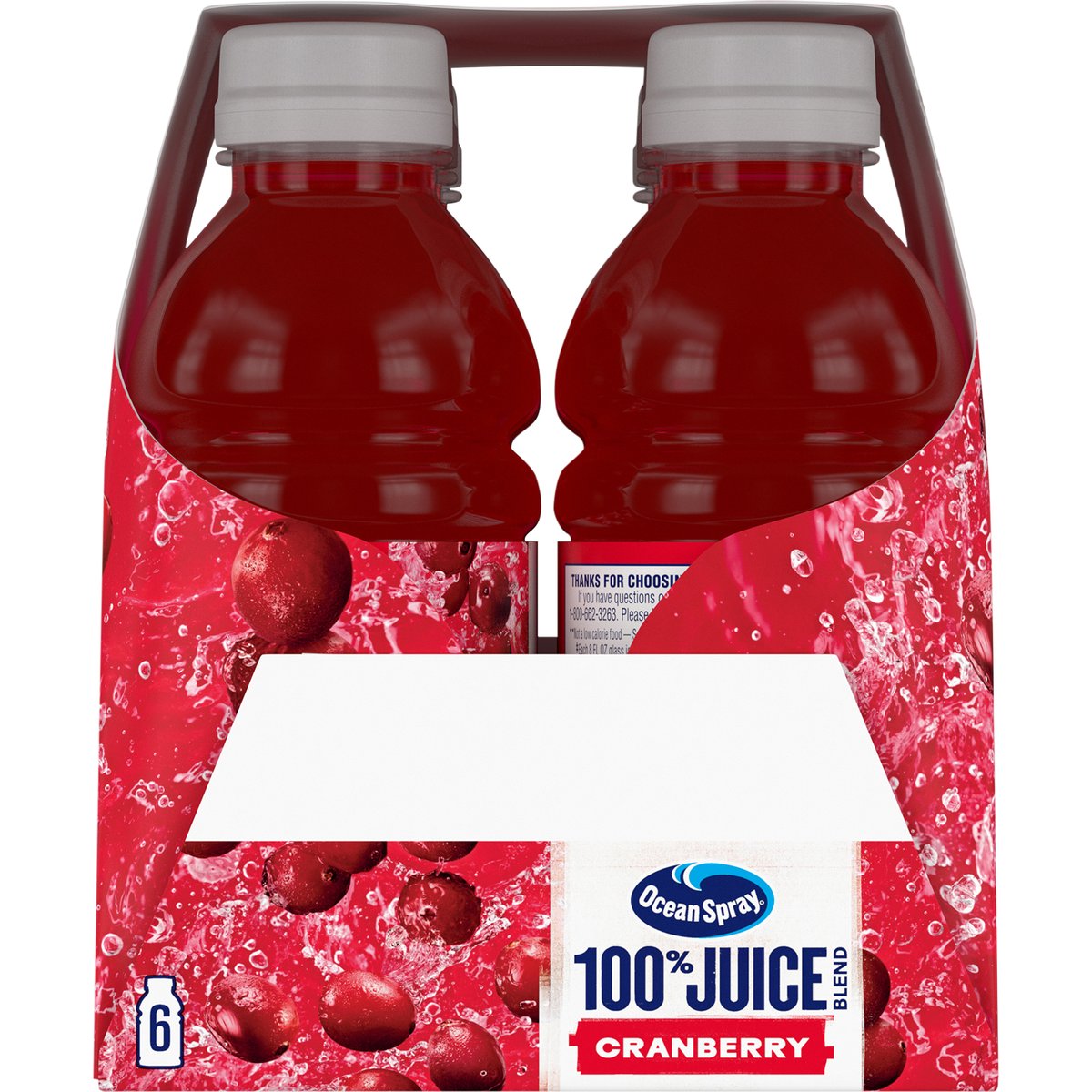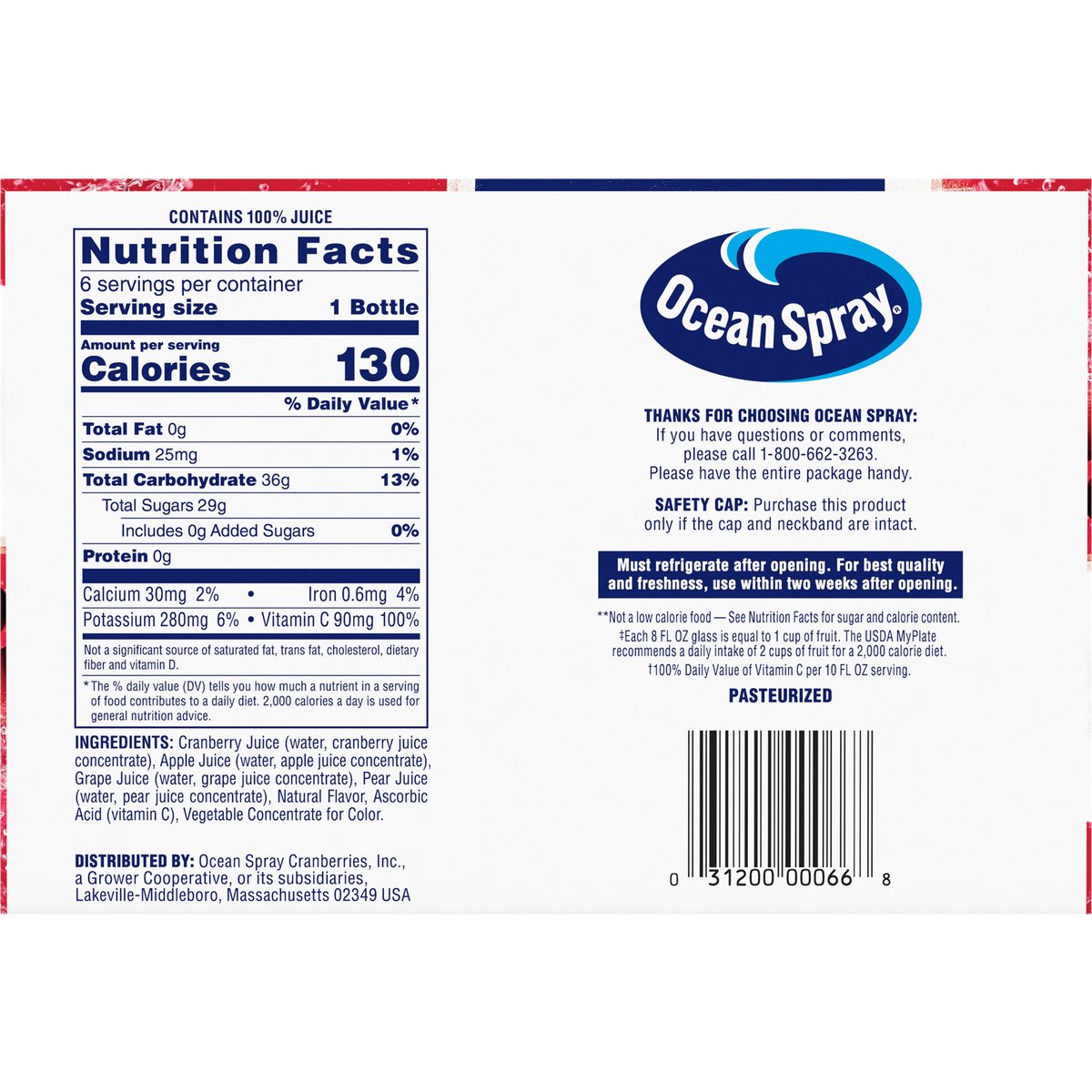 Blend of 4 juices from concentrate with added ingredients and other natural flavor. 130 calories per bottle. 100% Vitamin C (a). No sugar added**. (a) 100% daily value of vitamin C per 10 fl oz serving. **Not a low calorie food - See Nutrition Facts for sugar and calorie content. 1 cup of fruit (b). Born tart. Raised Bold. The family living the bog life since 1984. Made possible by around 700 family farmers with mindful grit and maverick spirit. The family living the bog life since 1984. Pasteurized. (b) Each 8 FL OZ glass equal 1 cup of fruit. The USDA MyPlate recommends a daily intake of 2 cups of fruit for a 2,000-calorie diet. Thanks for choosing ocean spray: If you have questions or comments, please call 1-800-662-3263. Please have the entire package handy. Made possible by around 700 family farmers with mindful grit and maverick spirit.