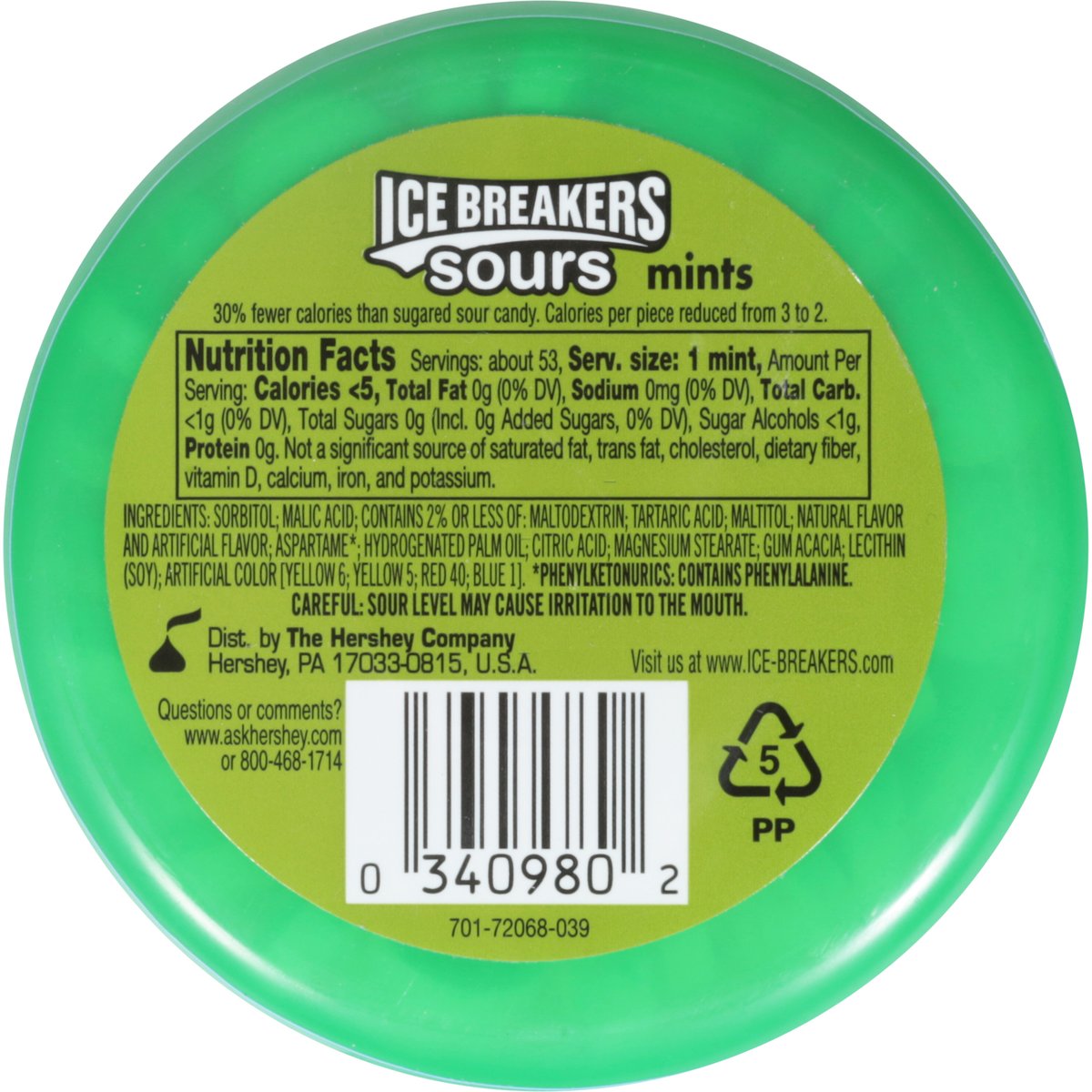 Watermelon. Green apple. Tangerine. Natural & artificial flavors. Sugar free. 30% fewer calories than sugared sour candy. Calories per piece reduced from 3 to 2. With flavor crystals. www.askhershey.com. www.ice-breakers.com. Questions or comments? www.askhershey.com or 800-468-1714. Visit us at www.Ice-Breakers.com.