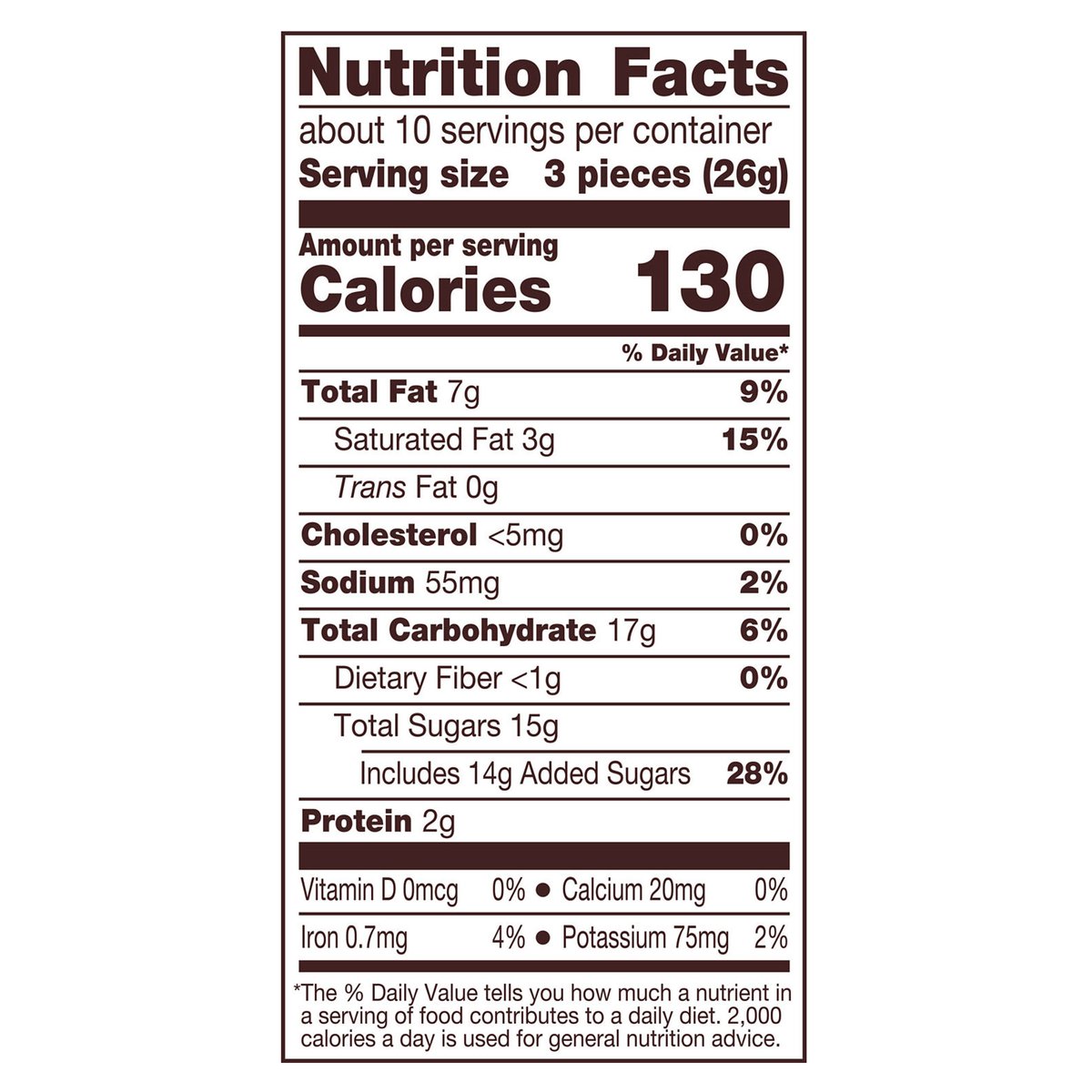 Milk chocolate & peanut butter stuffed with shaped sprinkles. 130 calories per 3 pieces. Per 3 piece serving: 130 calories; 3 g sat fat (15% DV); 55 mg sodium (2% DV); 15 g total sugars. A sprinkle of perfection and then some. www.hersheys.com. www.askhershey.com. SmartLabel: Scan or call 1-800-468-1714 for more food information. Questions or comments? www.askhersheys.com or 800-468-1714. Visit us at www.hersheyland.com.