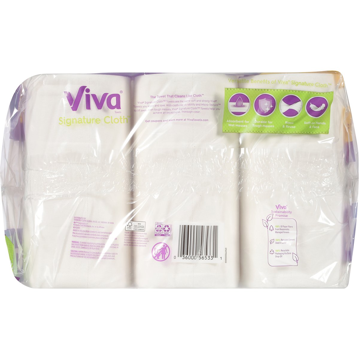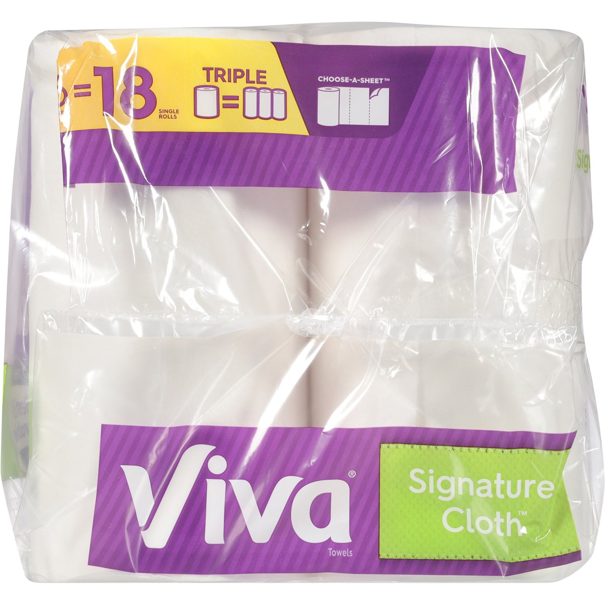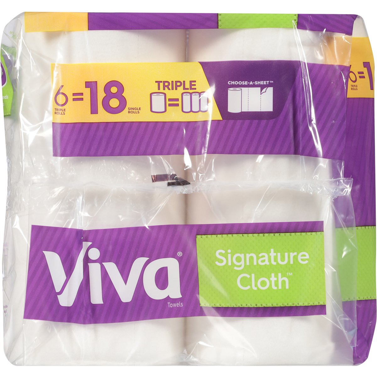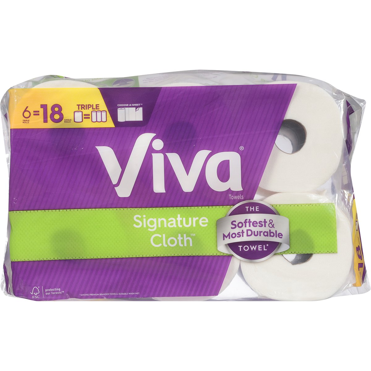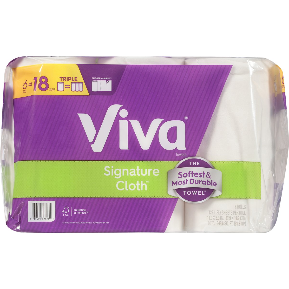 129 1-ply sheets per roll; 11.0 x 5.9 in. (27.9 x 14.9 cm) Total 349.6 sq. ft. (31.8 m2). 6 triple rolls = 18 single rolls. Triple. Choose-a-sheet. The softest & most durable towel*. The Towel That Cleans Like Cloth: Viva Signature Cloth Towels are the same soft and strong Viva Towels you know and love. With cloth-like durability and micro-texture to lift away even tough messes, Viva Signature Cloth Towels help you achieve an exceptional, thorough clean. Versatile Benefits of Viva Signature Cloth: Absorbent for wet messes; Durable for tough messes; Rinse & reuse; Soft on hands & face. * Among national brands, most durable when wet. VivaTowels.com. how2recycle.info. Get coupons and learn more at VivaTowels.com. If you have questions or comments, please call toll free 1-800-553-3639. FSC. Protecting our forests. Mix: Paper | Supporting responsible forestry. www.fsc.org. FSC certification ensures that the paper used in our towels comes from responsibly managed forests and other verifiable sources that meet specific environmental, social, and economic standards. Viva Sustainability Promise. 100% of paper fibers from responsibly managed forests. 100% recycled content used in cores. 100% recyclable packaging via store drop-off. Made in the USA from domestic and imported material.