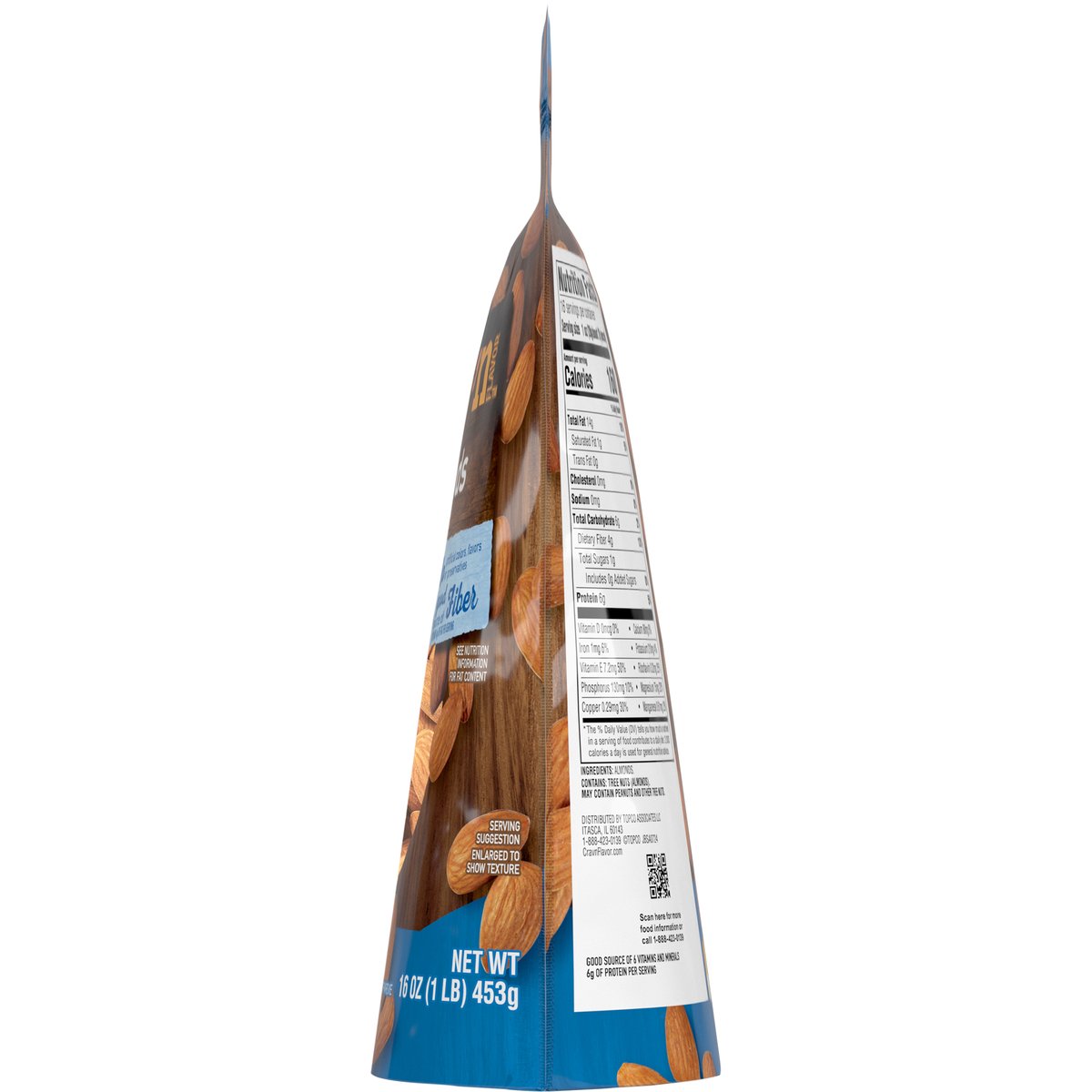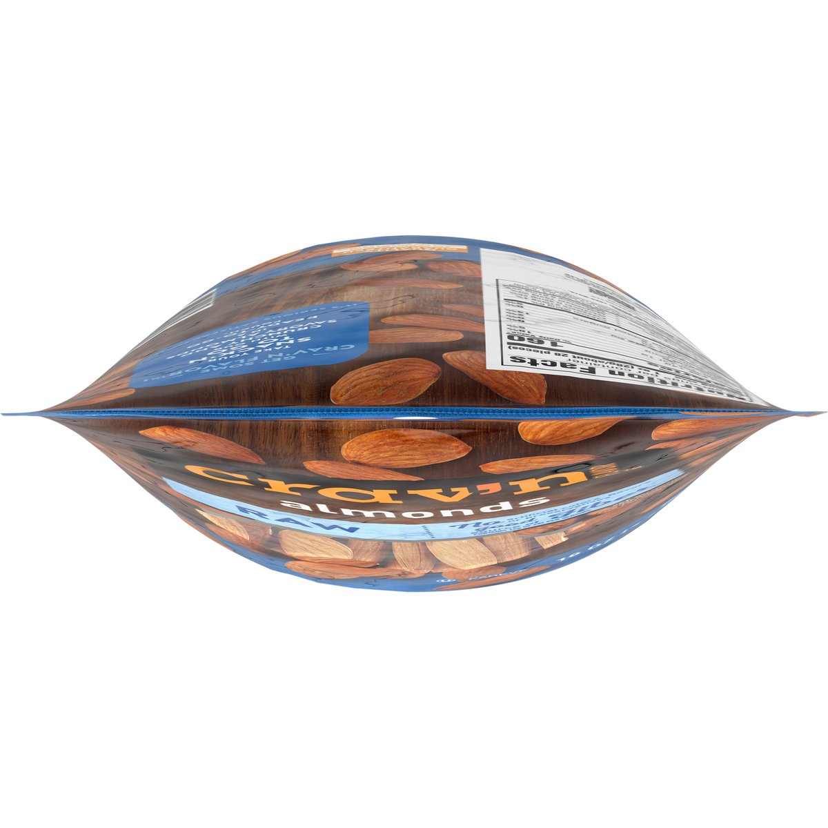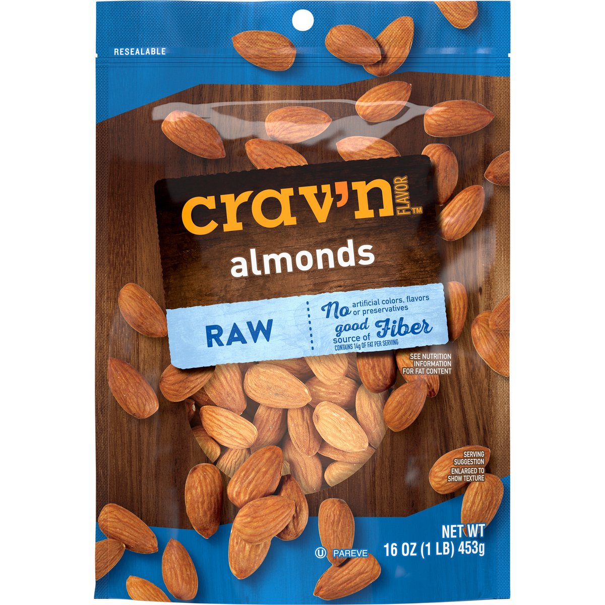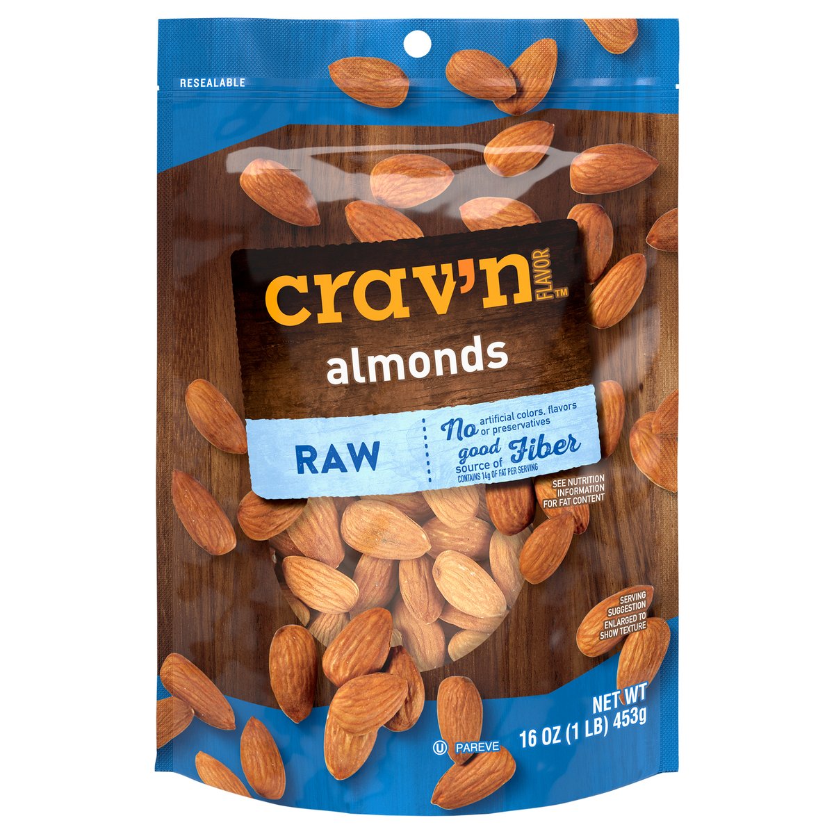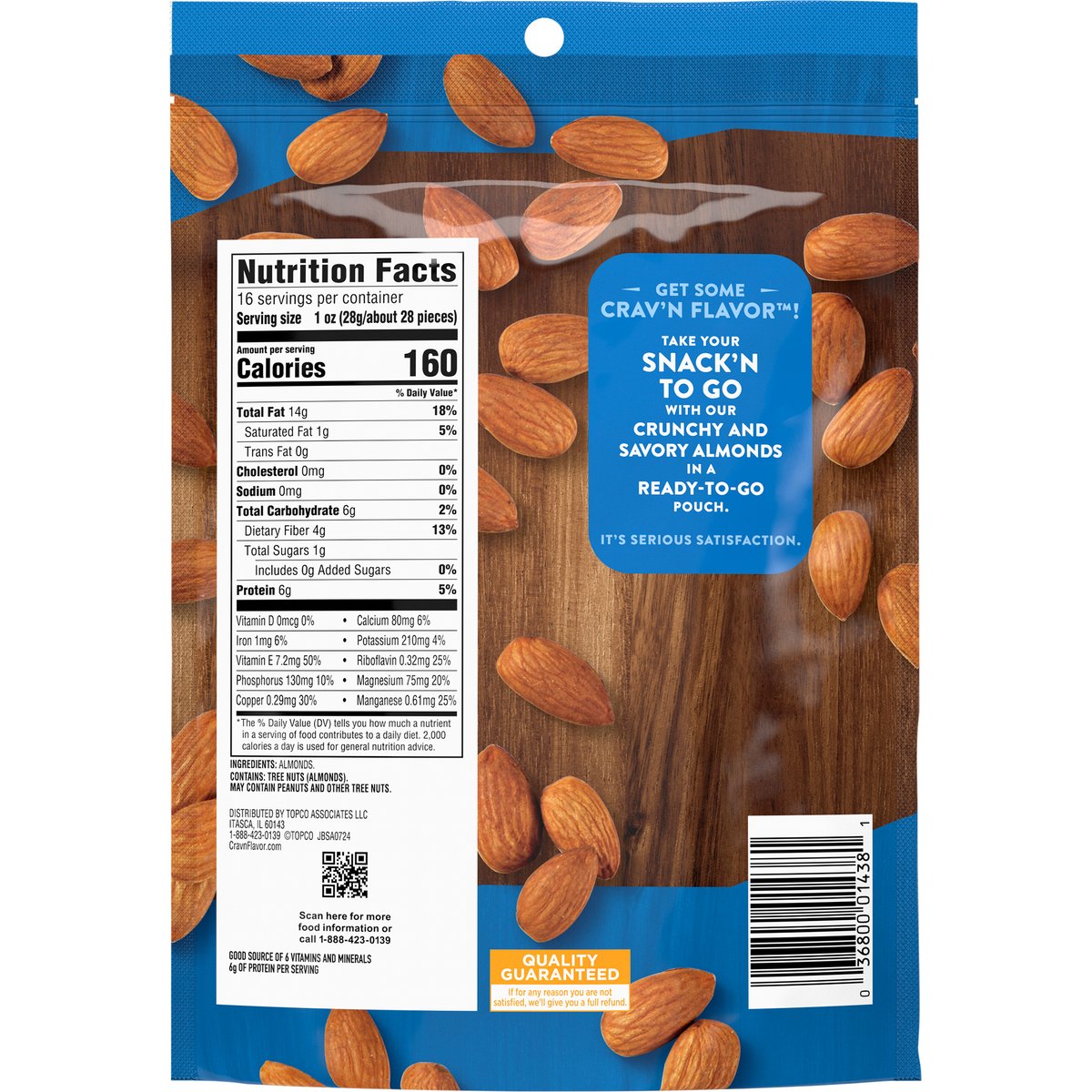 No artificial colors, flavors or preservatives. Contains 14 g of fat per serving. 6 g of protein per serving. Good source of fiber. See nutrition information for fat content. Good source of 6 vitamins and minerals. Get some Crav'n Flavor! Take your snack'n to go with our crunchy and savory almonds in a ready-to-go pouch. It's serious satisfaction. Quality Guaranteed: If for any reason you are not satisfied, we'll give you a full refund. CravnFlavor.com. Scan for more food information or call 1-888-423-0139. 1-888-423-0139. Resealable.