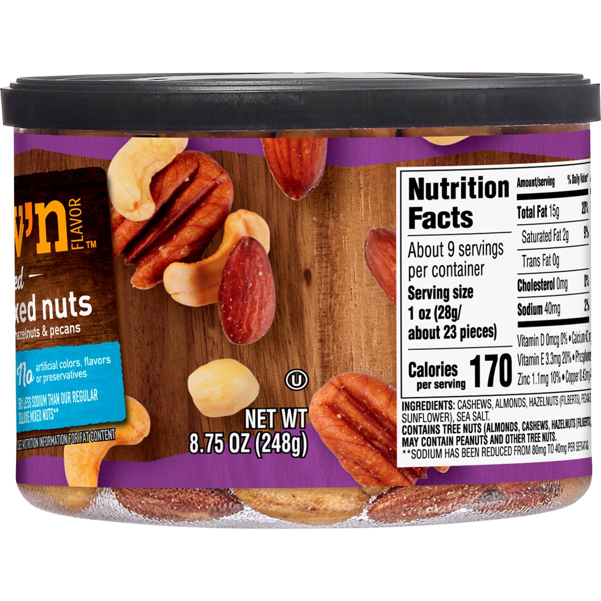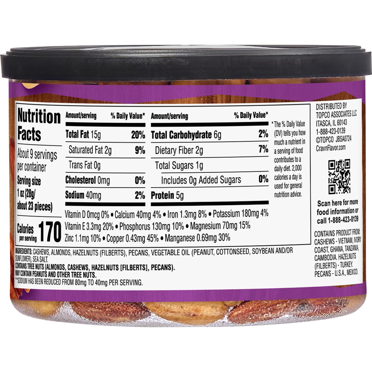 Deluxe mixed nuts with cashews, almonds, hazelnuts & pecans. No artificial colors, flavors or preservatives. 50% less sodium than our Regular Deluxe Mixed Nuts**. See nutrition information for fat content. **Sodium has been reduced from 80 mg to 40 mg per serving. Quality Guaranteed: If for any reason you are not satisfied, we'll give you a full refund. CravnFlavor.com. Scan for more food information or call 1-888-423-0139. 1-888-423-0139. Reduce. Re-use. Recycle. Renew. Contains Product from: Cashews - Vietnam, Ivory Coast, Ghana, Tanzania, Cambodia. Hazelnuts (Filberts) - Turkey. Pecans - U.S.A., Mexico.