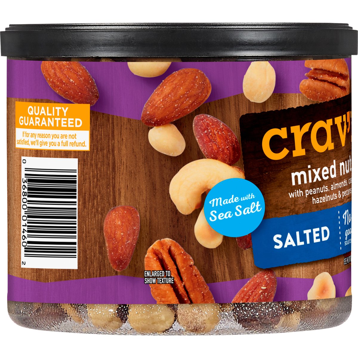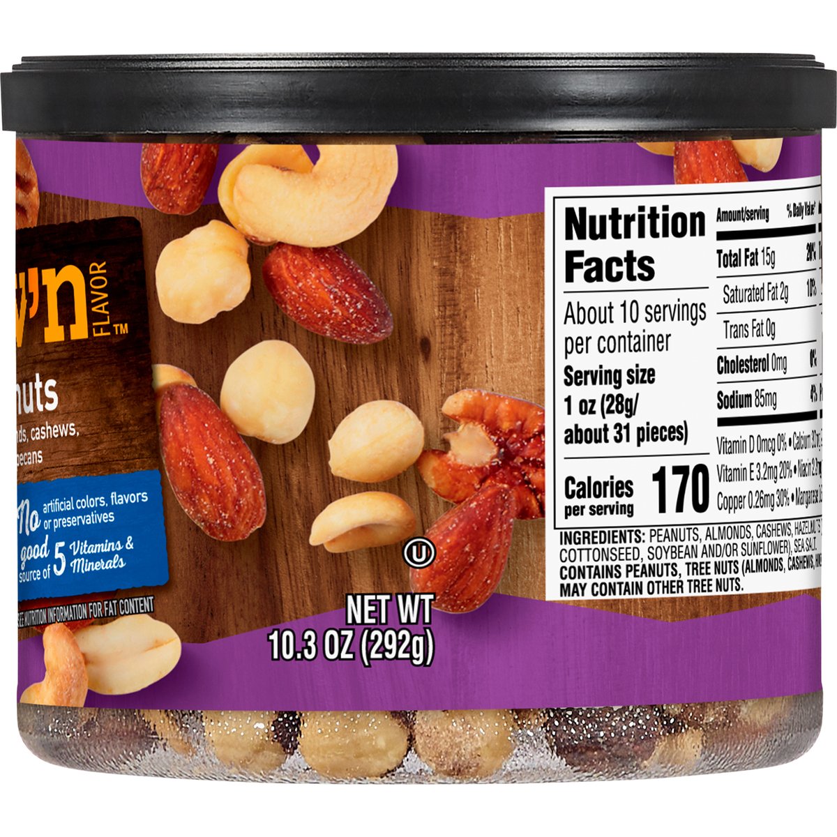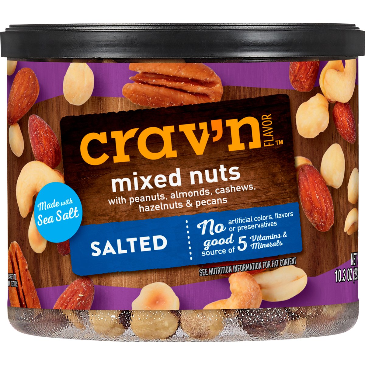 Mixed nuts with peanuts, almonds, cashews, hazelnuts & pecans. No artificial colors, flavors or preservatives. Good source of 5 vitamins & minerals. See nutrition information for fat content. Quality Guaranteed: If for any reason you are not satisfied, we'll give you a full refund. CravnFlavor.com. Scan for more food information or call 1-888-423-0139. 1-888-423-0139. Reduce. Re-use. Recycle. Renew. Contains Product from: Cashews - Vietnam, Ivory Coast, Ghana, Tanzania, Cambodia. Hazelnuts (Filberts) - Turkey. Pecans - U.S.A., Mexico.