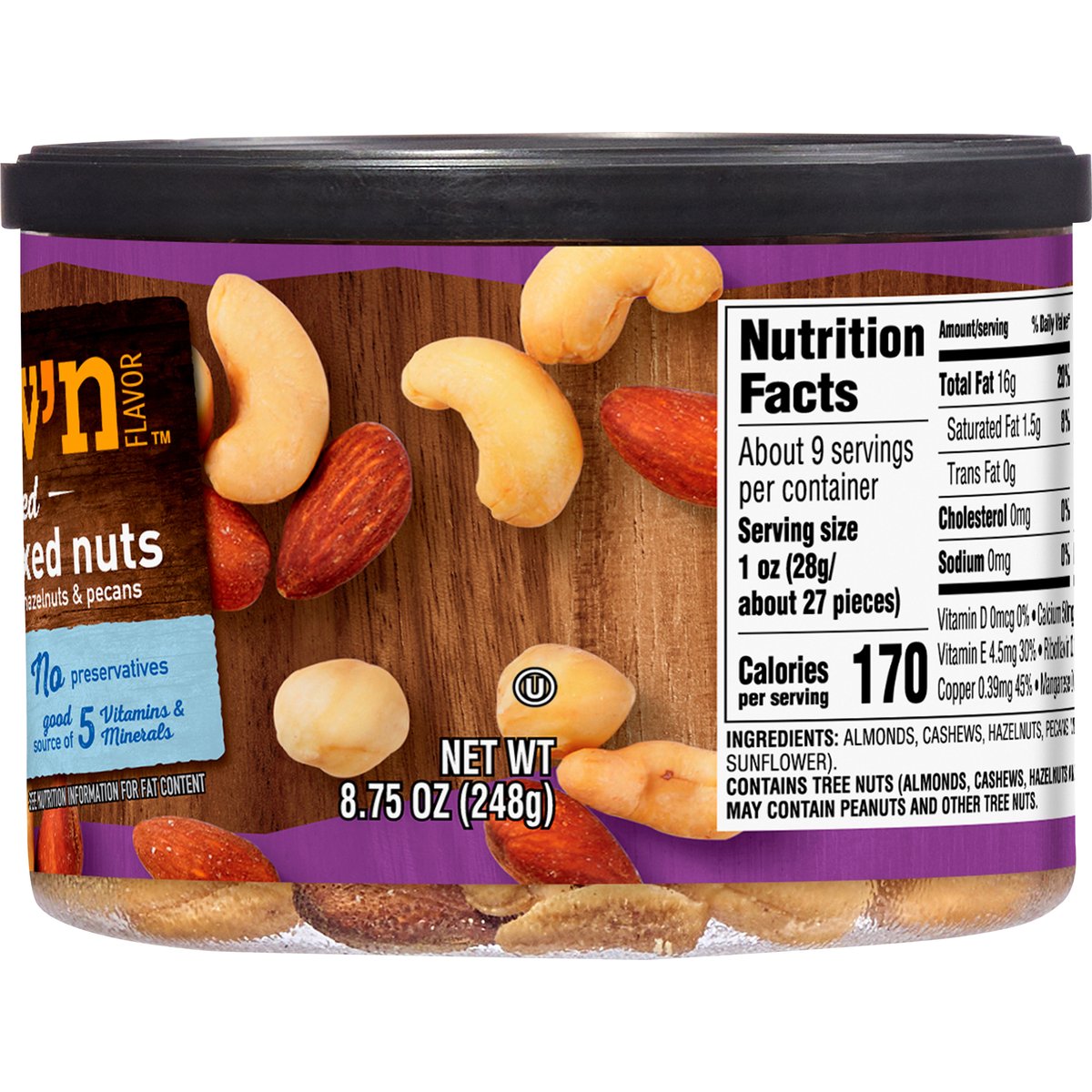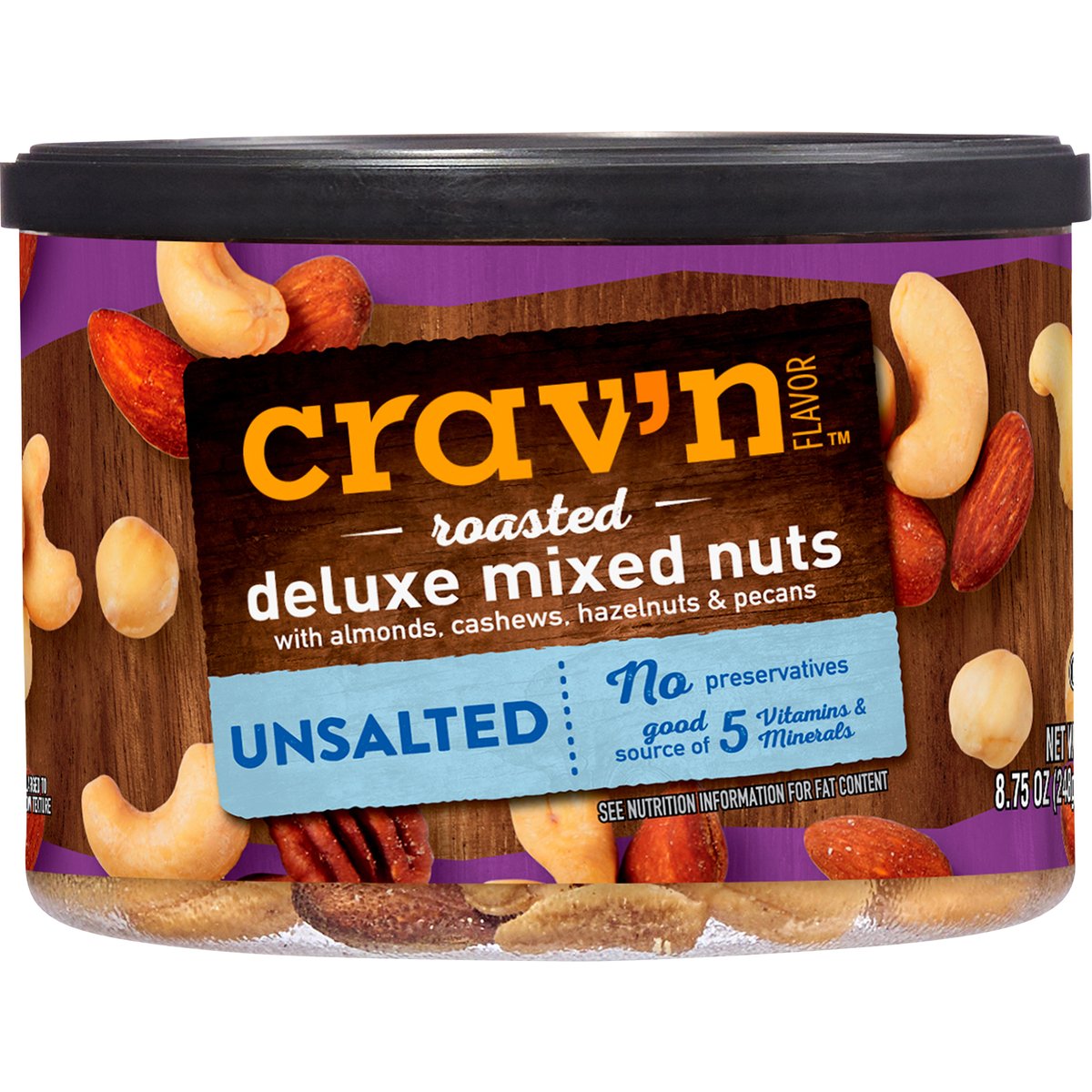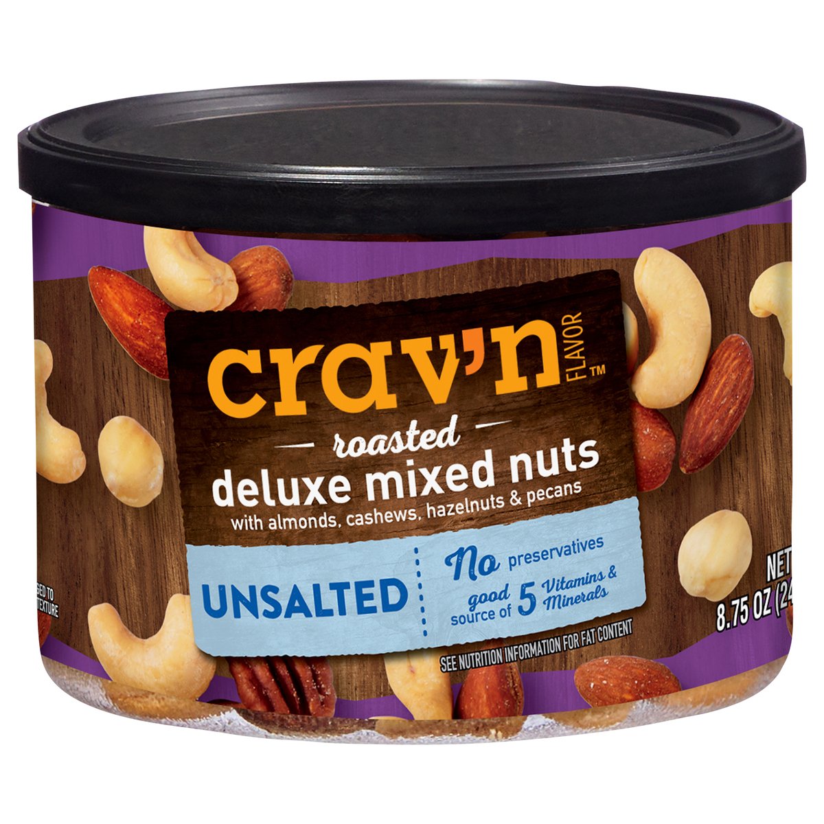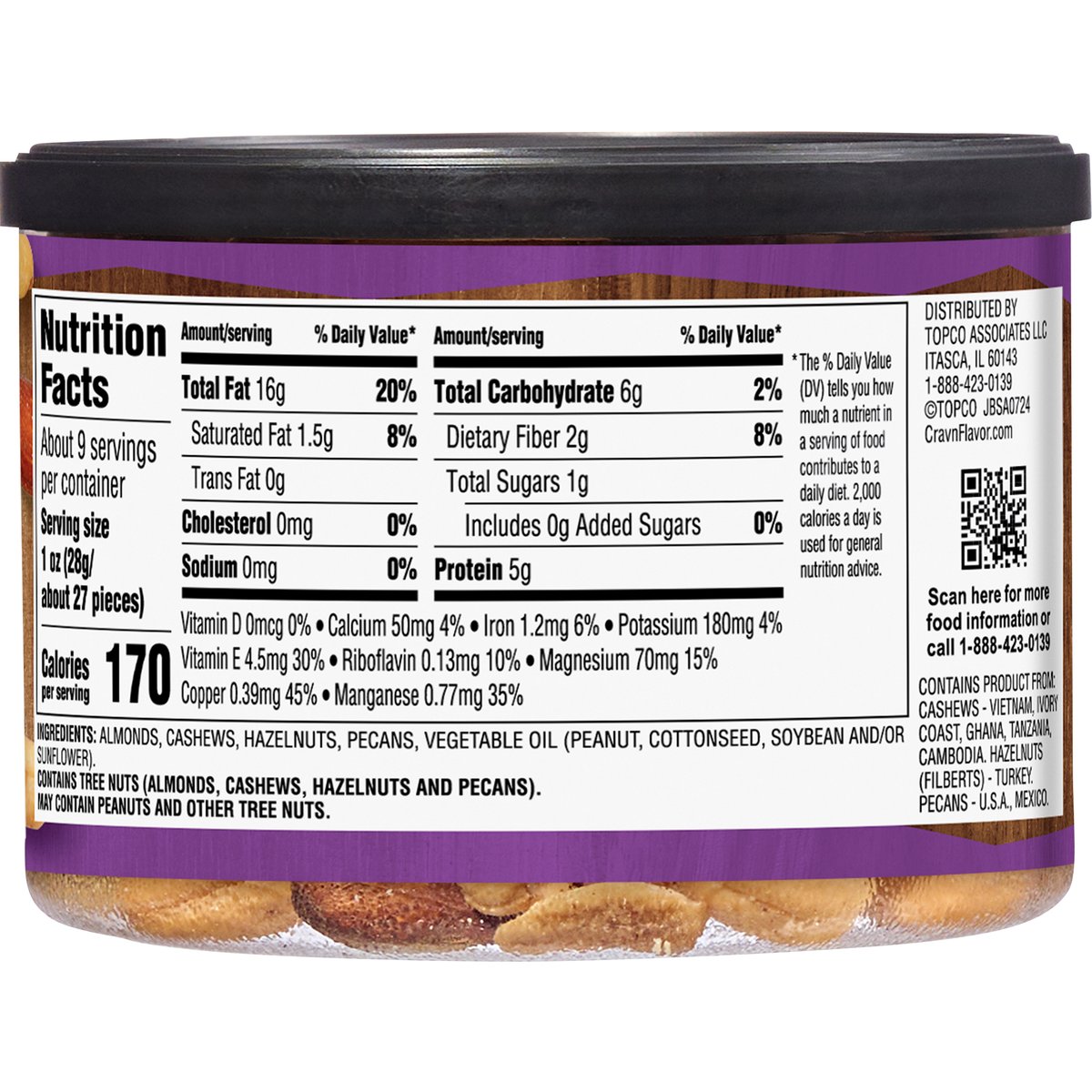 Deluxe mixed nuts with almonds, cashews, hazelnuts & pecans. Good source of 5 vitamins & minerals. See nutrition information for fat content. No preservatives. Quality Guaranteed: If for any reason you are not satisfied, we'll give you a full refund. CravnFlavor.com. Scan for more food information or call 1-888-423-0139. 1-888-423-0139. Recycle. Renew. Reduce. Re-use. Contains Product from: Cashews - Vietnam, Ivory Coast, Ghana, Tanzana, Cambodia. Hazelnuts (filberts) - Turkey. Pecans - U.S.A., Mexico.