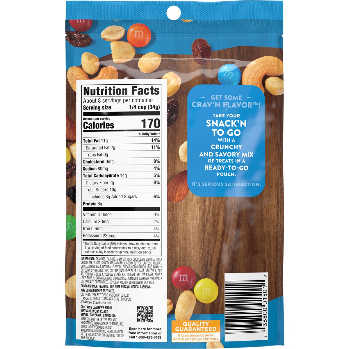 Peanuts, raisins, M&M's milk chocolate candies, almonds & cashews. No artificial flavors. Get some Crav'n Flavor! Take your snack'n to go with a crunchy and savory mix of treats in a ready-to-go pouch. It's serious satisfaction. Quality Guaranteed: If for any reason you are not satisfied, we'll give you a full refund. CravnFlavor.com. Scan for more food information or call 1-888-423-0139. 1-888-423-0139. Resealable. Contains cashews from Vietnam, Ivory Coast, Ghana, Tanzania, Cambodia.