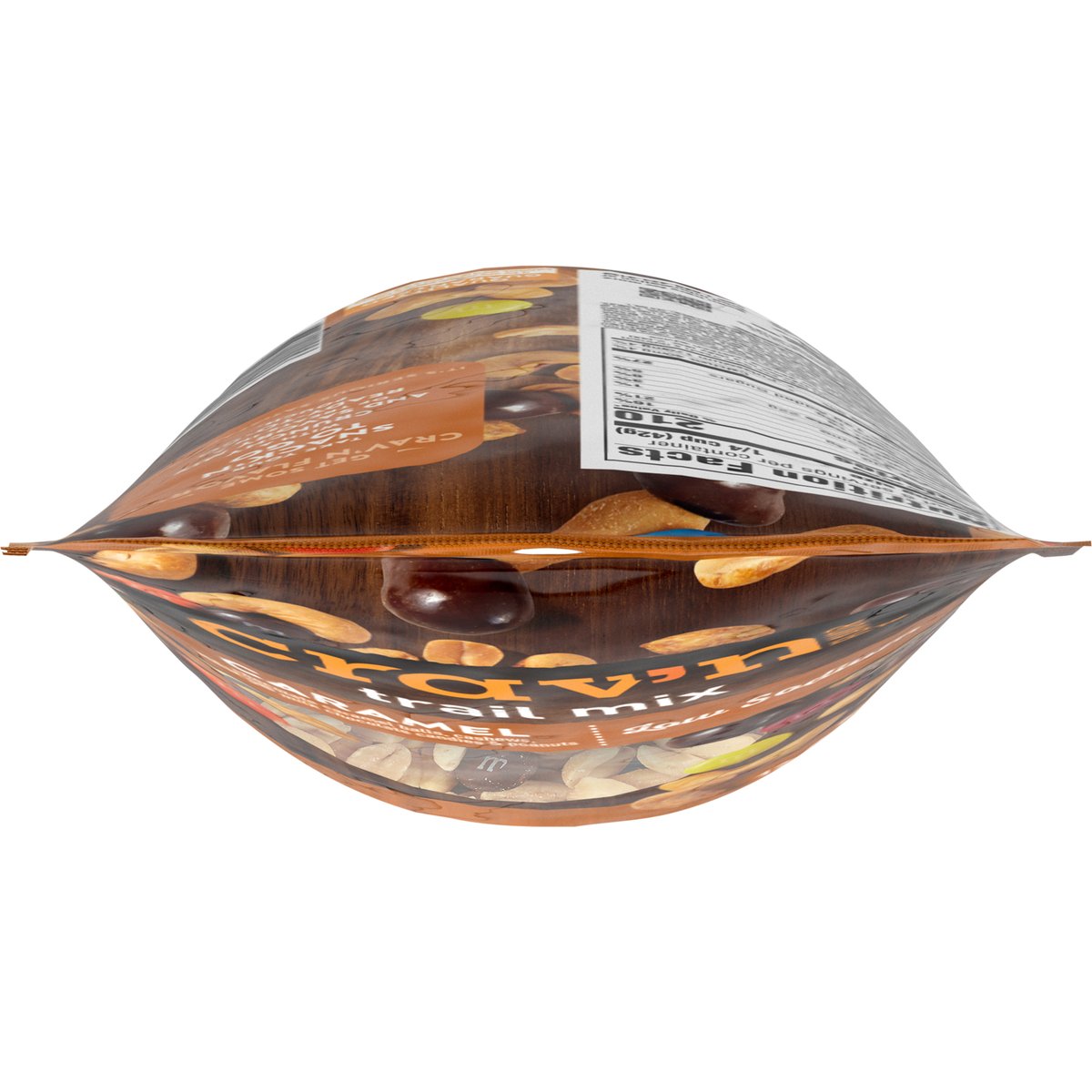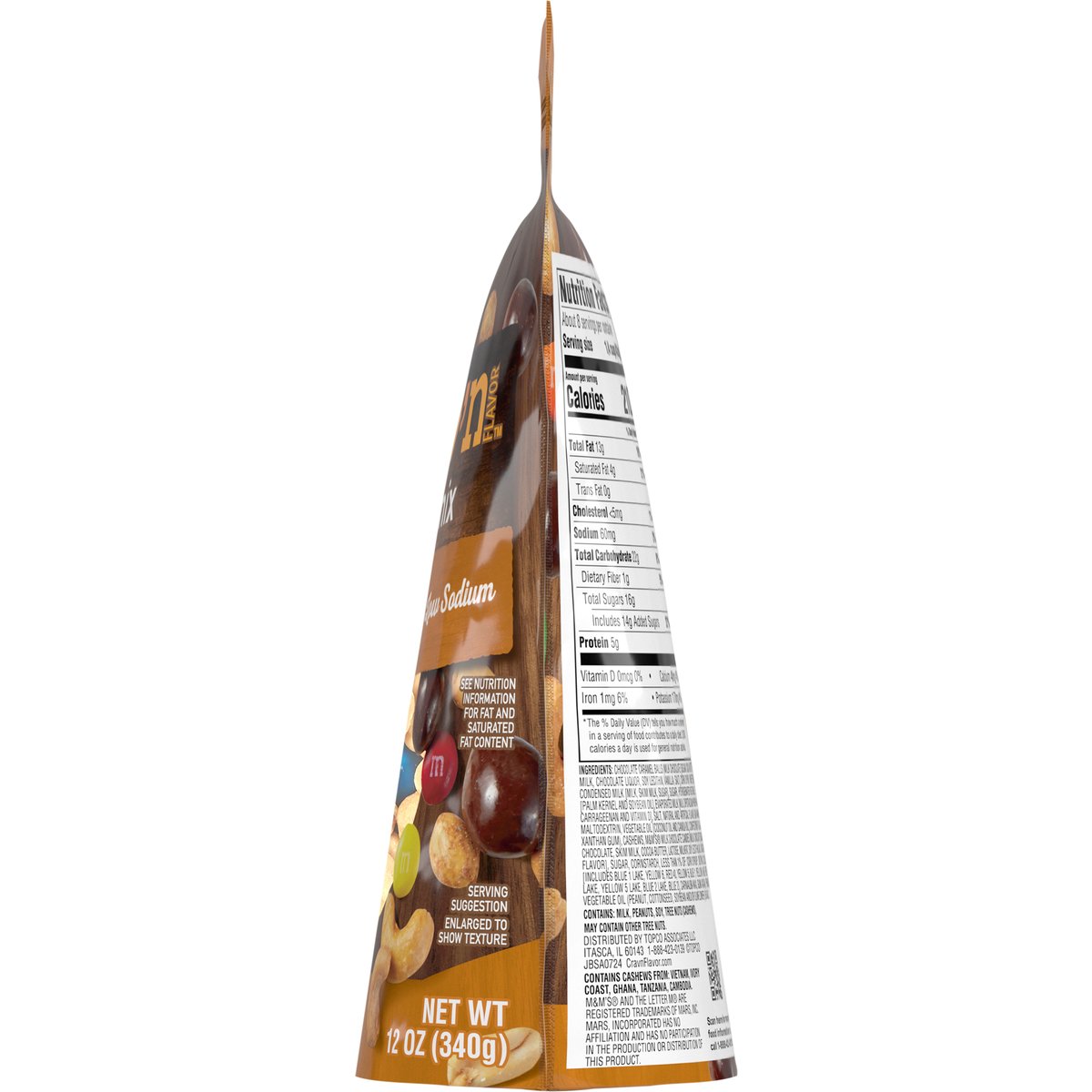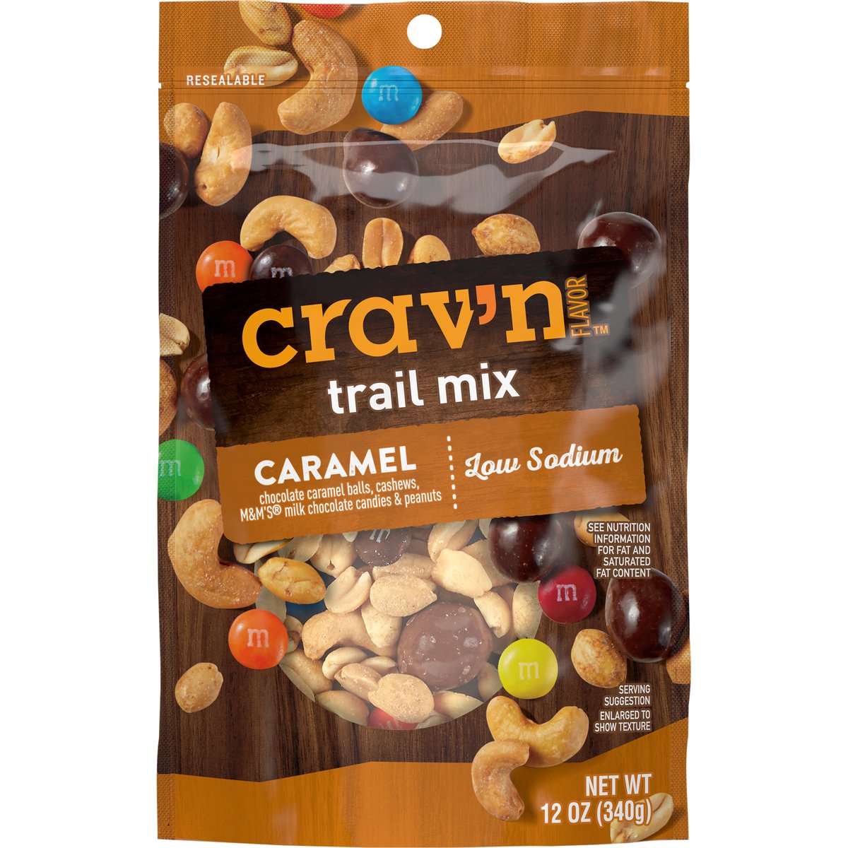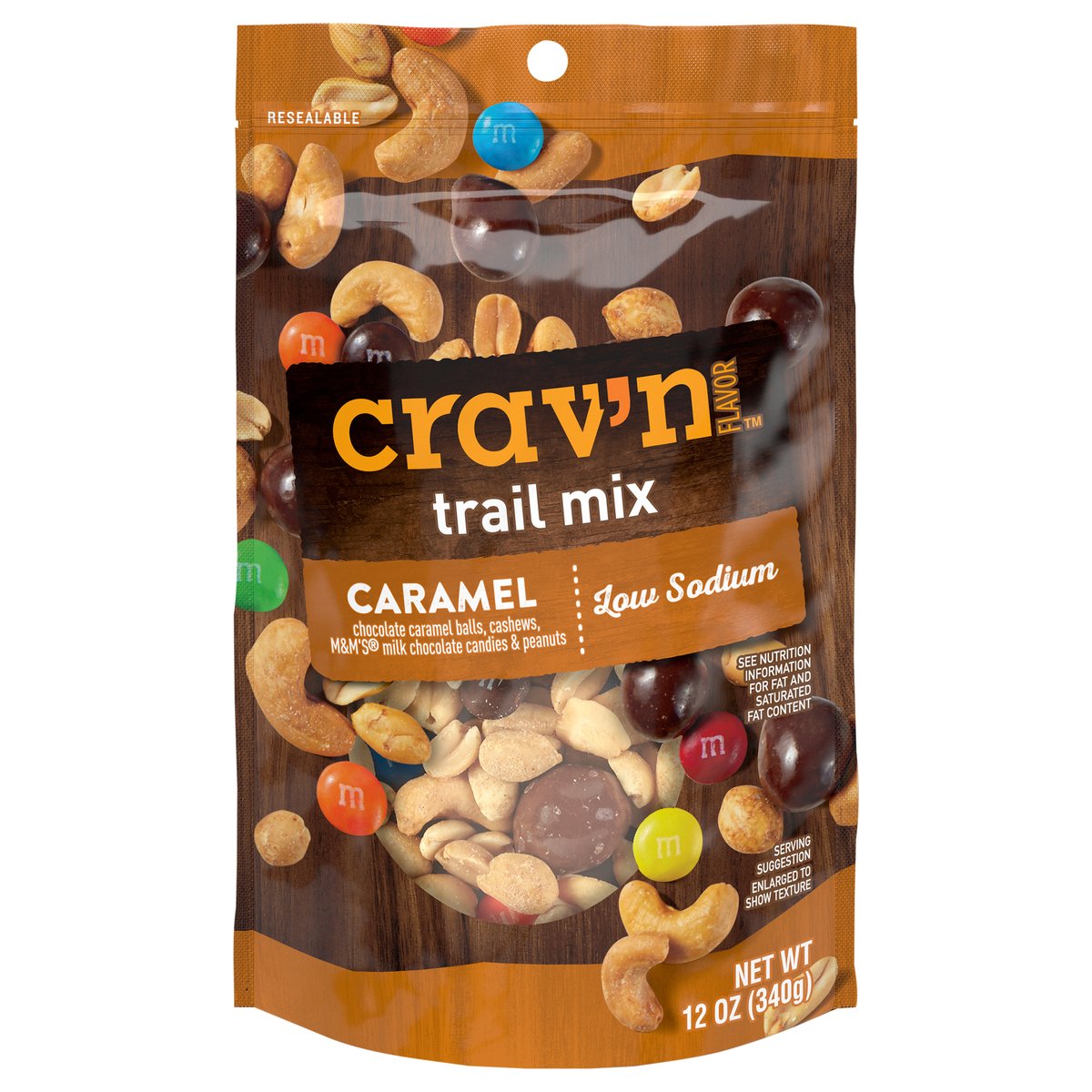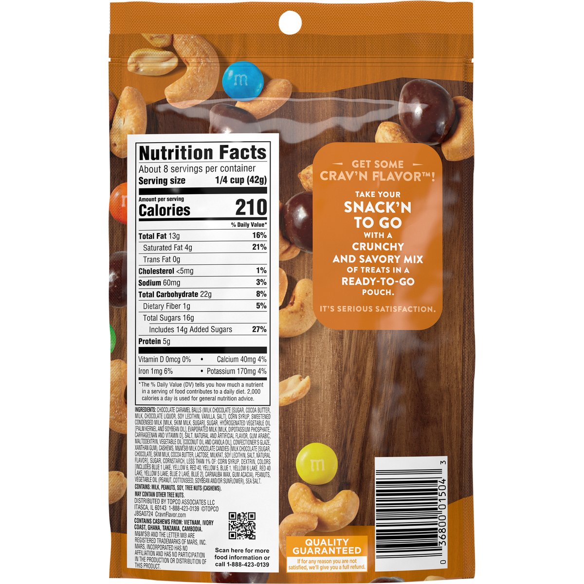 Chocolate caramel balls, cashews, M&M's milk chocolate candies & peanuts. Low sodium. See nutrition information for fat and saturated fat content. Get some Crav'n Flavor! Take your snack'n to go with a crunchy and savory mix of treats in a ready-to-go pouch. It's serious satisfaction. Quality Guaranteed: If for any reason you are not satisfied, we'll give you a full refund. CravnFlavor.com. Scan for more food information or call 1-888-423-0139. 1-888-423-0139. Resealable. Contains Cashews from: Vietnam, Ivory Coast, Ghana, Tanzania, Cambodia.