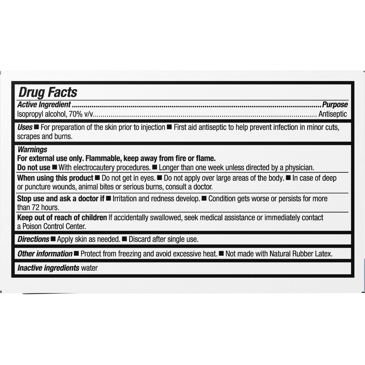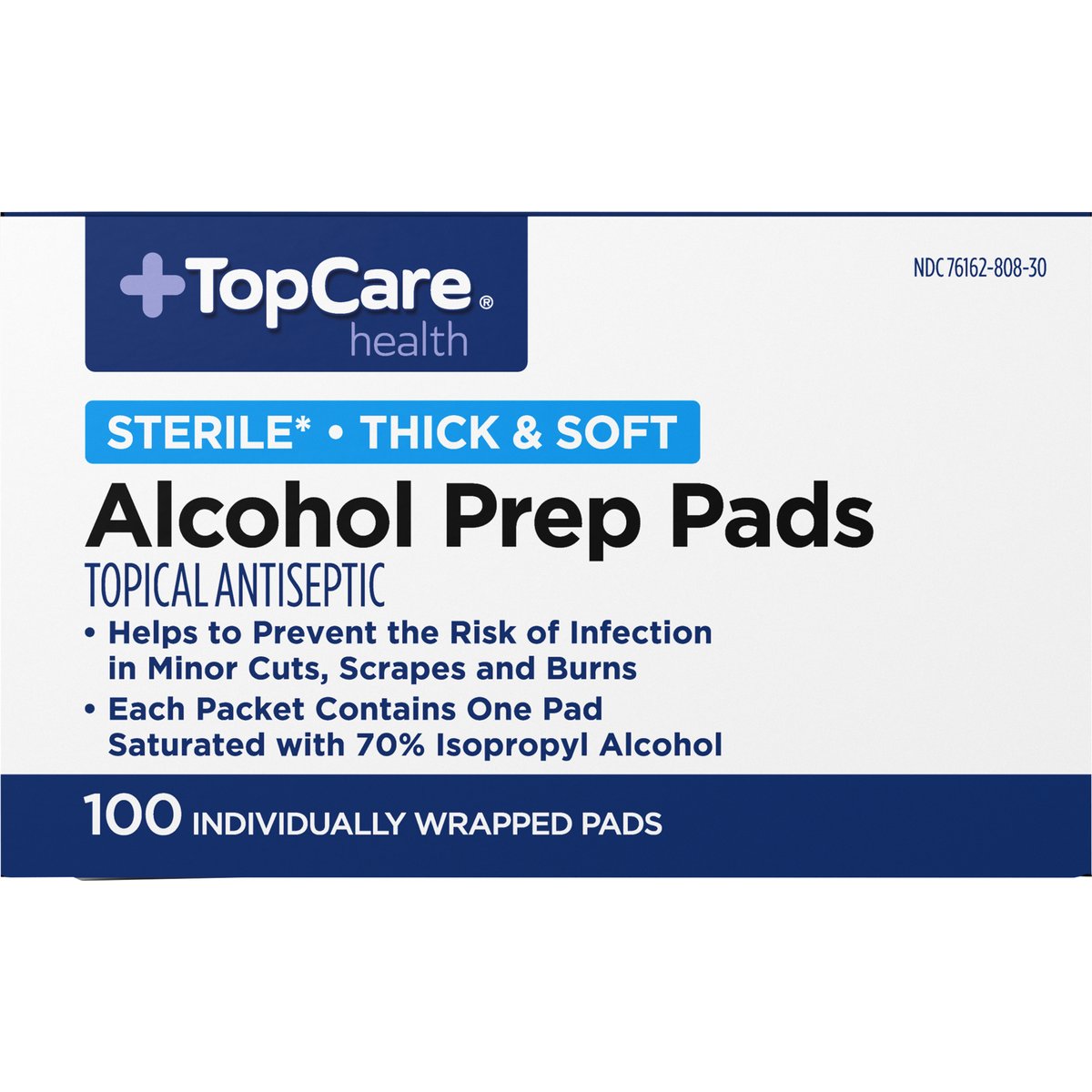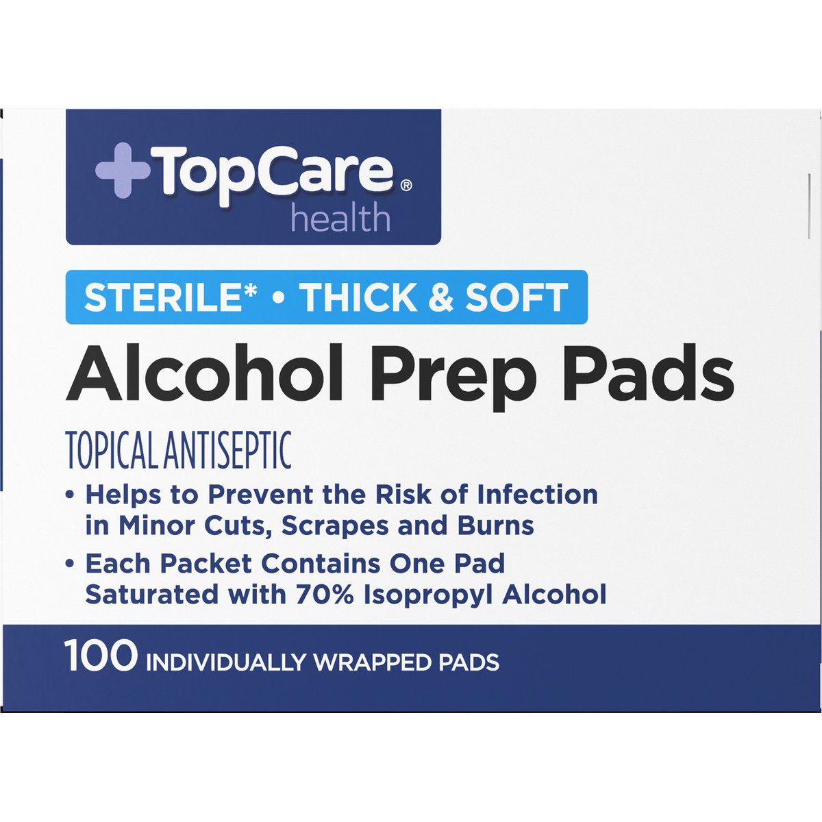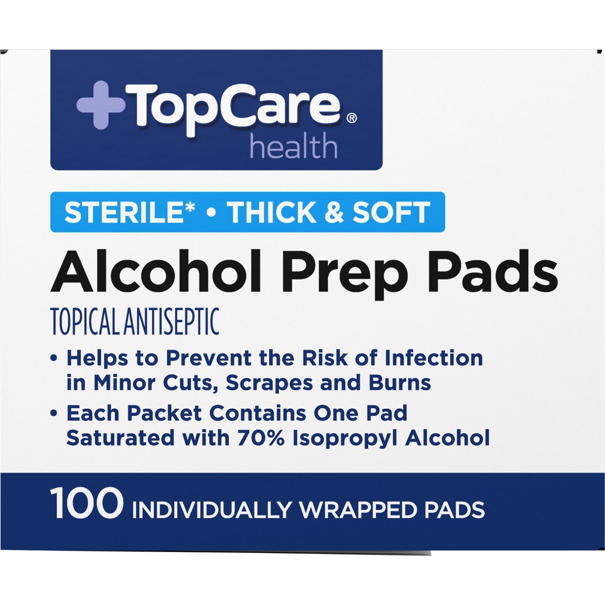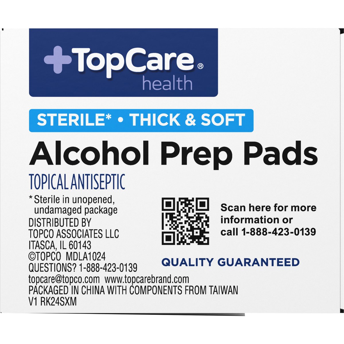 Other Information: Protect from freezing and avoid excessive heat. Not made with natural rubber latex. Topical antiseptic. Sterile*. Helps to prevent the risk of infection in minor cuts, scrapes and burns. Each packet contains one pad saturated with 70% isopropyl alcohol. * Sterile in unopened, undamaged package. Quality guaranteed. www.topcarebrand.com. Scan for more information or call 1-888-423-0139. Questions? 1-888-423-0139. topcare@topco.com. www.topcarebrand.com. Packaged in China with components from Taiwan.