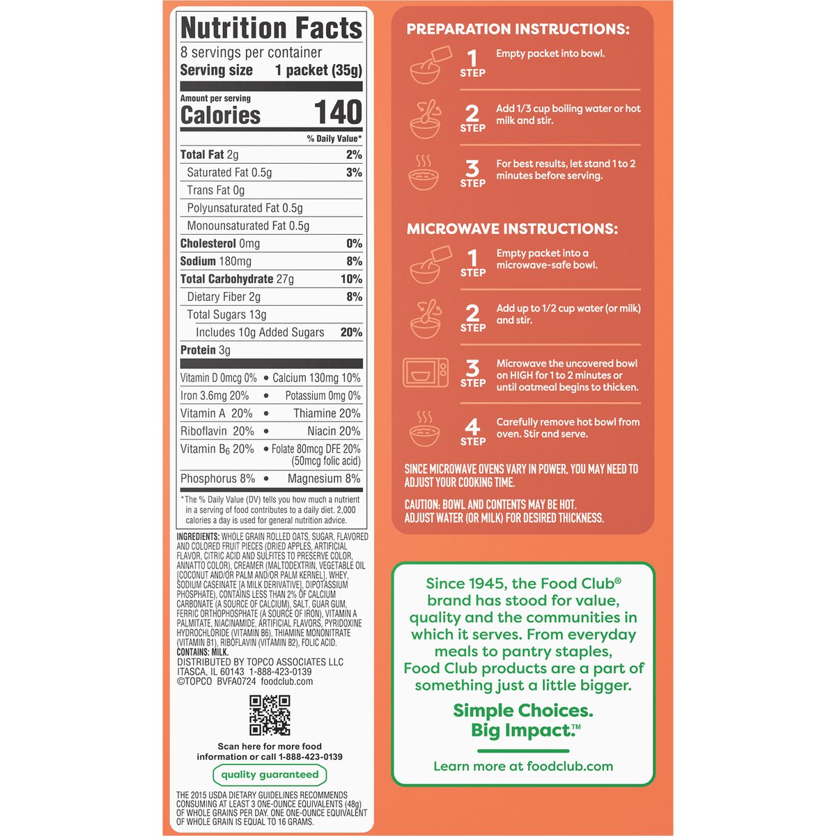 Artificially flavored. 100% Whole Grain: 19 g or more per serving. 100% of the grain is whole grain. WholeGrainsCouncil.org. The 2015 USDA dietary guidelines recommends consuming at least 3 one-ounce equivalents (48 g) of whole grains per day. One one-ounce equivalent of whole grain is equal to 16 grams. Excellent source of 7 vitamins & minerals. Good source of calcium. Since 1945, the Food Club brand has stood for value, quality and the communities in which it serves. From everyday meals to pantry staples, Food Club products are a part of something just a little bigger. Simple Choices. Big Impact. Quality guaranteed. foodclub.com. Scan for more food information or call 1-888-423-0139. Learn more at foodclub.com. 1-888-423-0139.